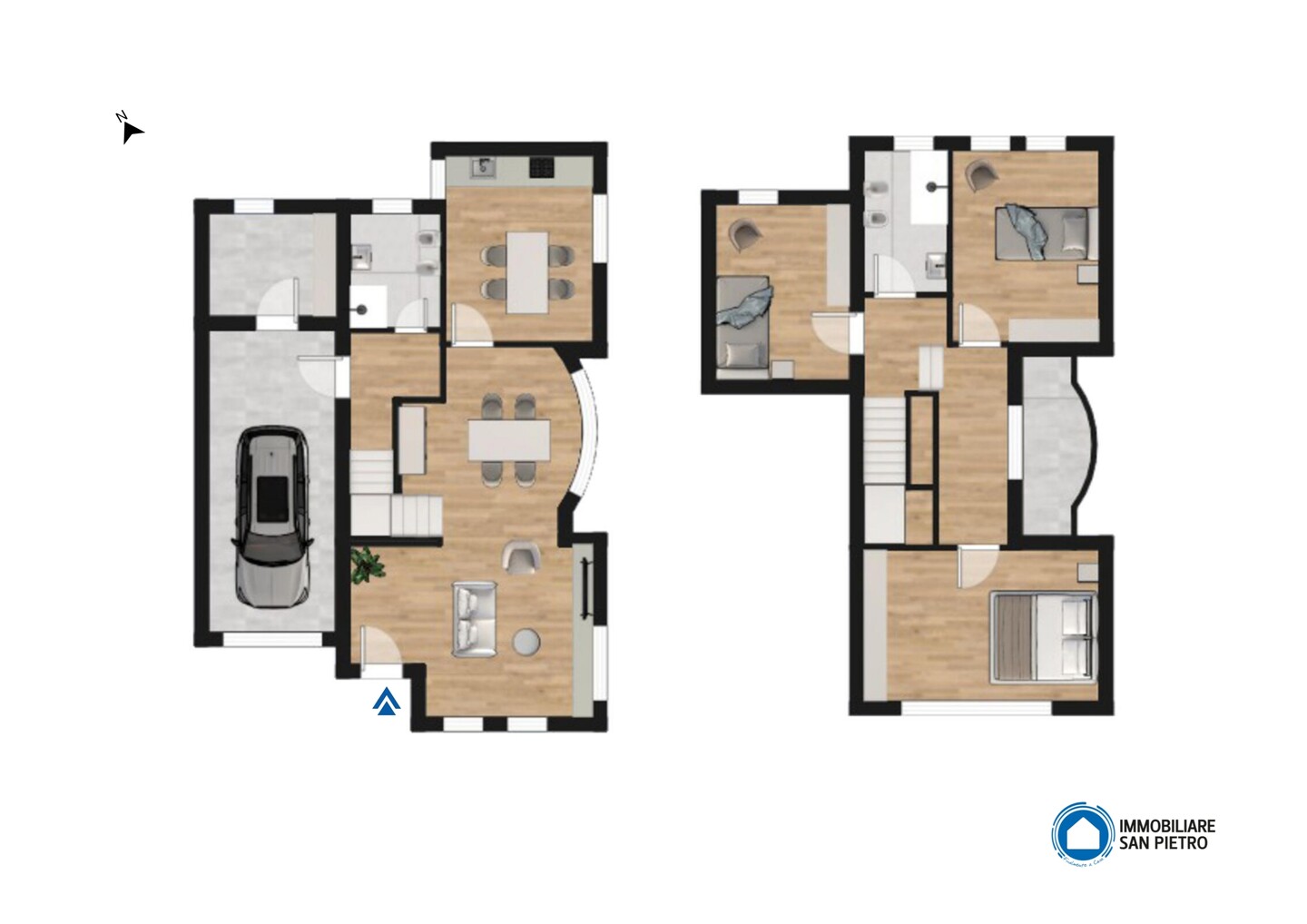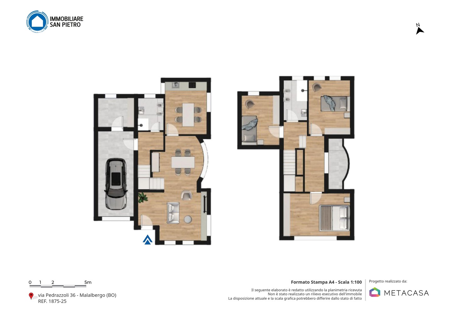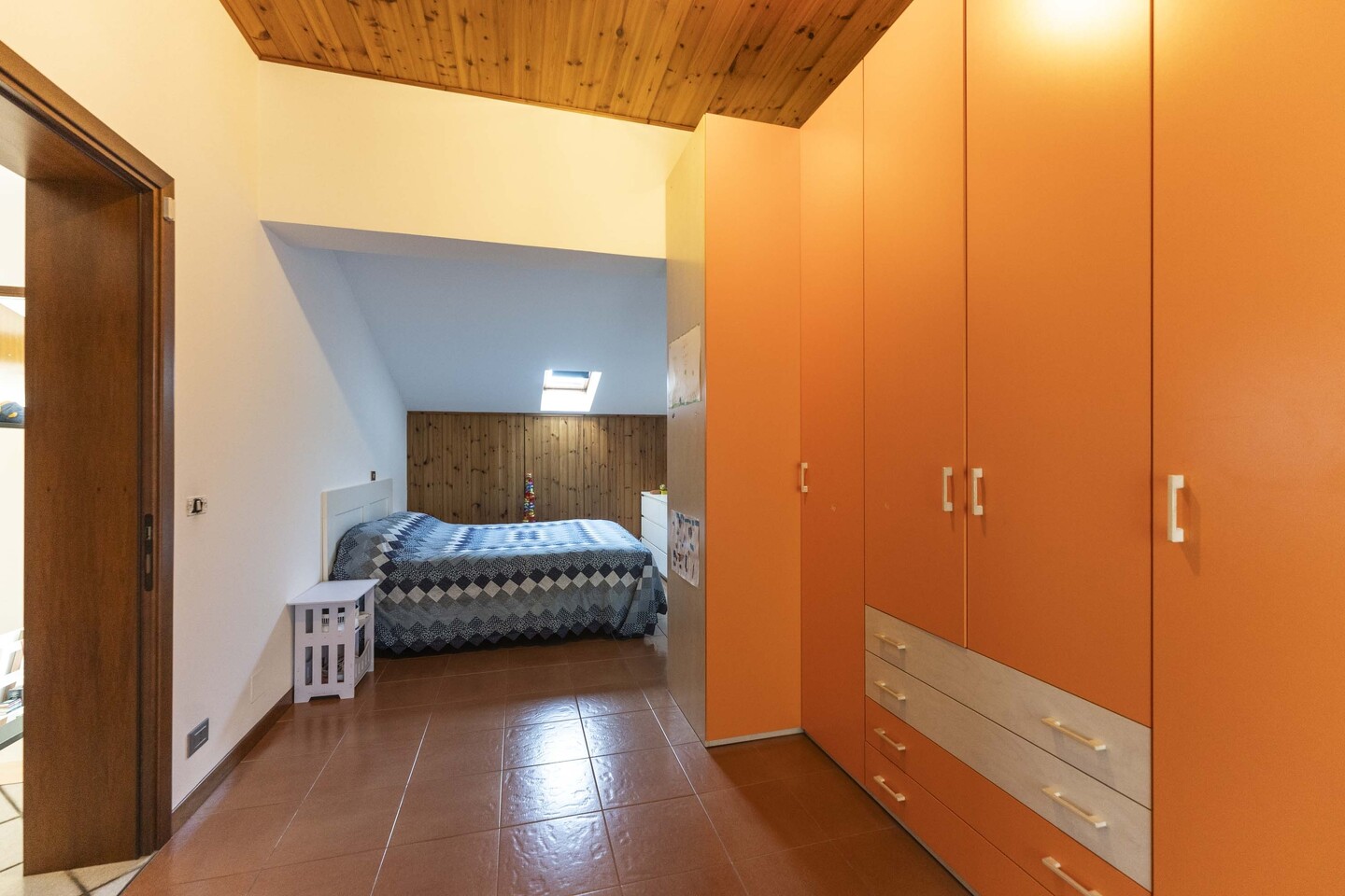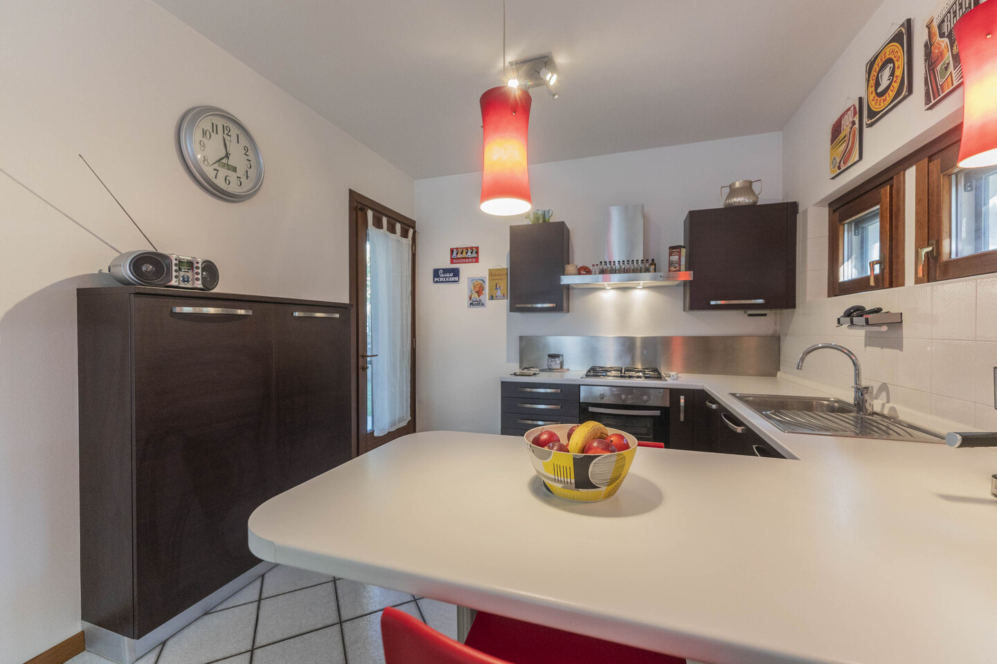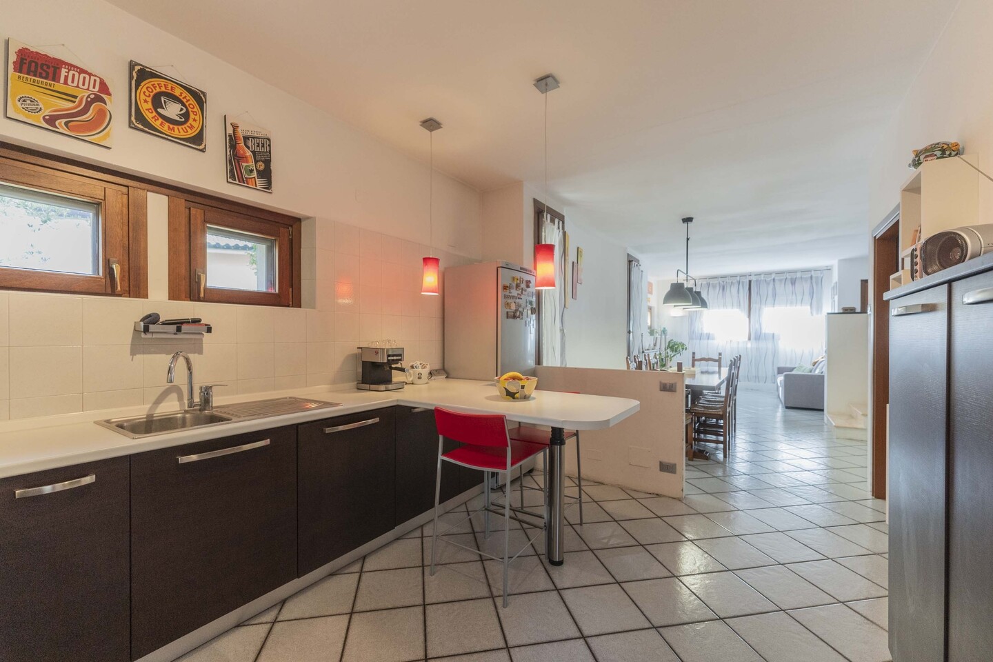L’immobile è sviluppato su due livelli e così composto: al piano terra troviamo il soggiorno con annessa sala da pranzo, cucina abitabile ed il primo bagno. Una scala conduce al secondo piano dove sono presenti 3 camere da letto (matrimoniale, doppia e singola) divise da un disimpegno dal quale è possibile accedere direttamente al balcone ed il secondo bagno. Completano la proprietà garage, cantina, posto auto scoperto, portico e giardino privato al pian terreno.