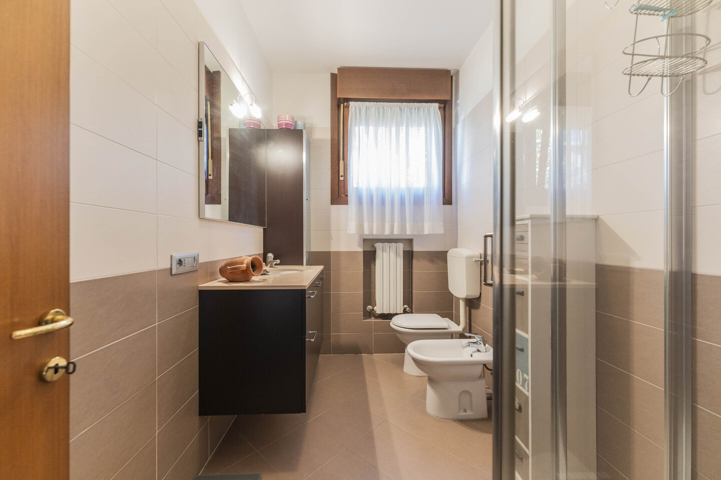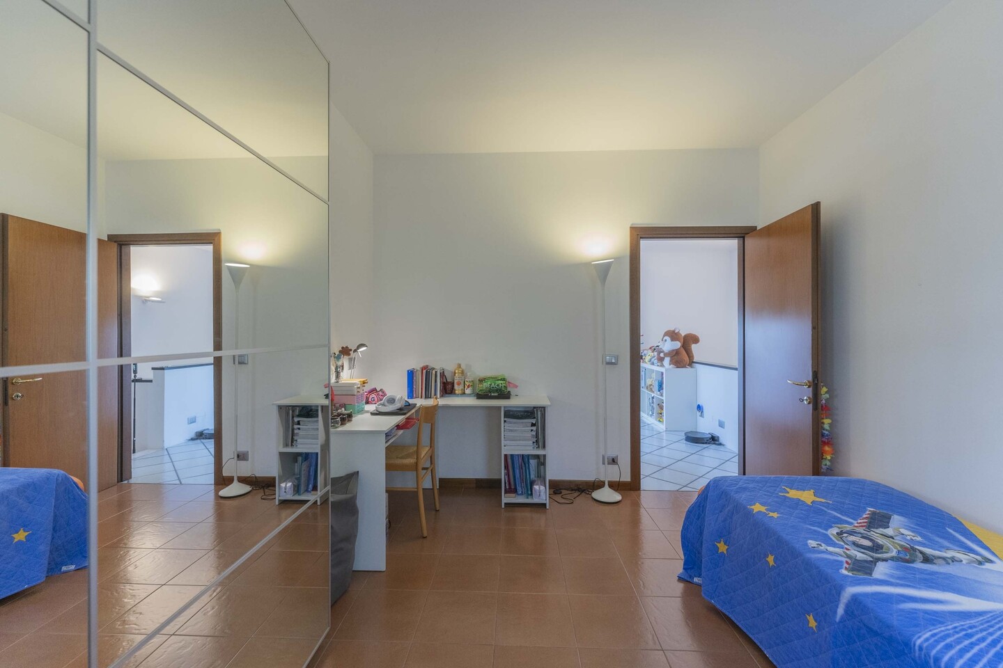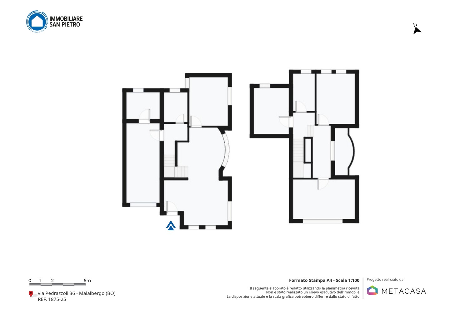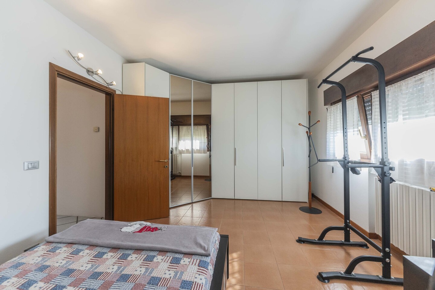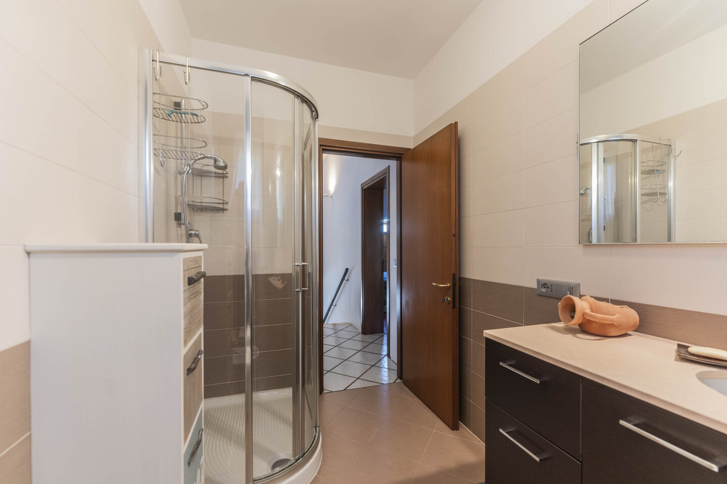 L’immobile è sviluppato su due livelli e così composto: al piano terra troviamo il soggiorno con annessa sala da pranzo, cucina abitabile ed il primo bagno. Una scala conduce al secondo piano dove sono presenti 3 camere da letto (matrimoniale, doppia e singola) divise da un disimpegno dal quale è possibile accedere direttamente al balcone ed il secondo bagno. Completano la proprietà garage, cantina, posto auto scoperto, portico e giardino privato al pian terreno.
