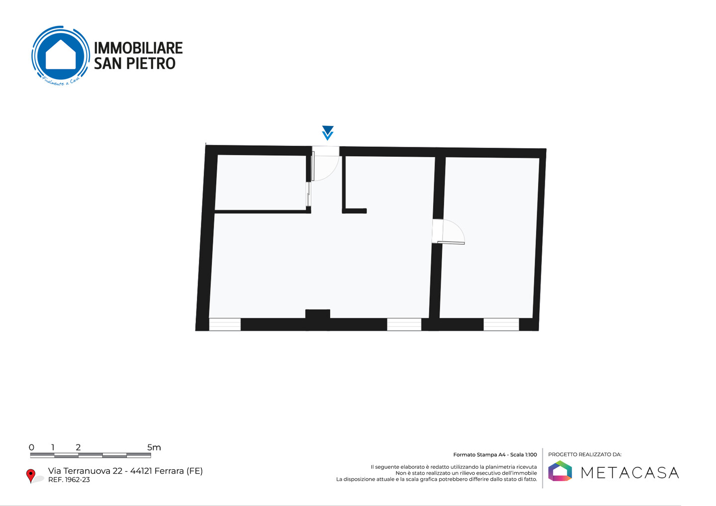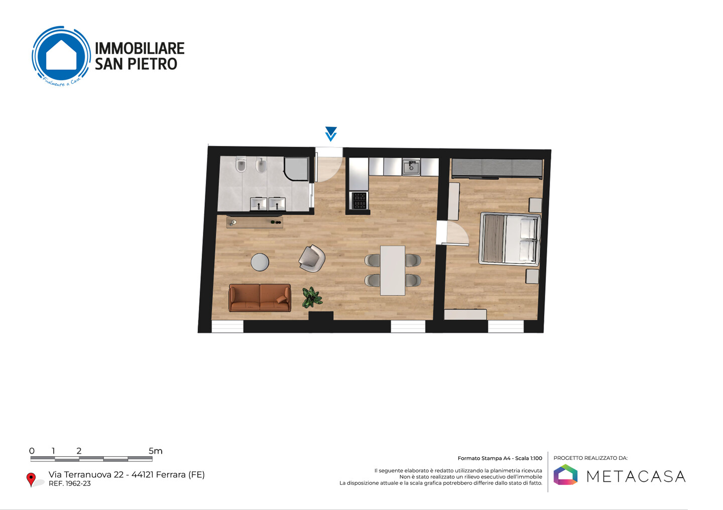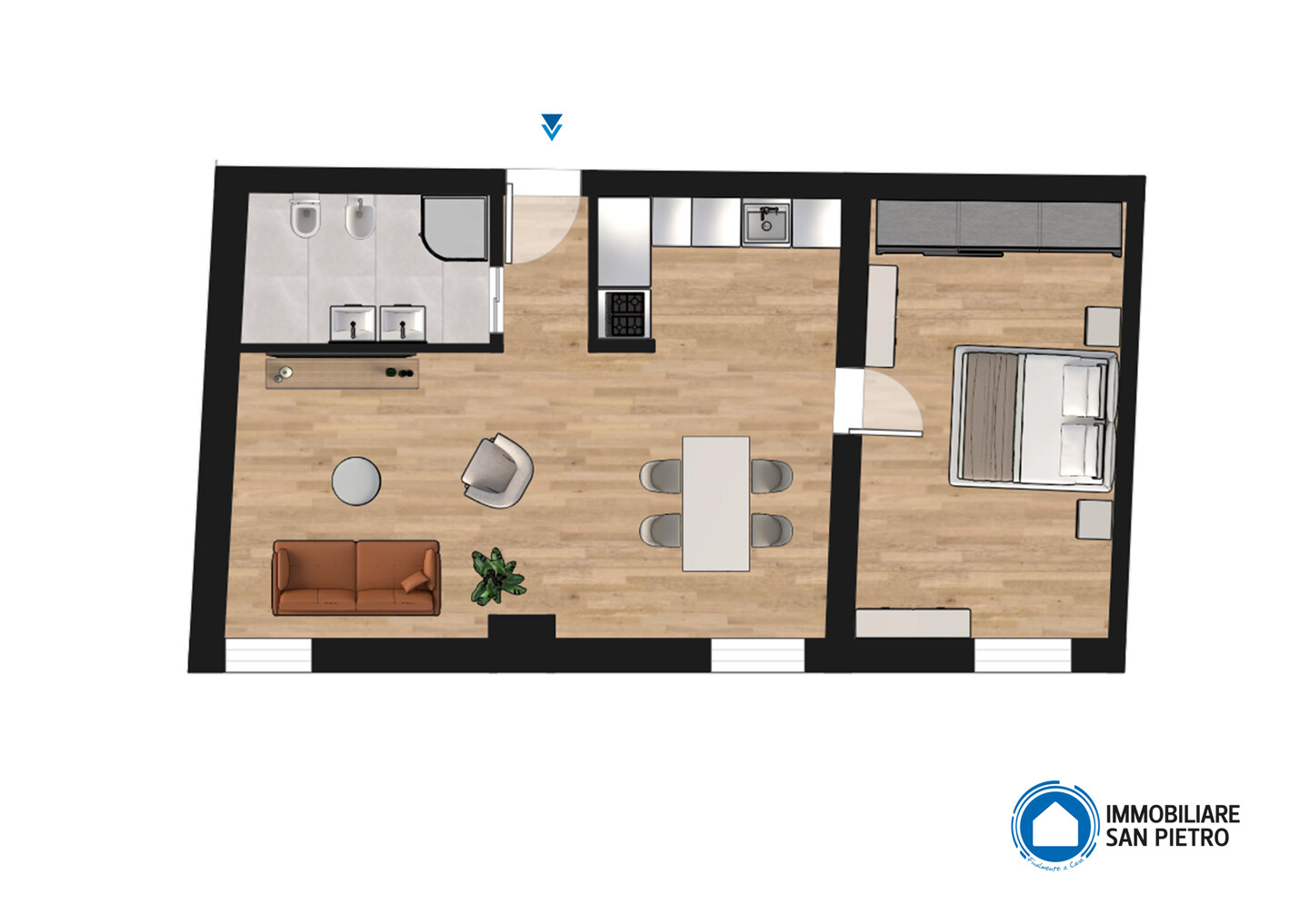Ingresso su disimpegno, soggiorno con angolo cottura, camera da letto matrimoniale e bagno.