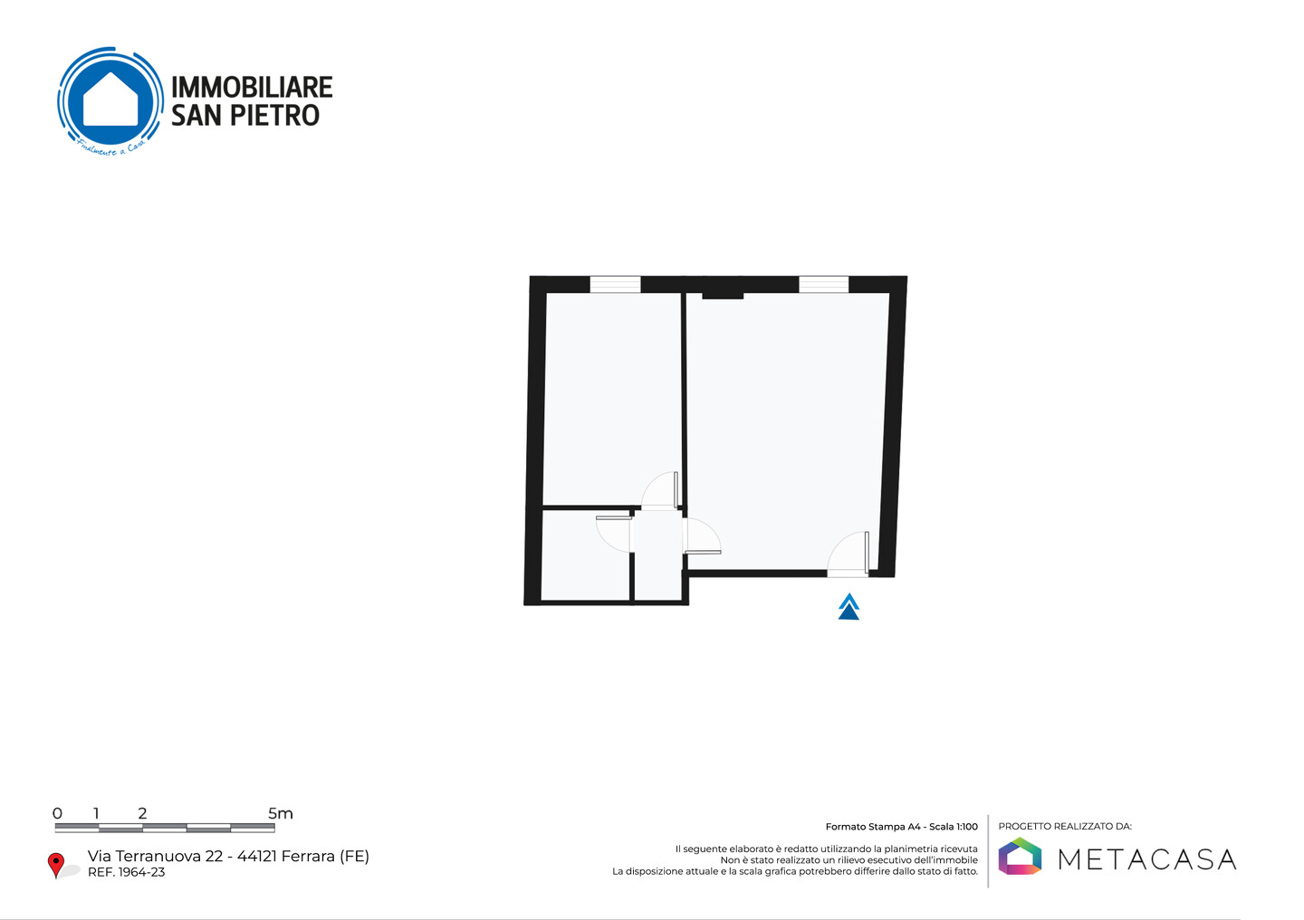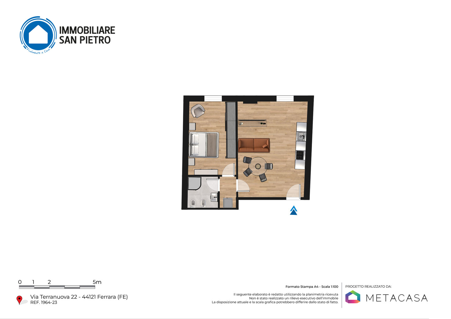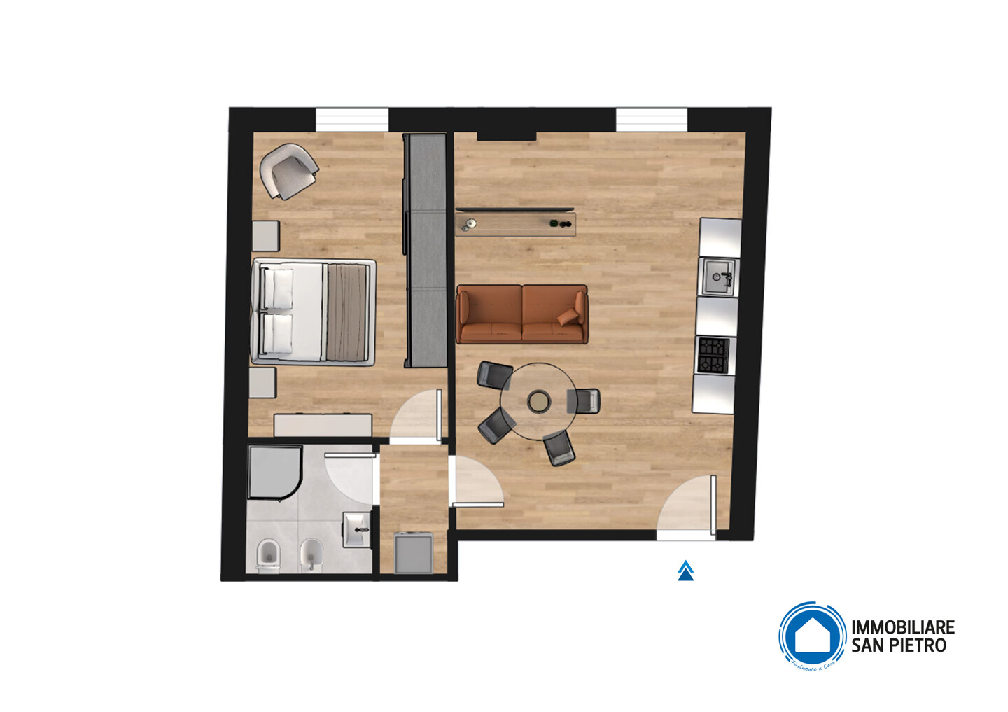 Ingresso su soggiorno con angolo cottura, disimpegno, camera da letto matrimoniale e bagno.