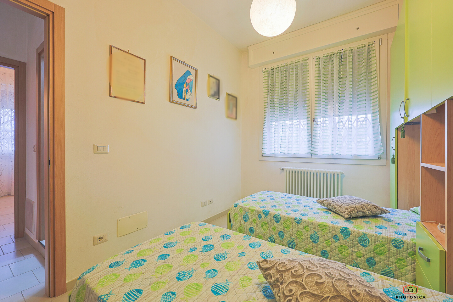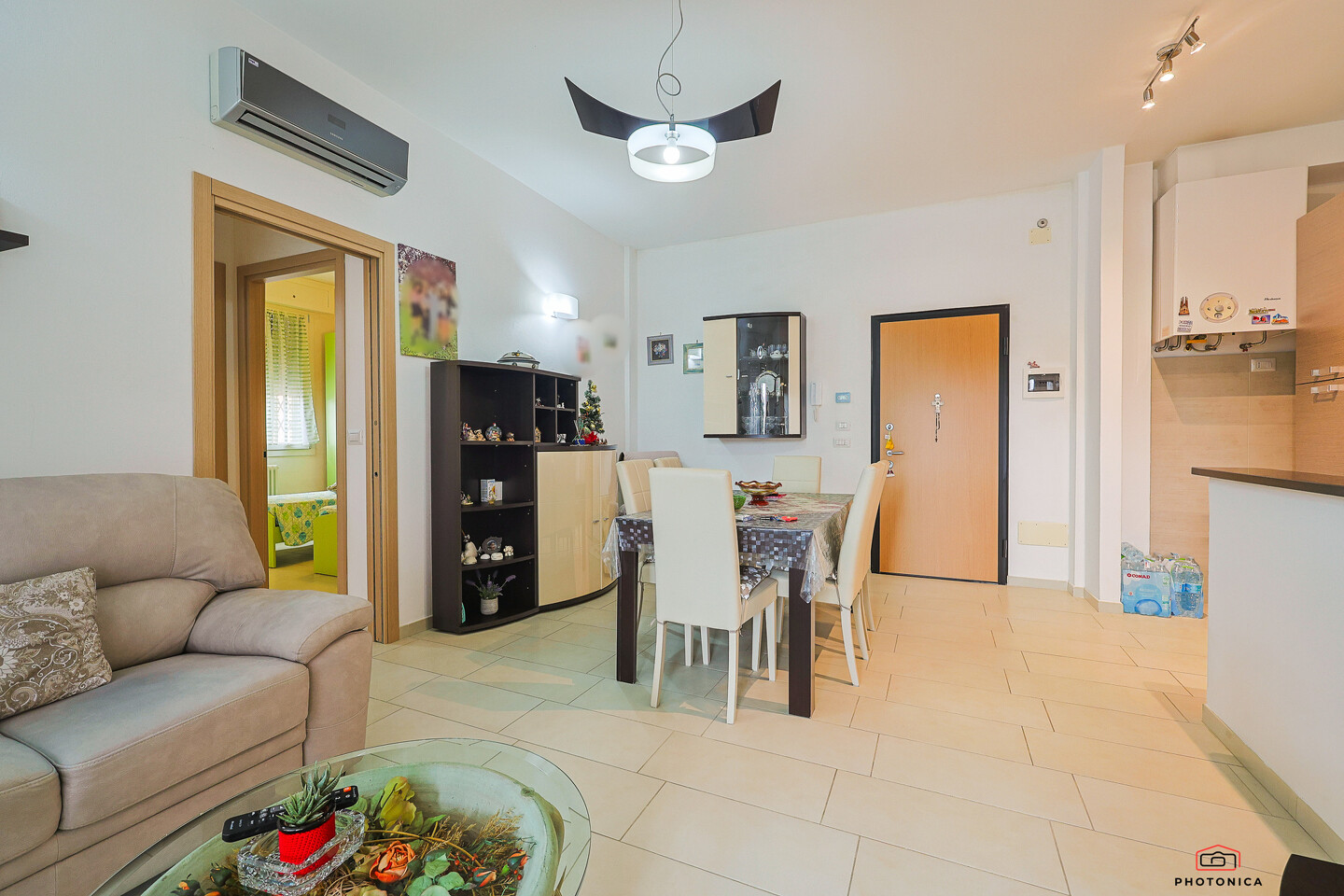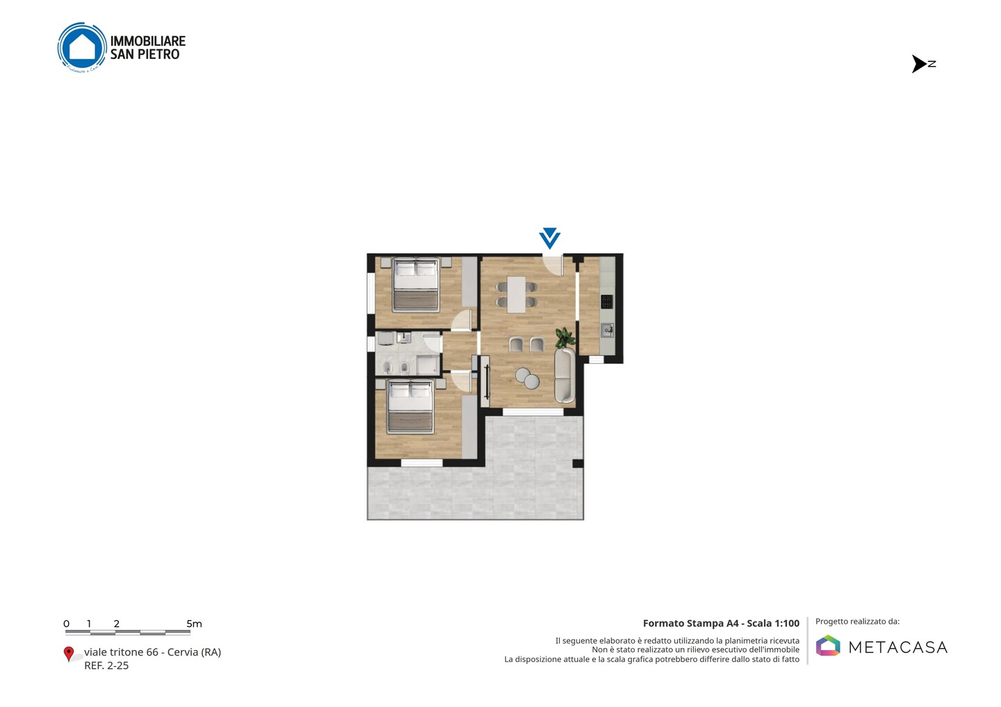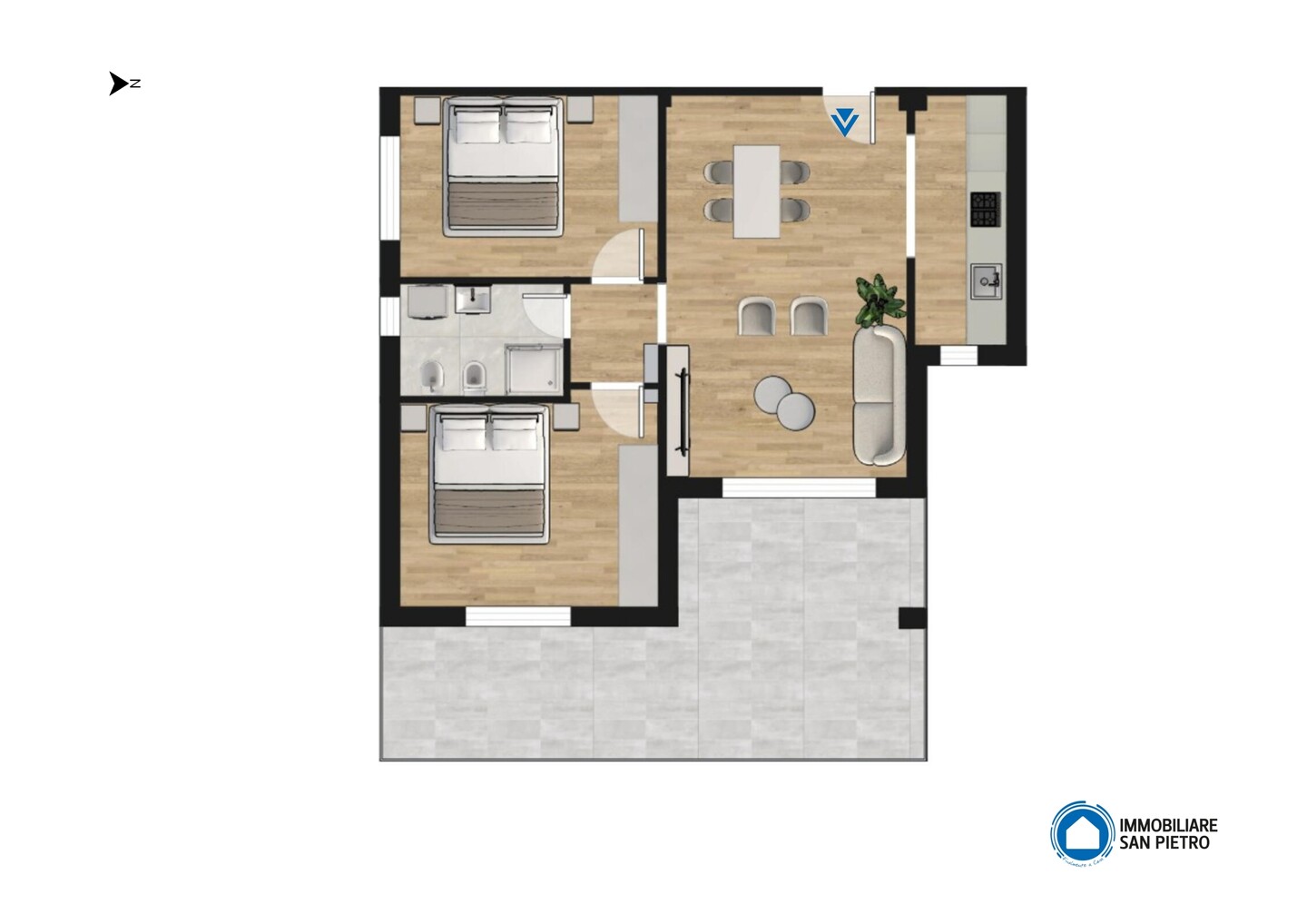 L’appartamento, disposto su un unico livello, offre spazi funzionali e ben organizzati: soggiorno con accesso a un ampio terrazzo loggiato, perfetto per momenti di relax all’aria aperta, un disimpegno, una camera matrimoniale, una camera doppia e un bagno finestrato con box doccia.