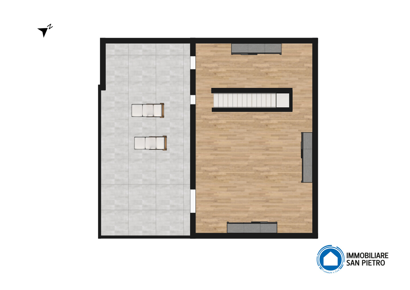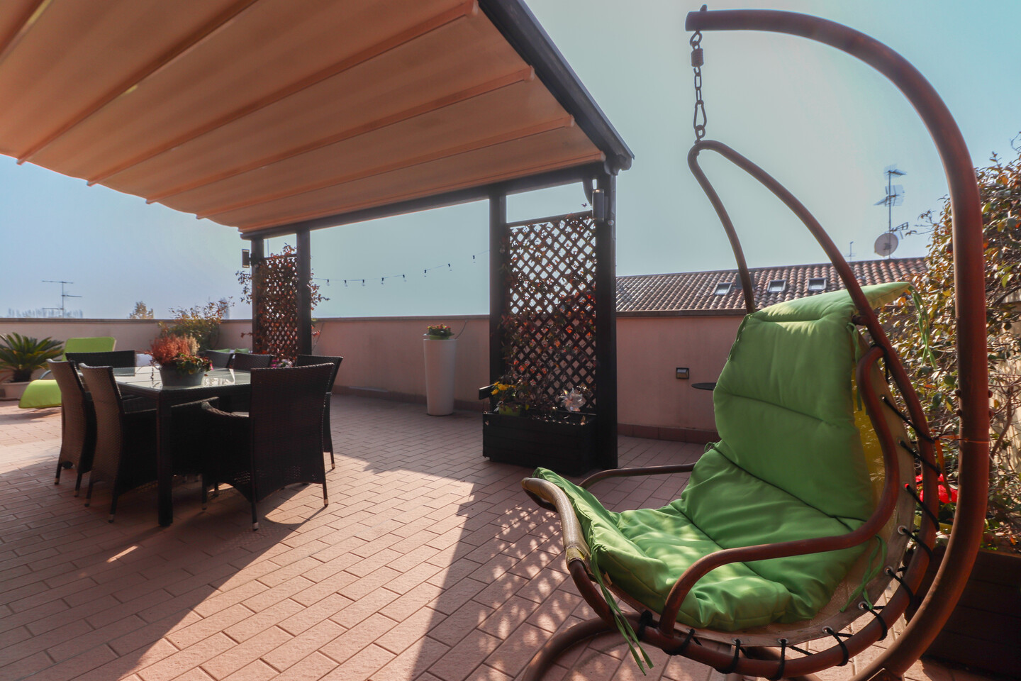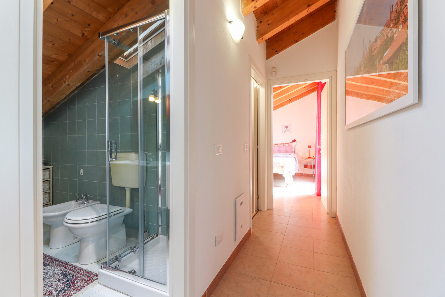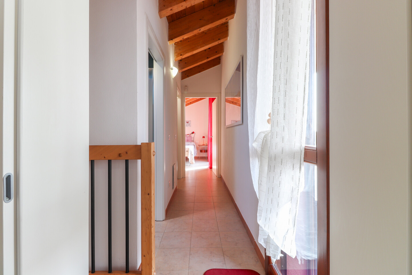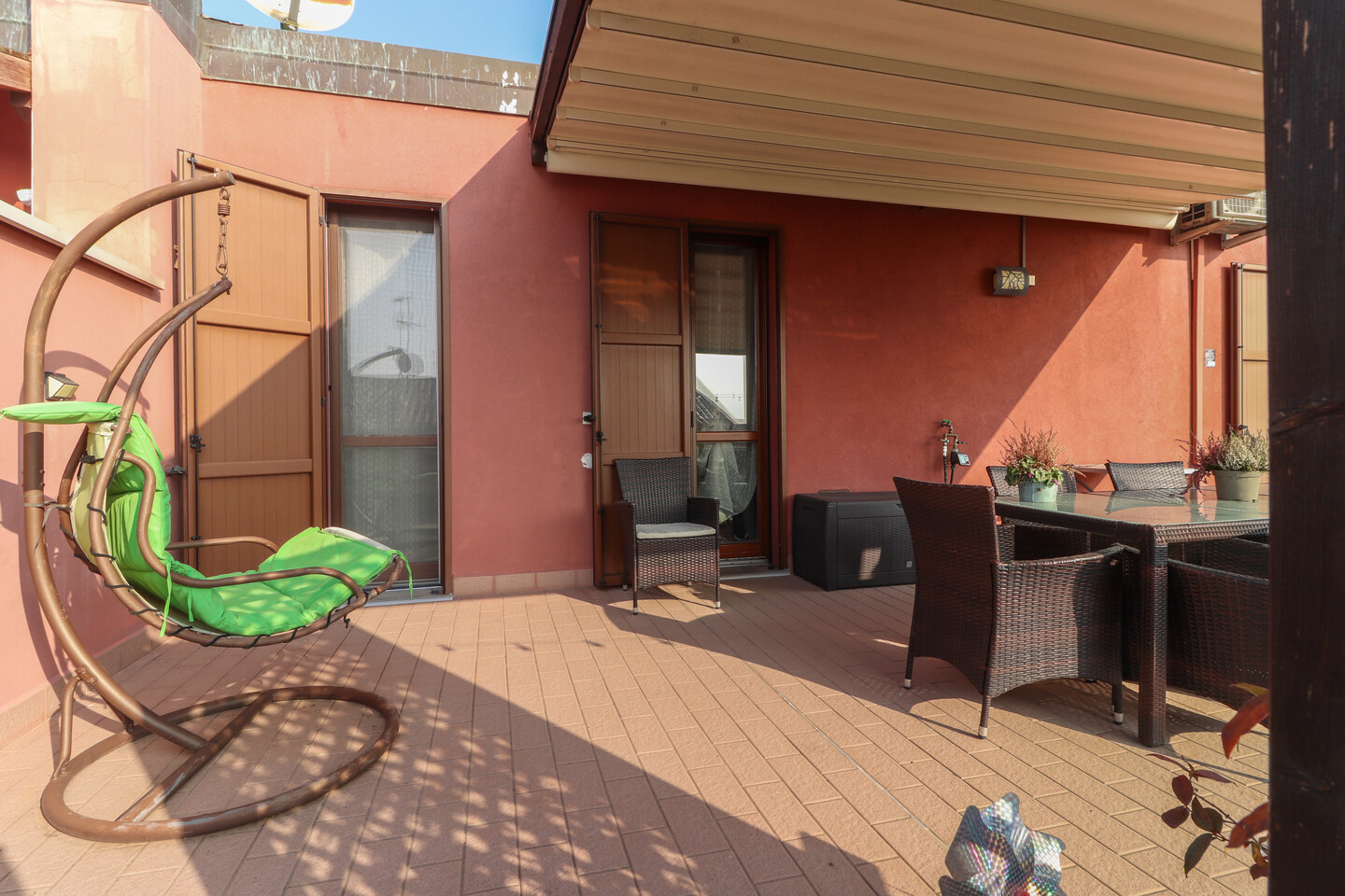 Ingresso su soggiorno con cucina a vista, accesso al primo terrazzo, disimpegno, bagno e ripostiglio; al piano superiore camera da letto matrimoniale, camera da letto singola e bagno, accesso ad un ulteriore terrazzo di 40 mq. A completare la proprietà cantina, garage.