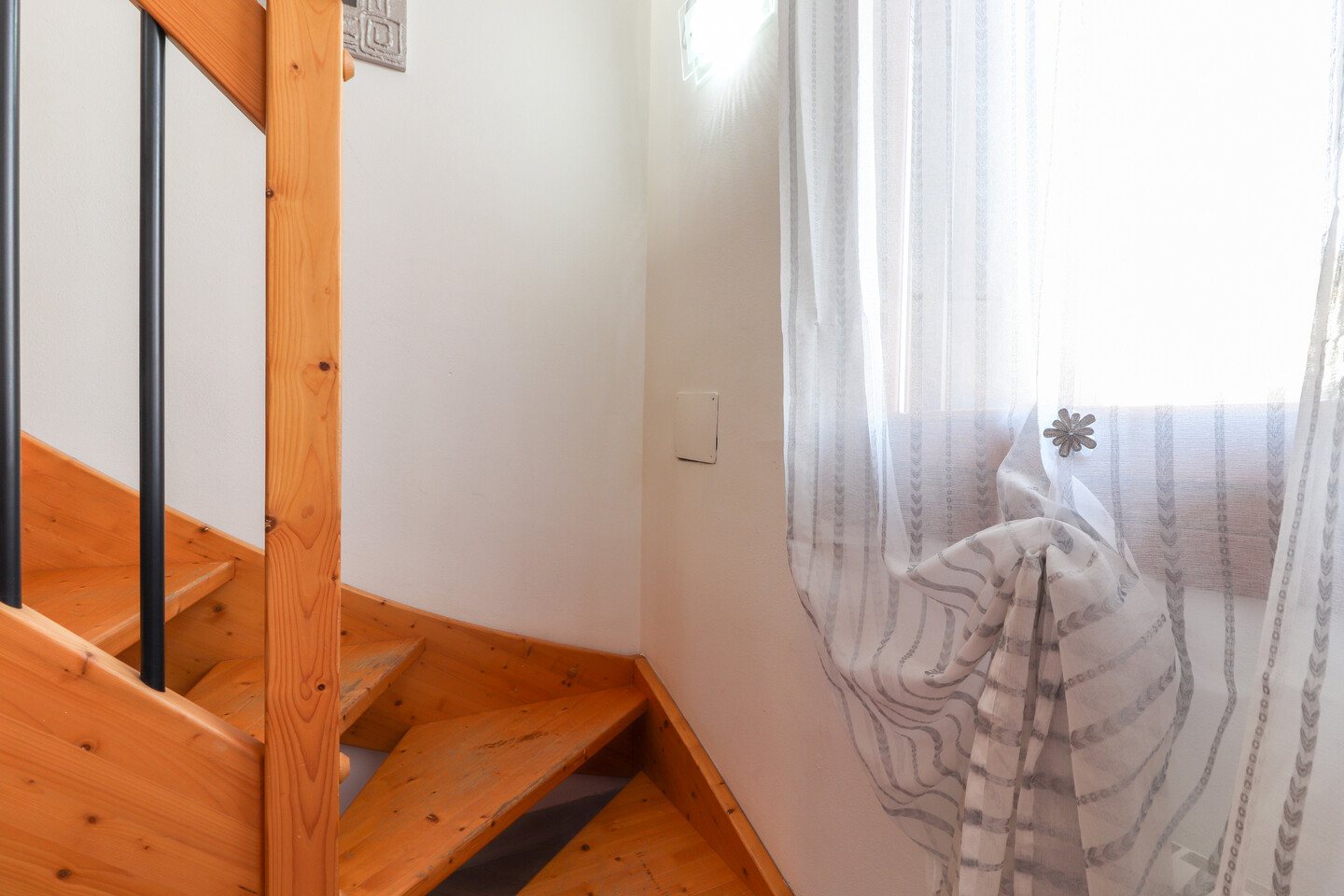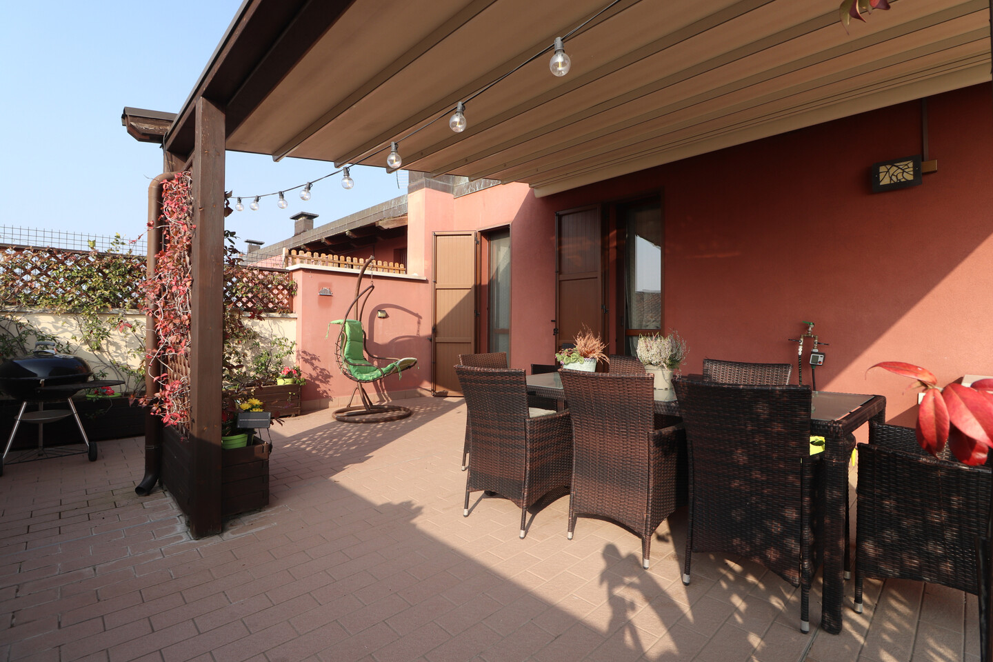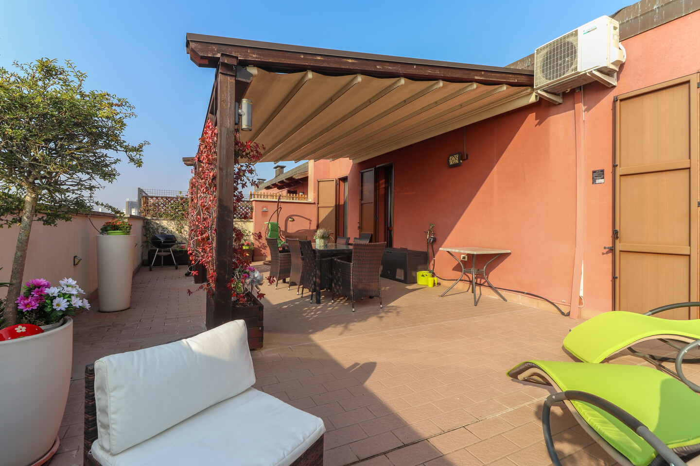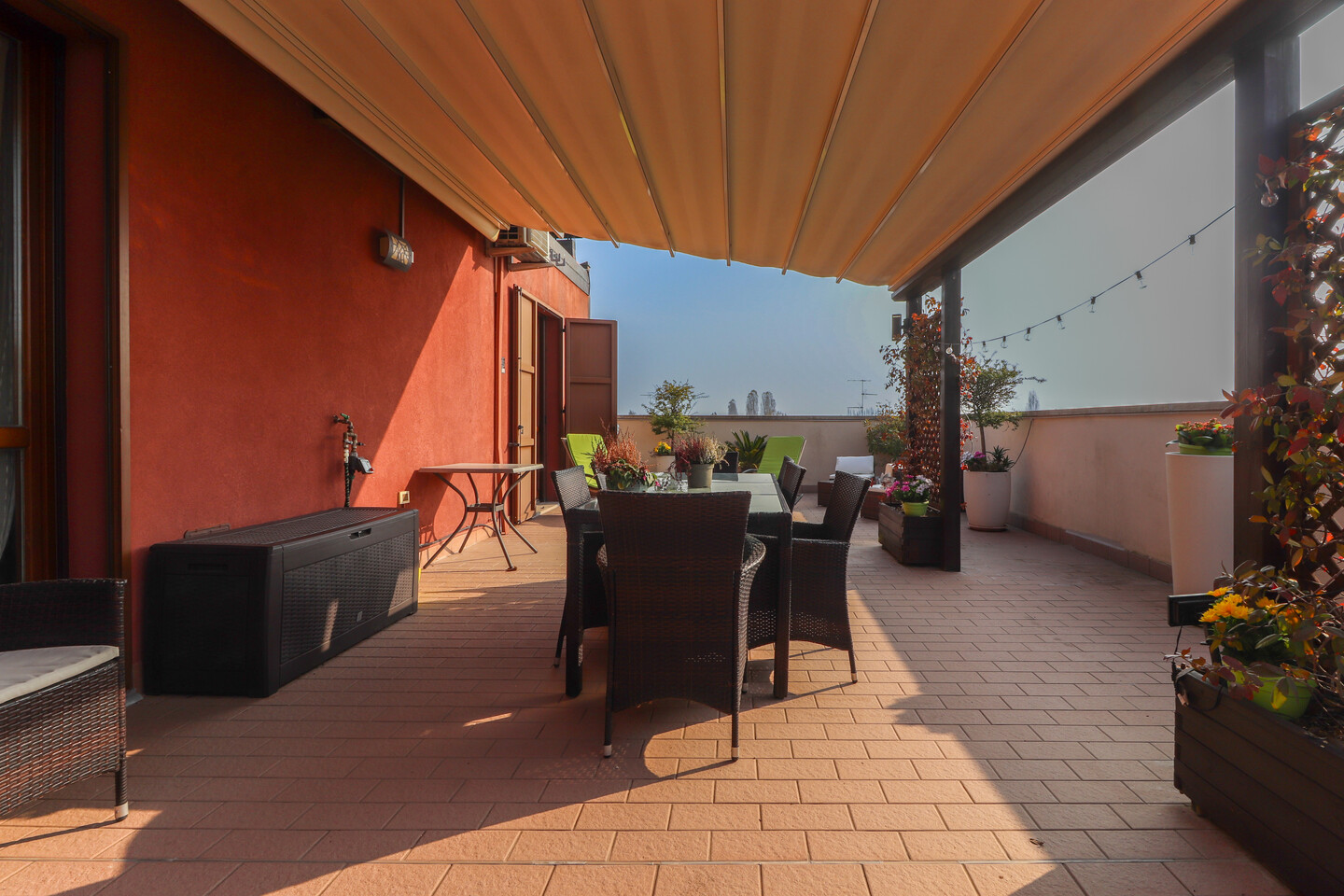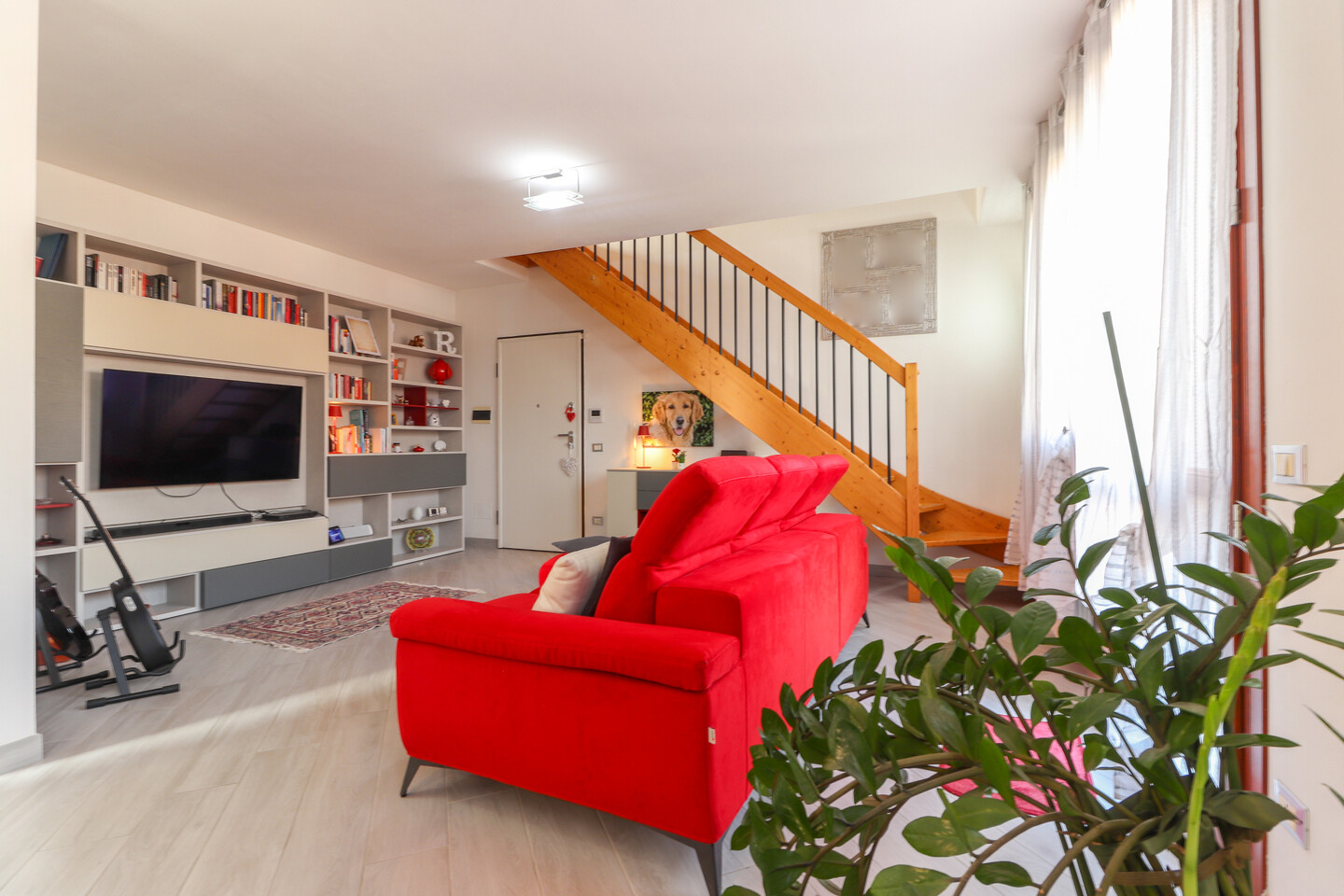 Ingresso su soggiorno con cucina a vista, accesso al primo terrazzo, disimpegno, bagno e ripostiglio; al piano superiore camera da letto matrimoniale, camera da letto singola e bagno, accesso ad un ulteriore terrazzo di 40 mq. A completare la proprietà cantina, garage.