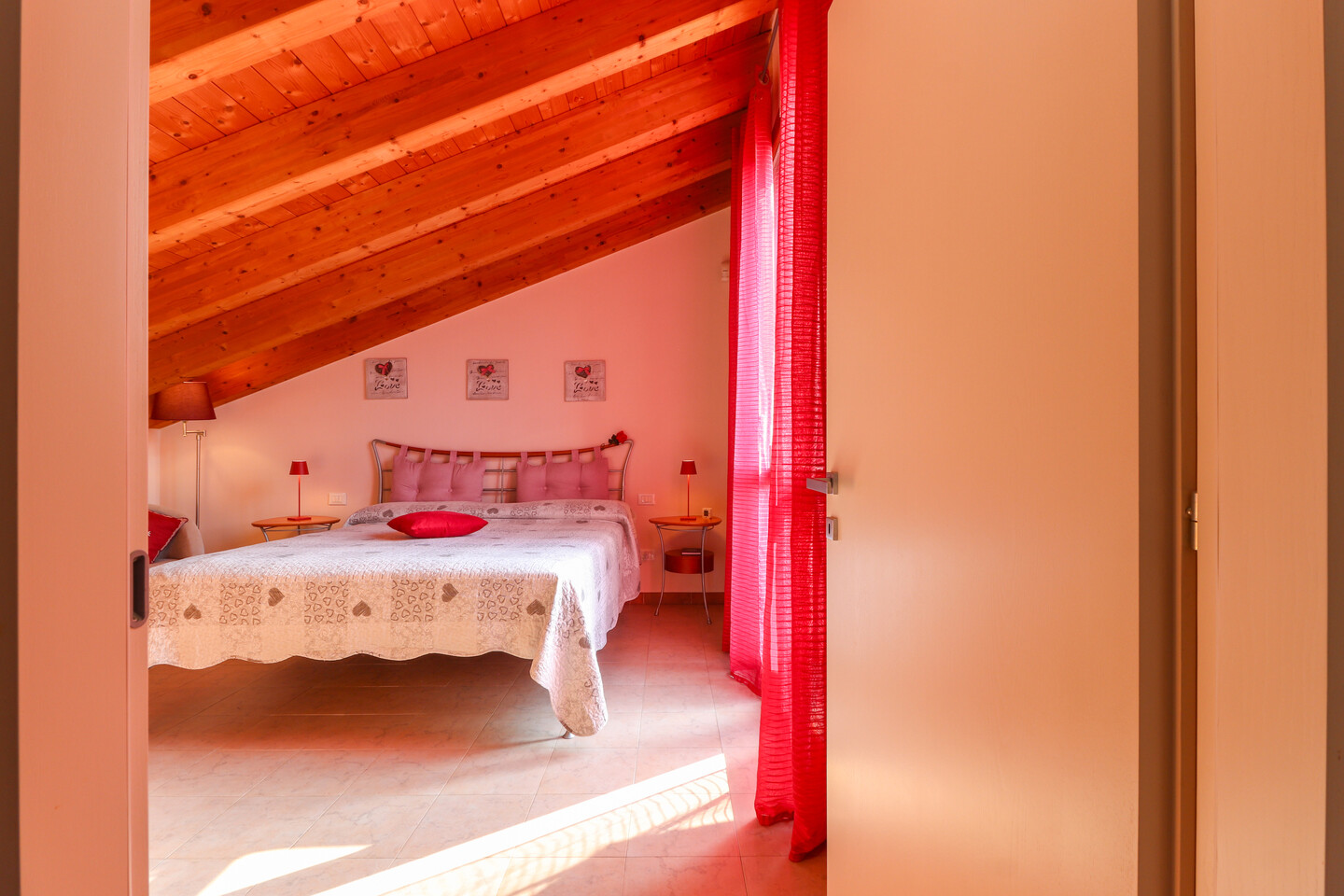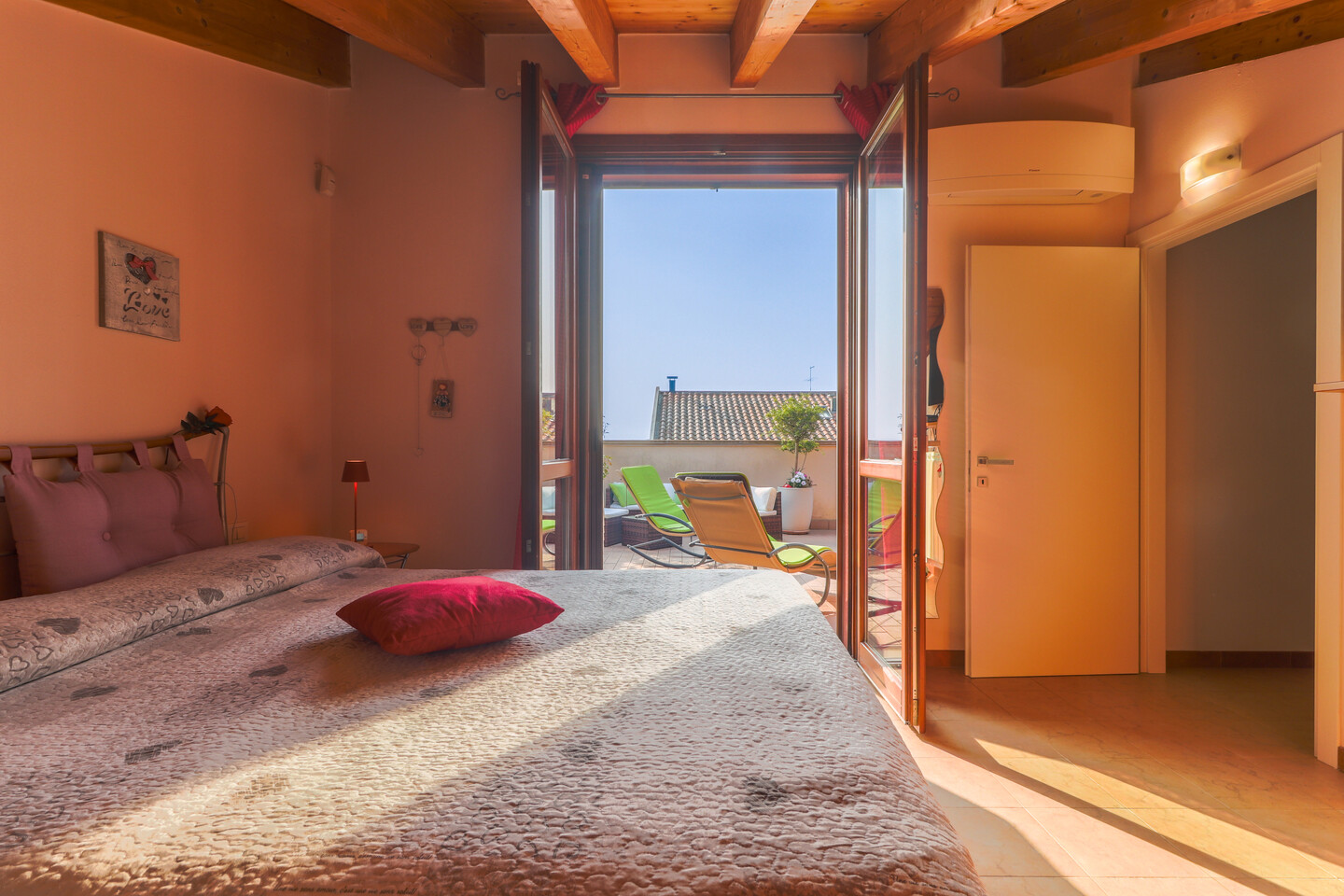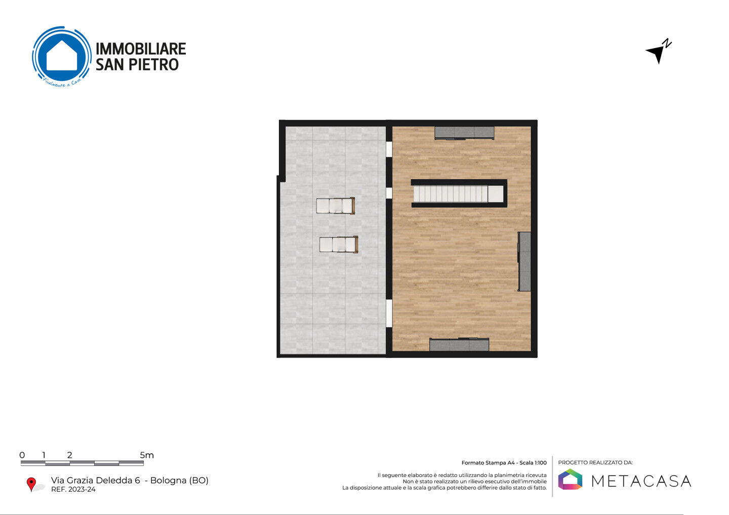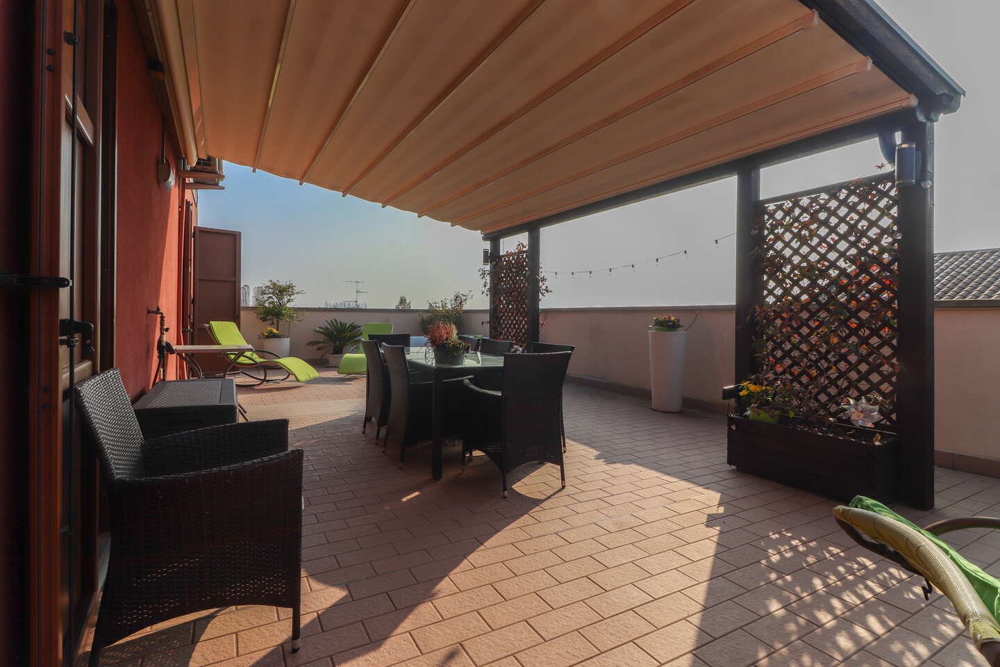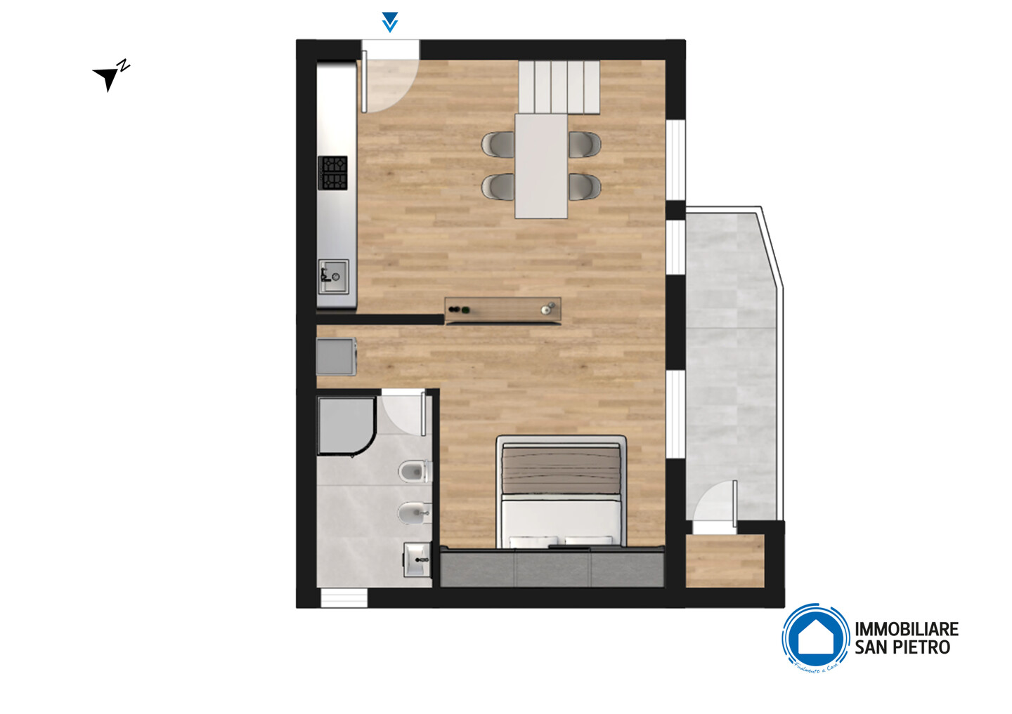 Ingresso su soggiorno con cucina a vista, accesso al primo terrazzo, disimpegno, bagno e ripostiglio; al piano superiore camera da letto matrimoniale, camera da letto singola e bagno, accesso ad un ulteriore terrazzo di 40 mq. A completare la proprietà cantina, garage.