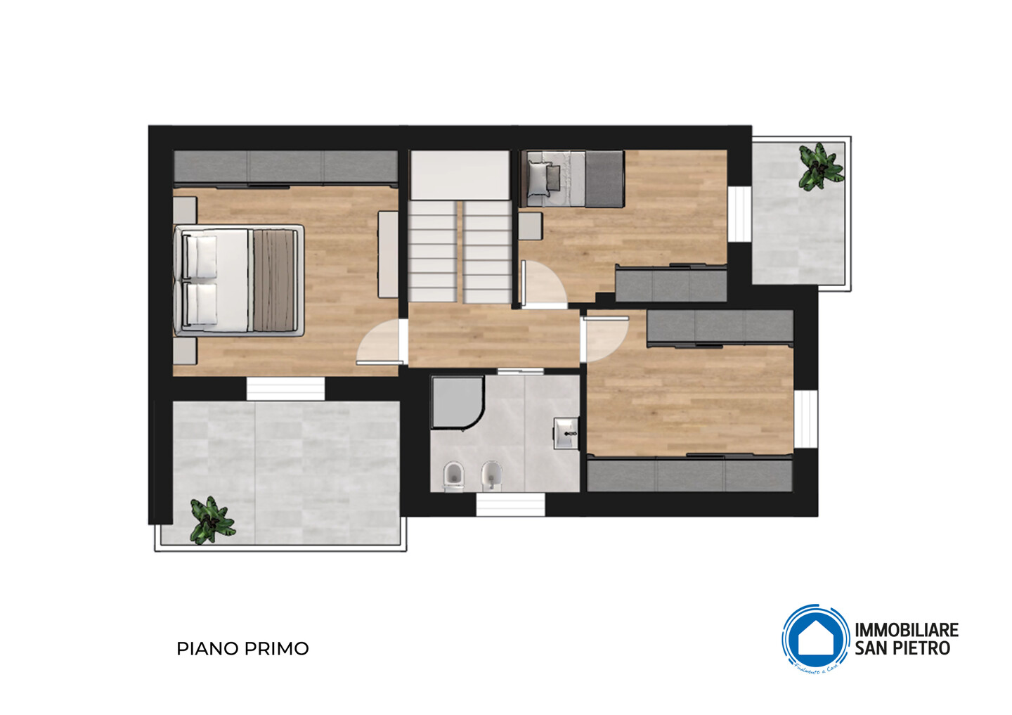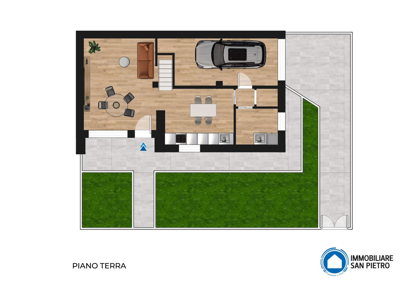 L’appartamento è composto da giardino con ingresso al piano terra su soggiorno, cucina abitabile, disimpegno notte, lavanderia/wc, locale tecnico, autorimessa; al piano primo troviamo disimpegno notte, camera matrimoniale con terrazzo e camera singola con secondo terrazzo, bagno, locale accessorio; al piano secondo locale accessorio/soffitta/studio.