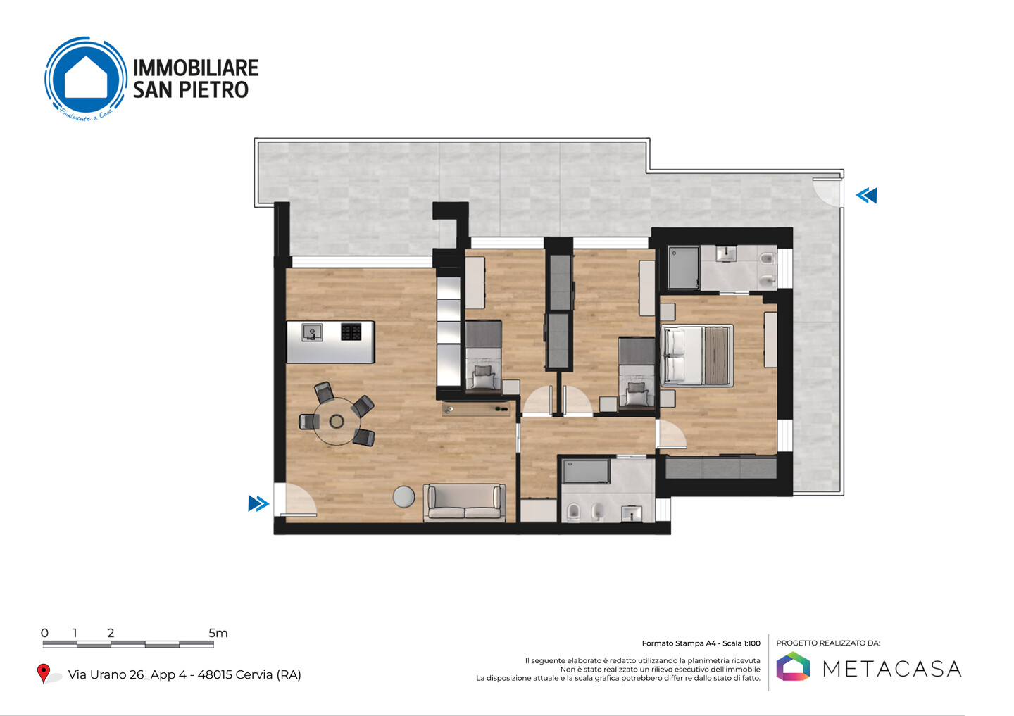Appartamento 4 composto da ampio soggiorno con cucina a vista, disimpegno zona notte, 1 camera matrimoniale con bagno privato, 2 camere singole, 1 bagno principale, spaziosa veranda con accesso al giardino privato, ripostiglio, 2 posti auto di proprietà esclusiva.
