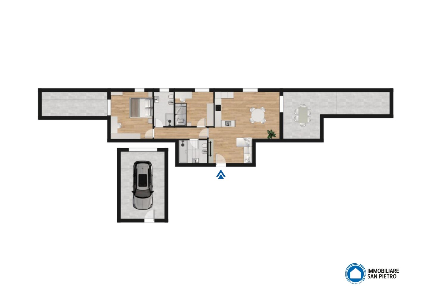 L’ingresso accogliente si apre su un luminoso soggiorno con cucina a vista, che si collega a una spaziosa loggia abitabile, perfetta per momenti di relax all’aperto. La proprietà dispone di una camera da letto con accesso ad una loggia e di un bagno finestrato per il massimo comfort. Completa l’offerta un ampio garage al piano terra.