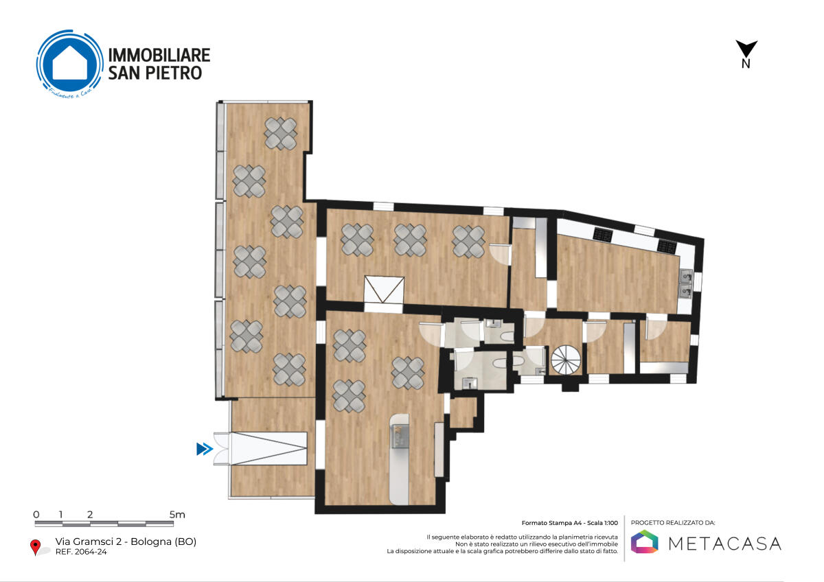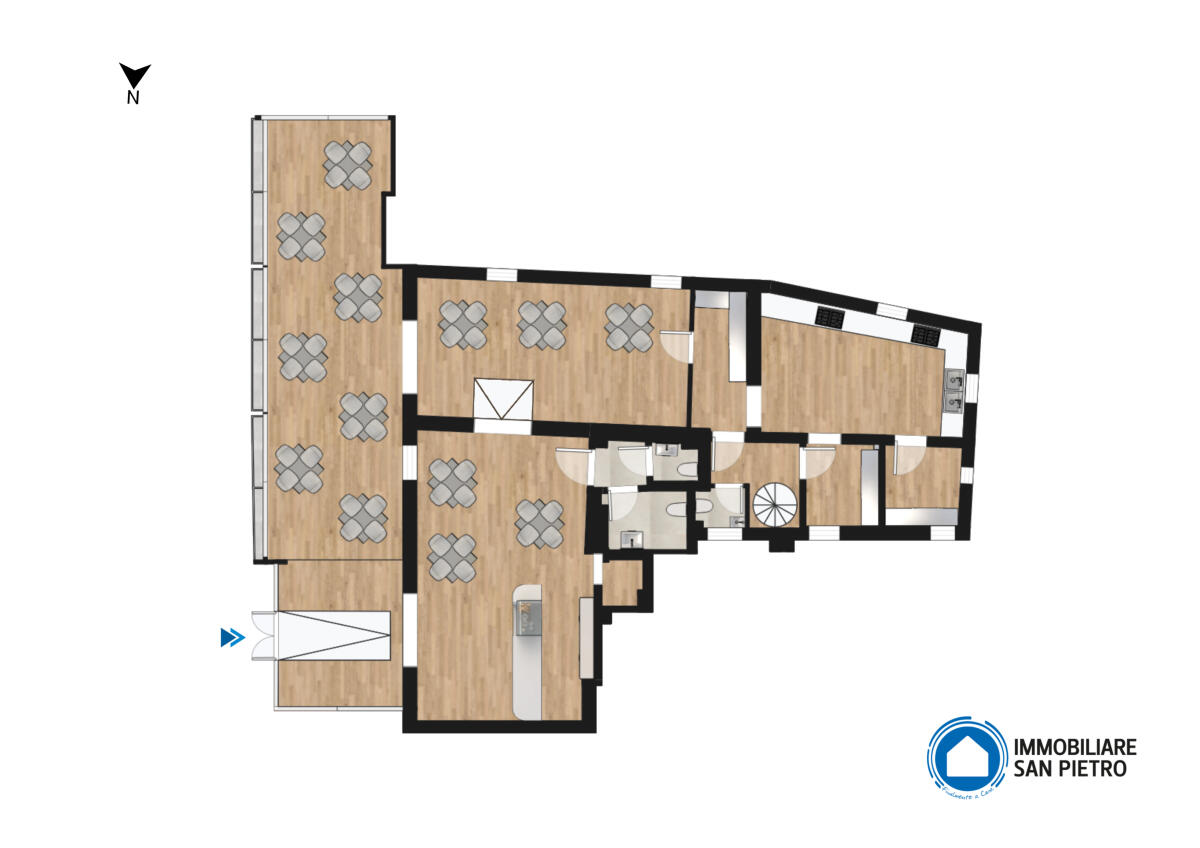Al piano terra, l’immobile presenta spazi ben distribuiti: tre accoglienti sale da pranzo, di cui una all’ingresso con angolo bar e ripostiglio. La proprietà include una cucina funzionale con zona dispensa, un’area per la preparazione dei dolci, un comodo locale ad uso deposito e tre bagni.