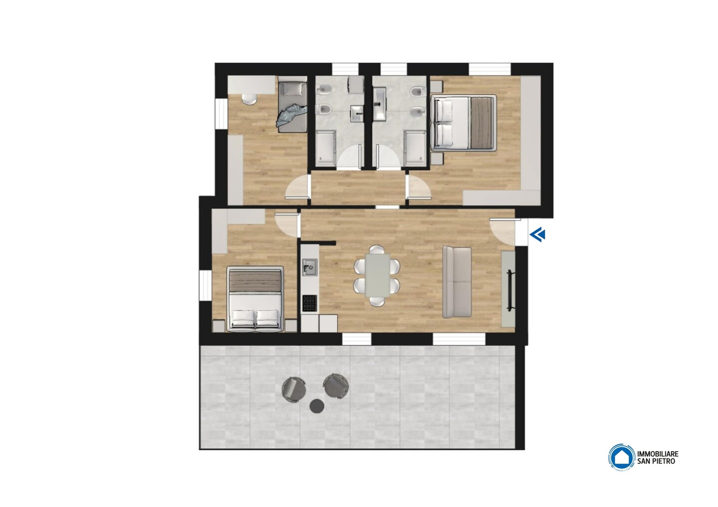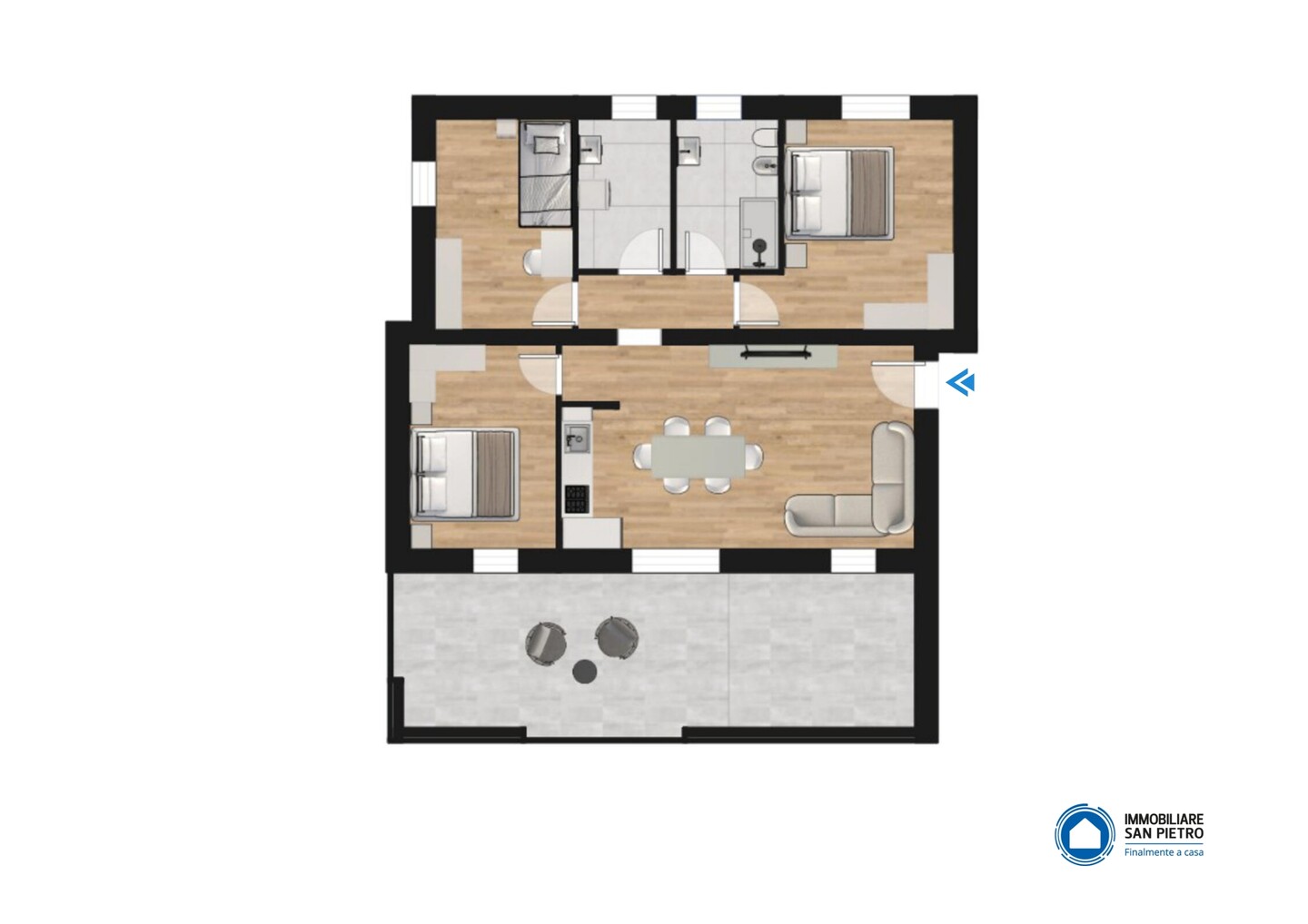 In piccola palazzina di sole quattro unità, appartamento (tip. A3) posto al primo nonché ultimo piano, con affaccio su tre lati. Internamente la soluzione si compone di ingresso su spaziosa sala con angolo cottura e affaccio su grande terrazzo abitabile di oltre 30 mq, disimpegno, 3 camere (di cui una matrimoniale e due doppie), bagno finestrato e comoda lavanderia.