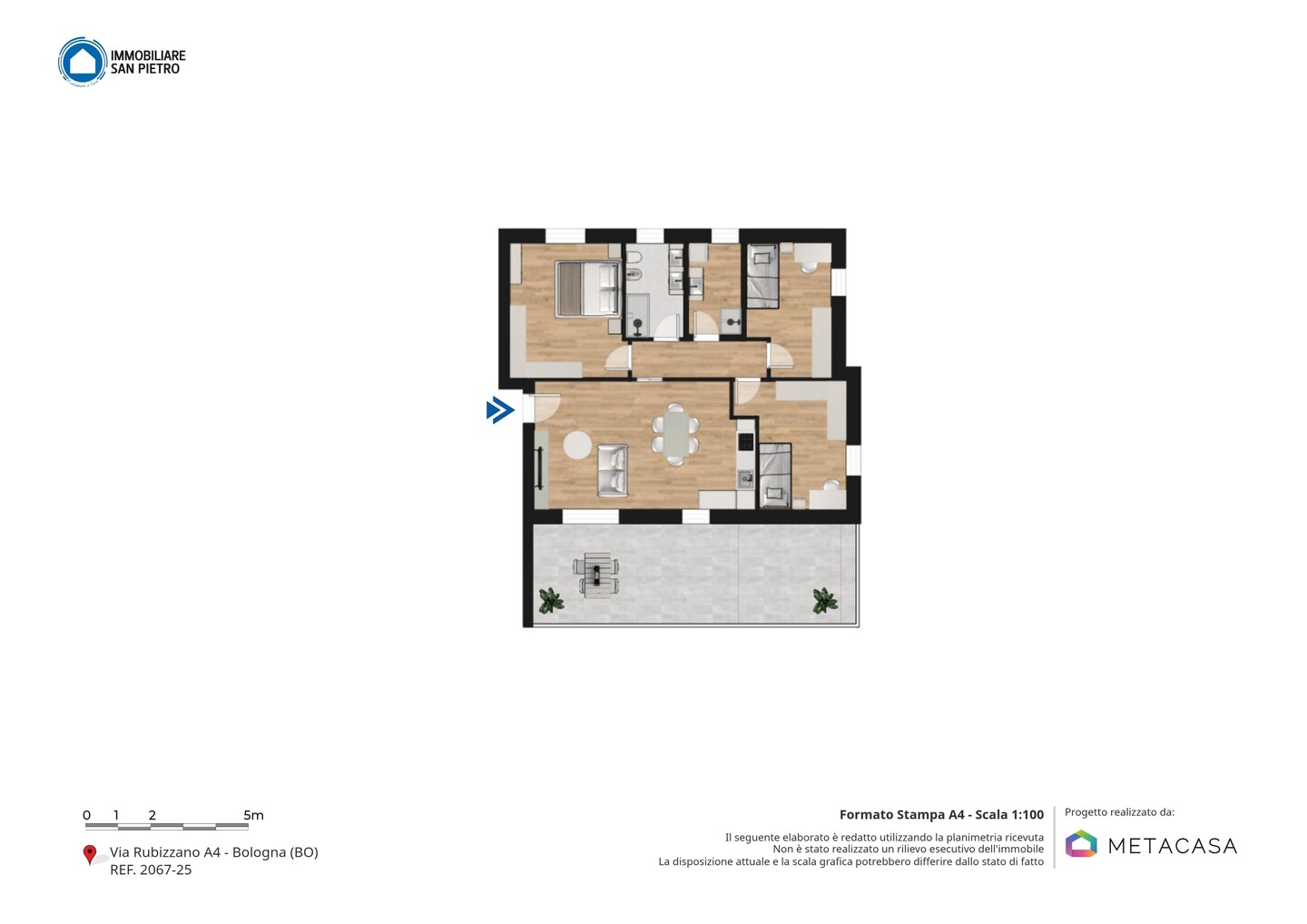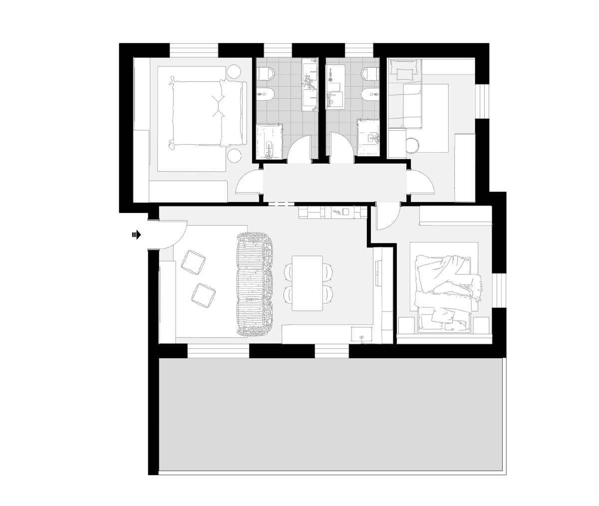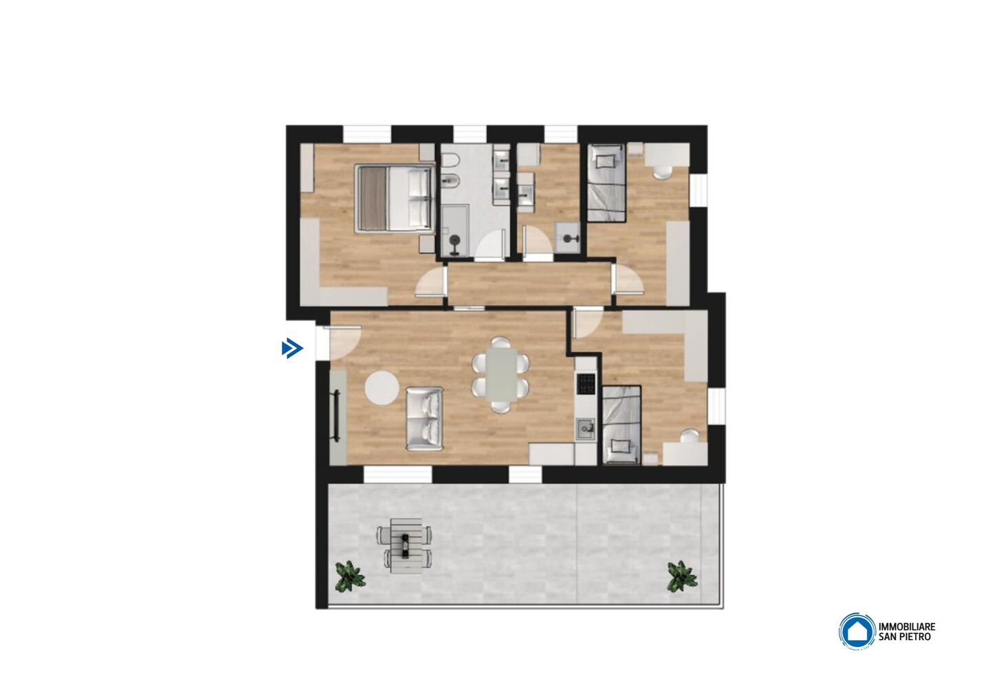 In piccola palazzina di sole quattro unità, appartamento (tip. A4) posto al primo nonché ultimo piano, con affaccio su tre lati. Internamente la soluzione si compone di ingresso su spaziosa sala con angolo cottura e affaccio su splendido terrazzo abitabile di quasi 32 mq, disimpegno, 3 camere (di cui una matrimoniale e due doppie), bagno finestrato e comoda lavanderia.