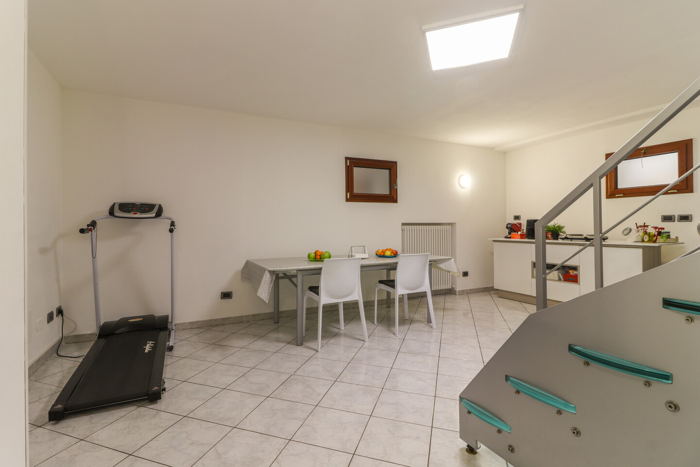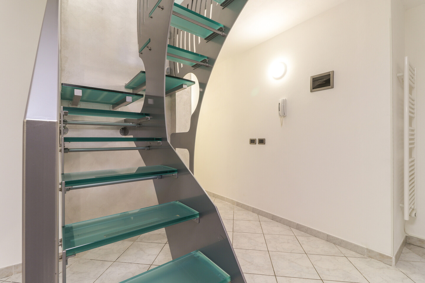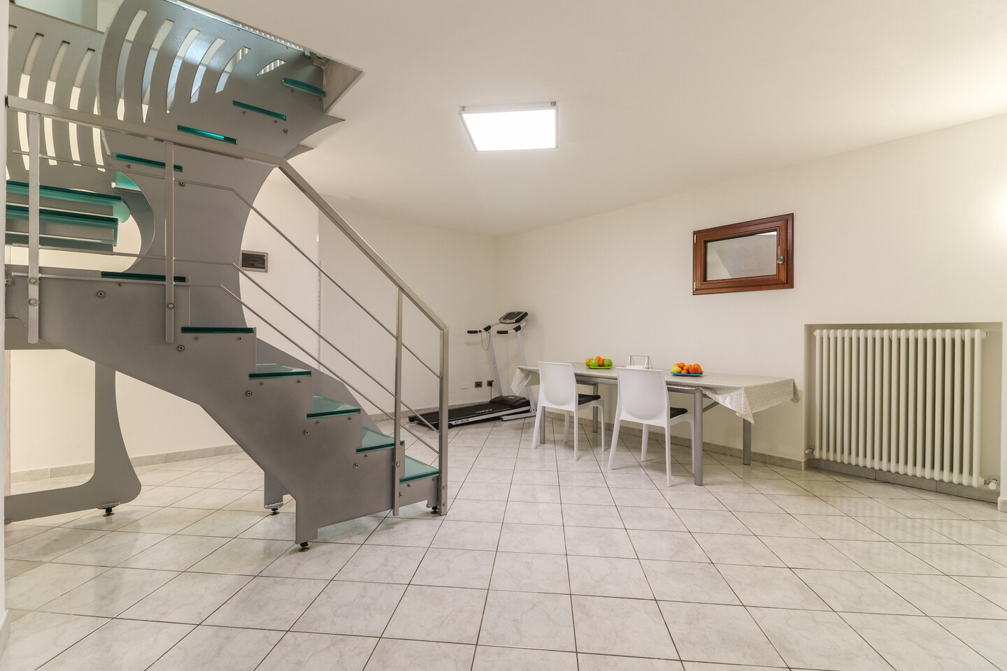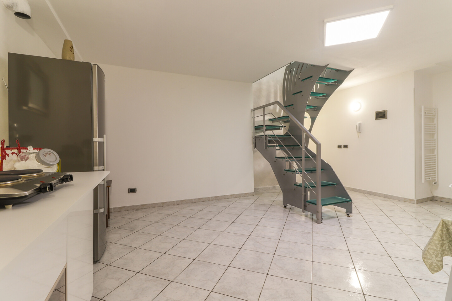 L’ingresso indipendente dal giardino conduce al luminoso soggiorno con angolo cottura e ad un bagno finestrato con doccia. Da qui si accede sia alla scala principale in parquet che porta alla zona notte, sia alla scala in vetro che conduce al piano seminterrato, dove è presente la taverna/cantina.