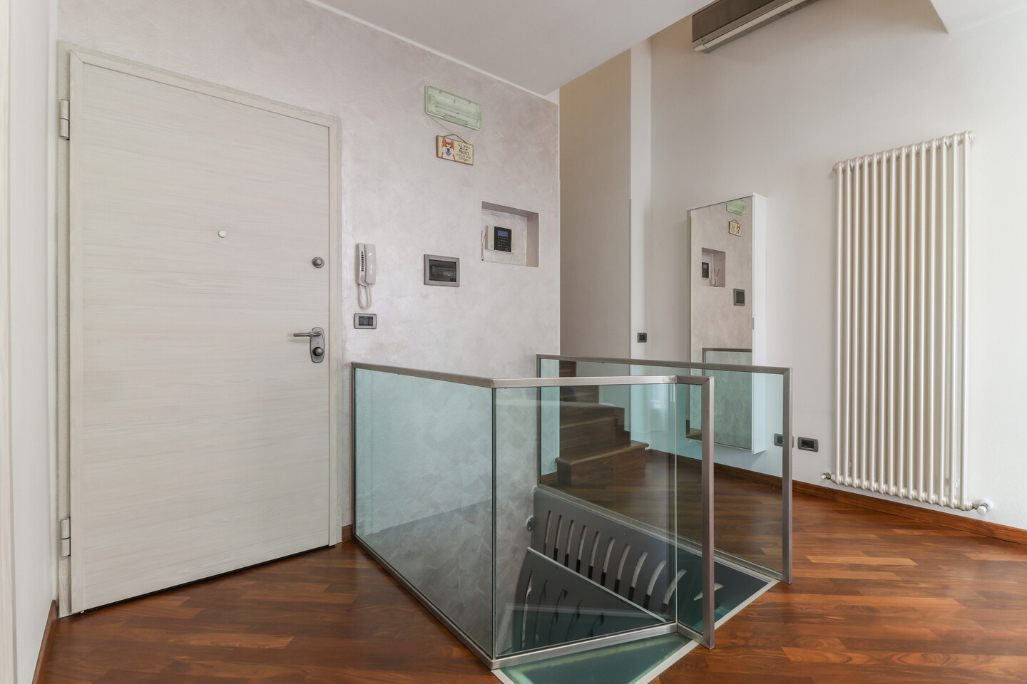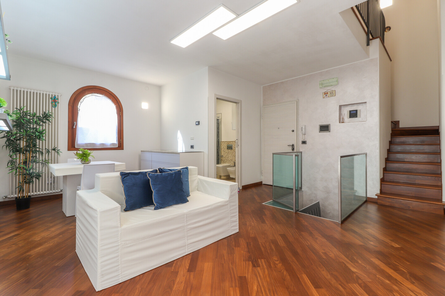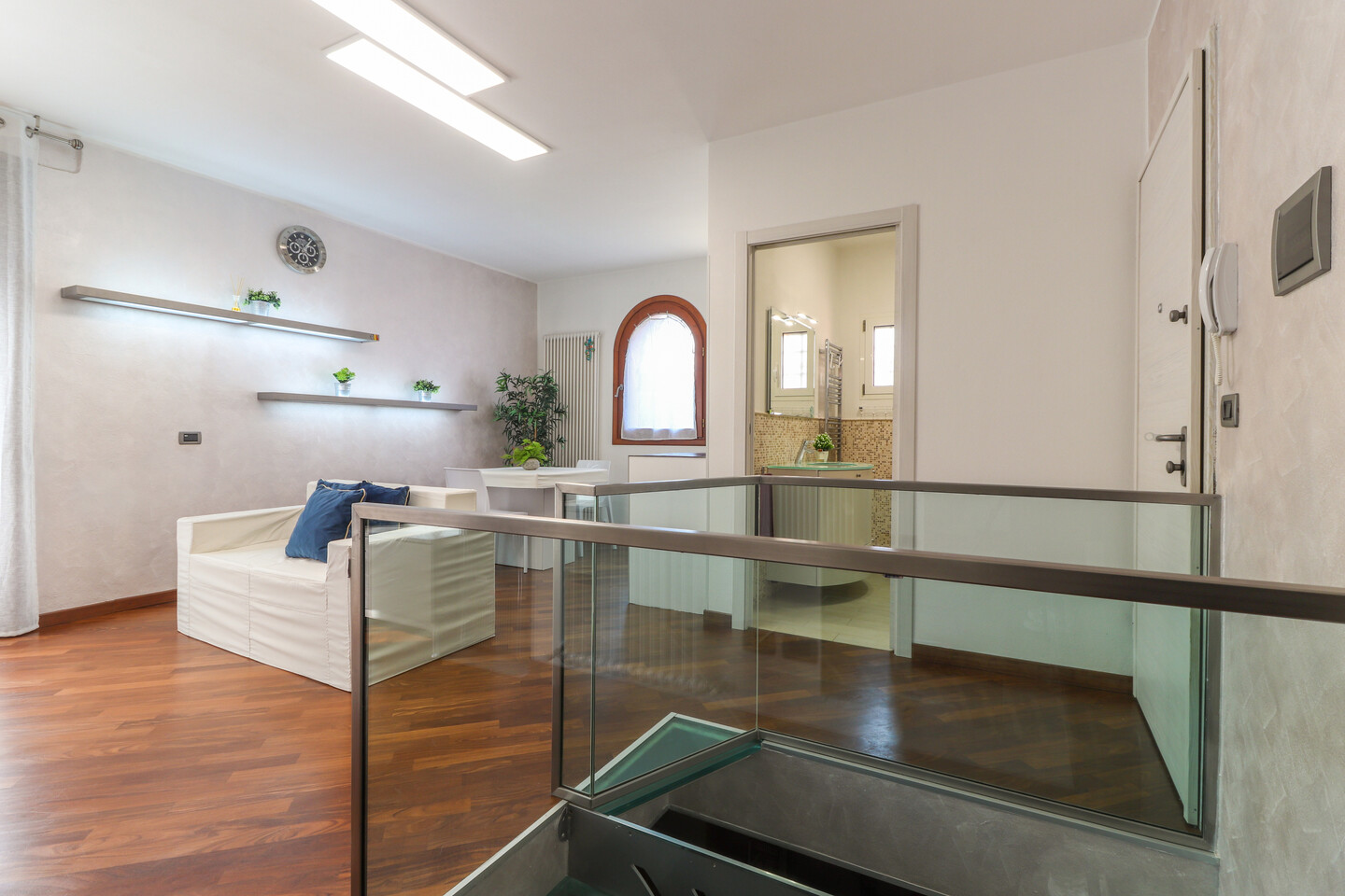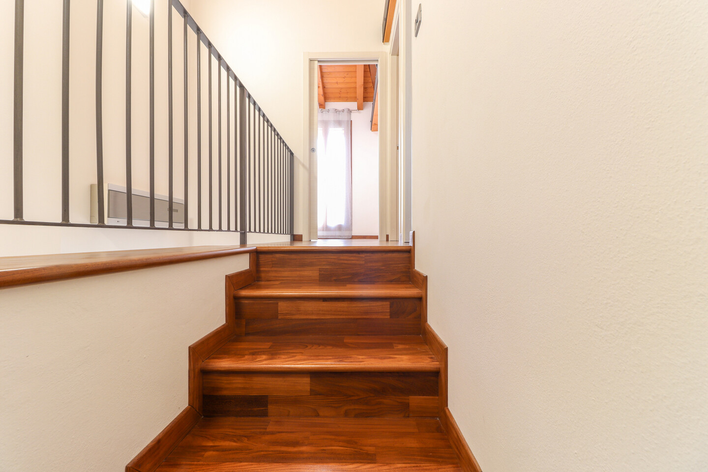 L’ingresso indipendente dal giardino conduce al luminoso soggiorno con angolo cottura e ad un bagno finestrato con doccia. Da qui si accede sia alla scala principale in parquet che porta alla zona notte, sia alla scala in vetro che conduce al piano seminterrato, dove è presente la taverna/cantina.