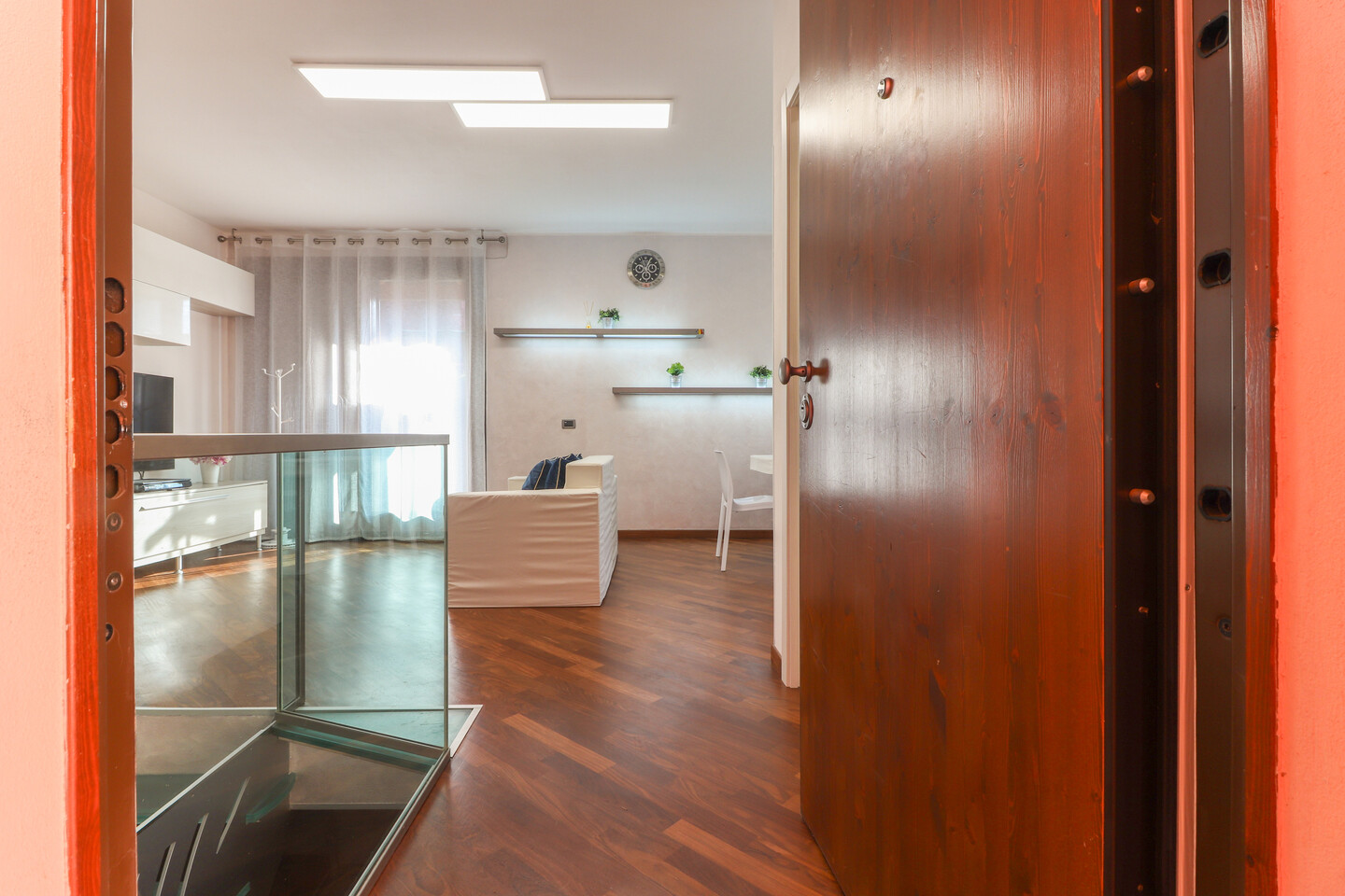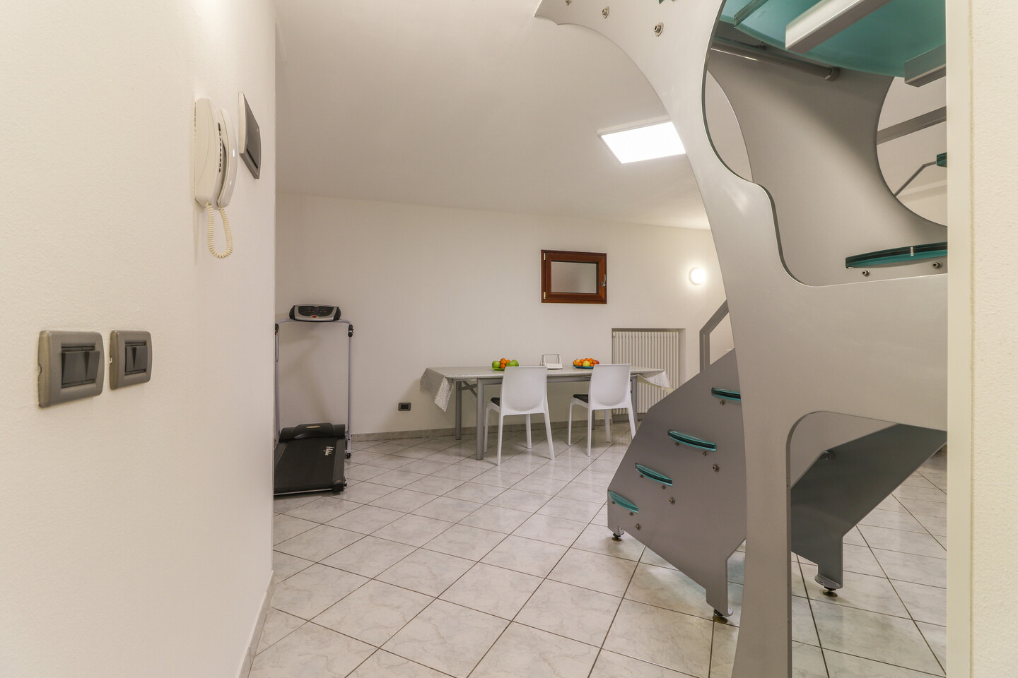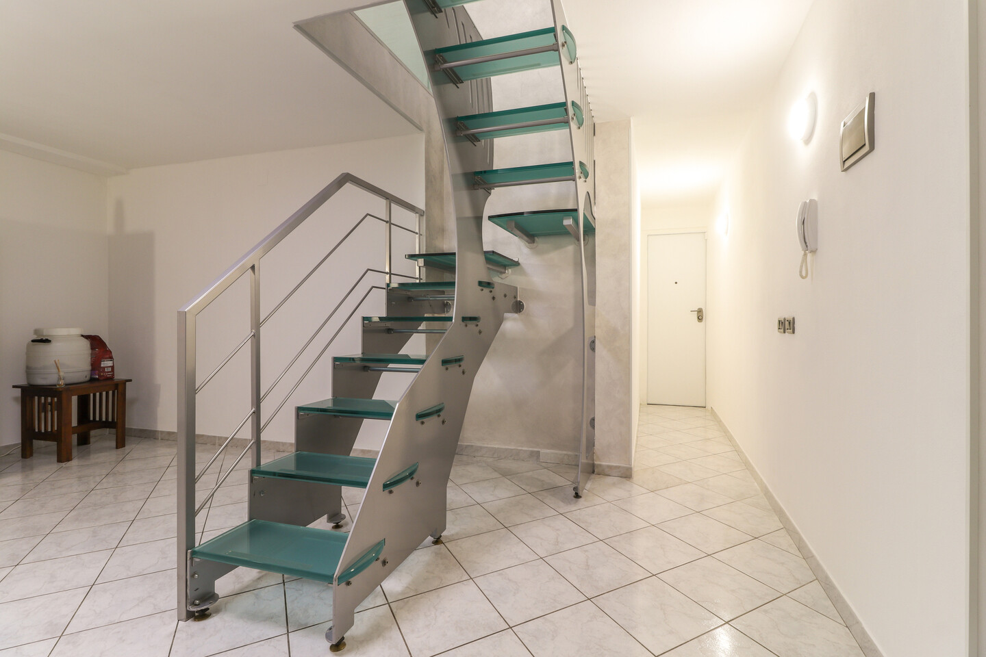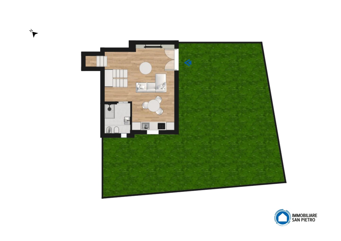 L’ingresso indipendente dal giardino conduce al luminoso soggiorno con angolo cottura e ad un bagno finestrato con doccia. Da qui si accede sia alla scala principale in parquet che porta alla zona notte, sia alla scala in vetro che conduce al piano seminterrato, dove è presente la taverna/cantina.