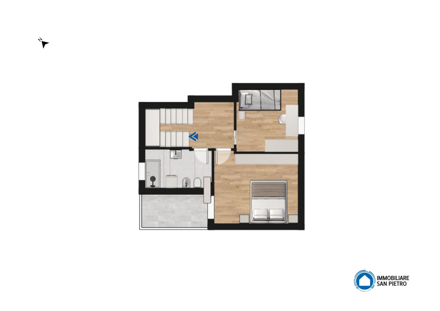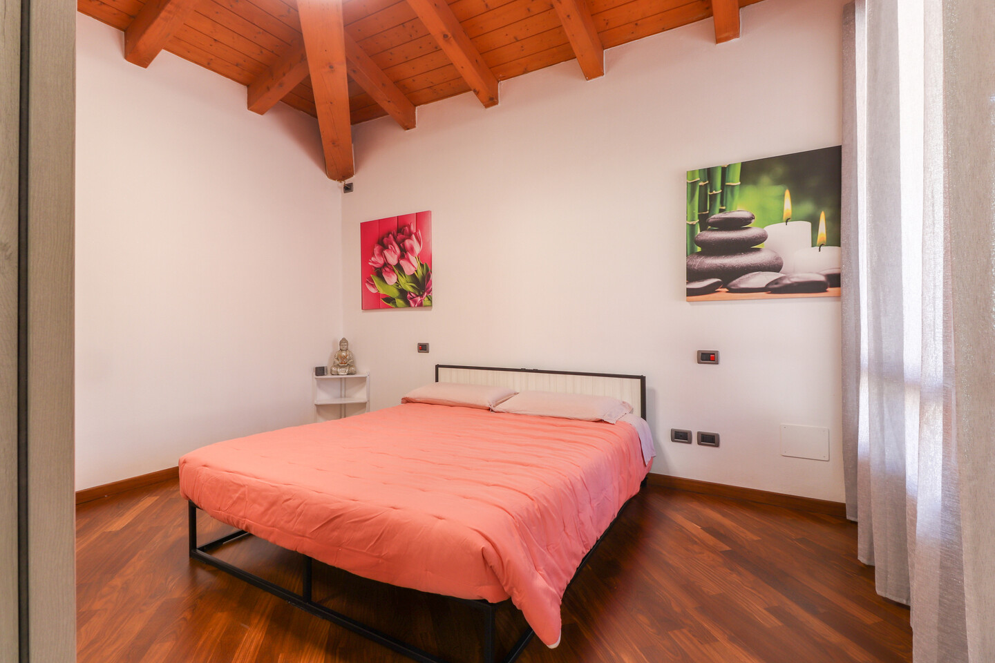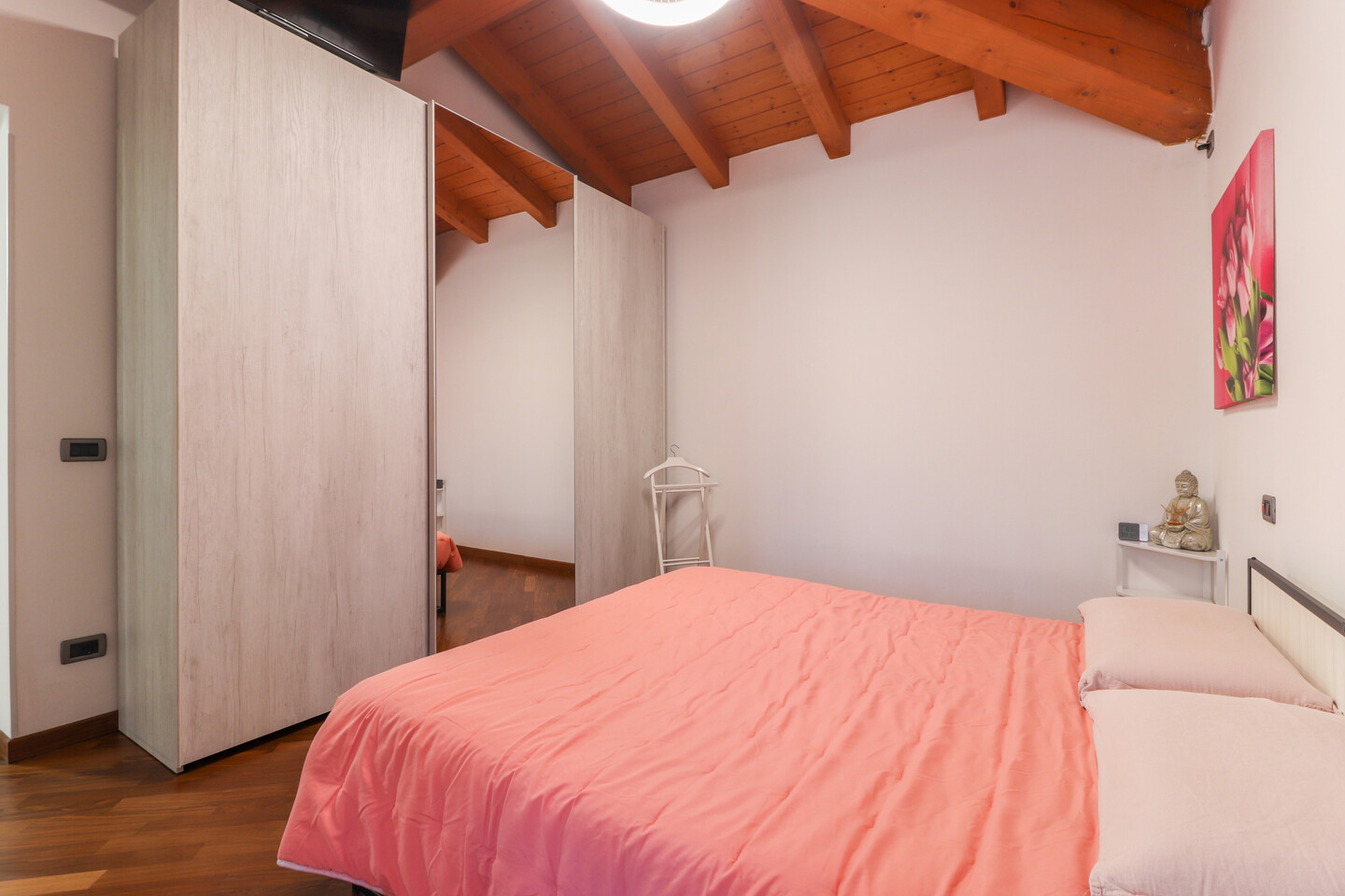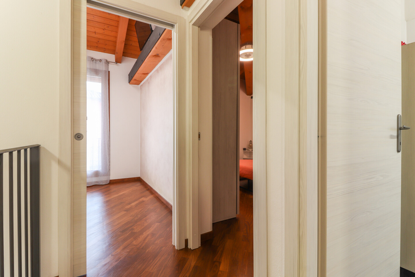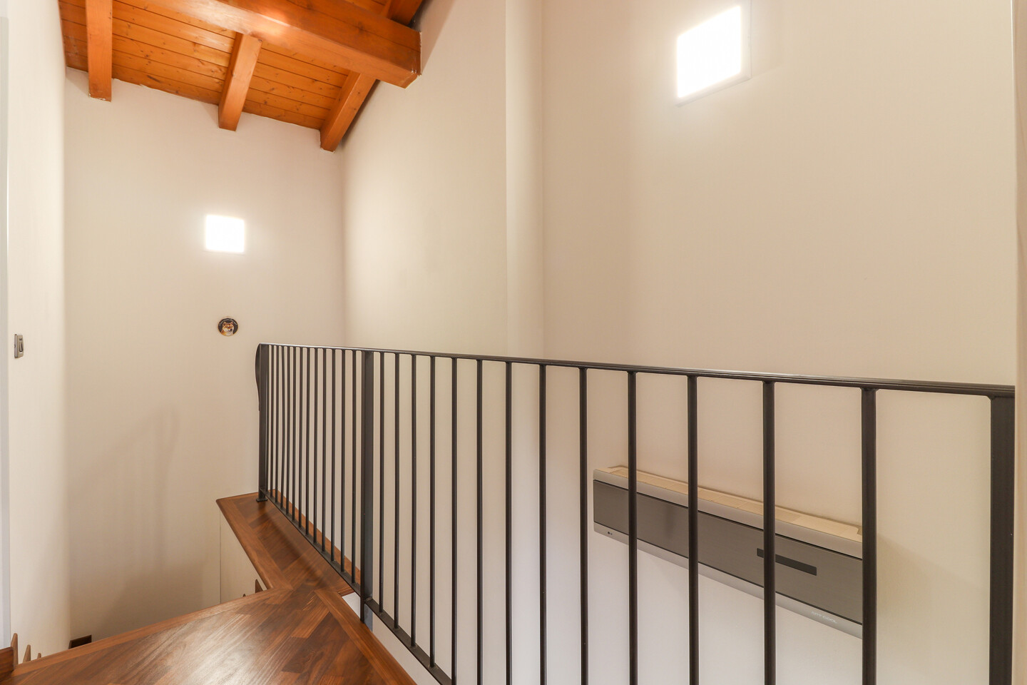 Al piano superiore, caratterizzato da suggestivi soffitti mansardati in legno alti fino a 3,20 metri, si trovano 1 camera matrimoniale con accesso diretto alla terrazza, 1 camera doppia e un bagno spazioso dotato di vasca e doppio lavabo.
