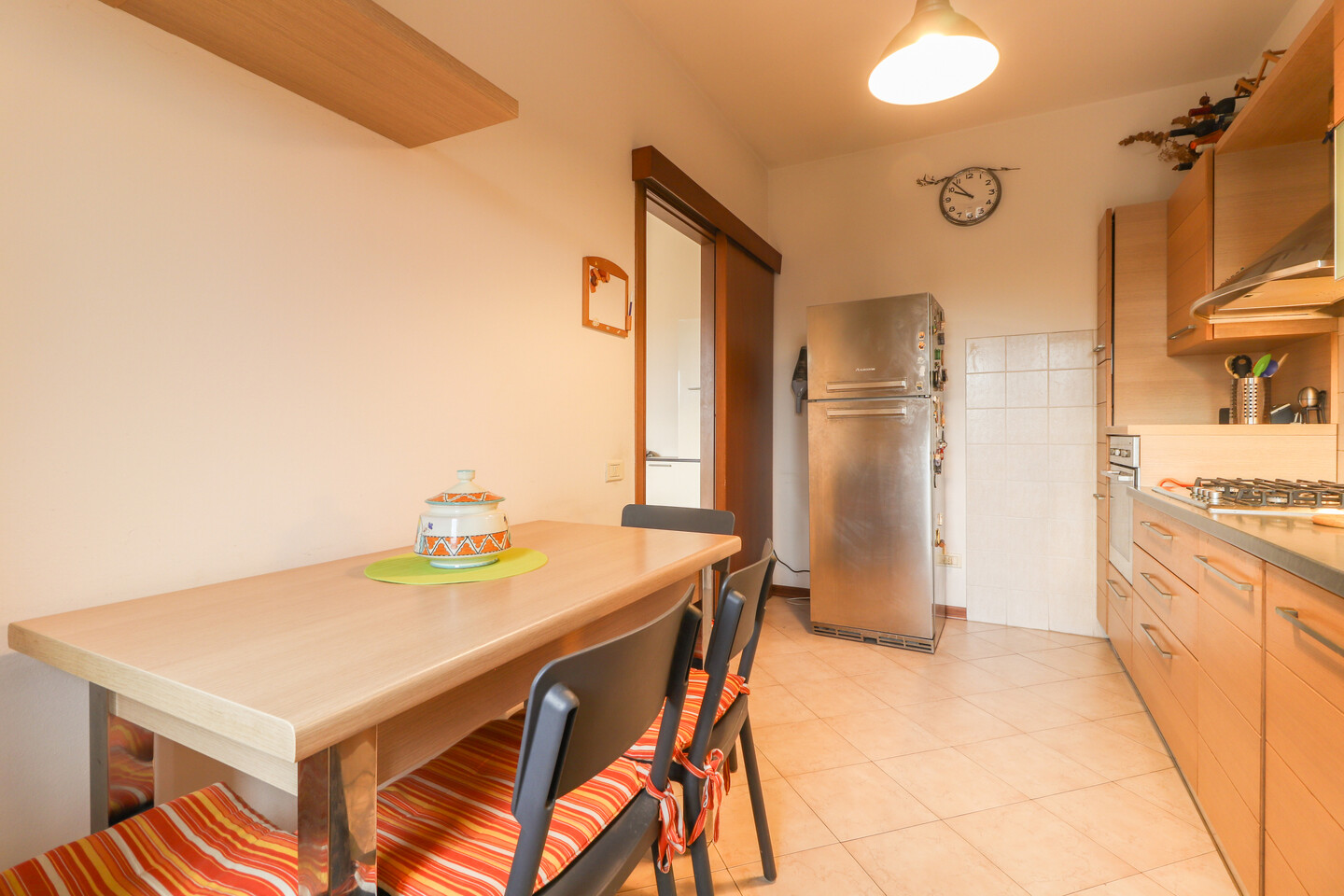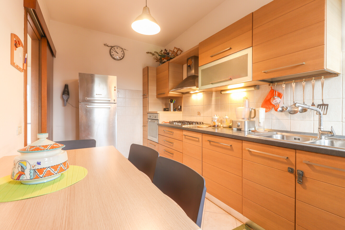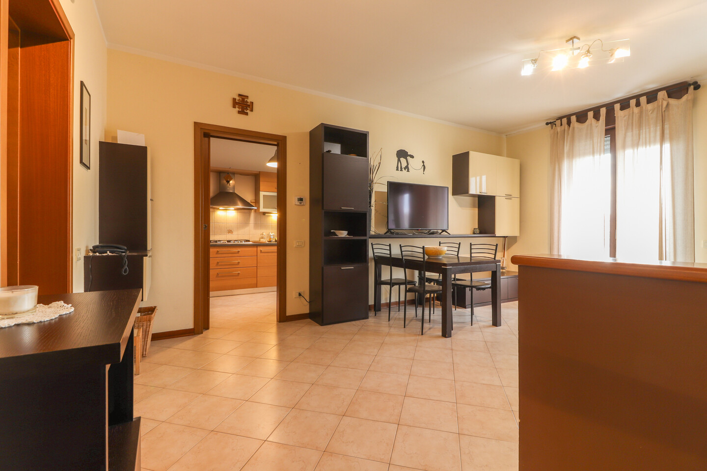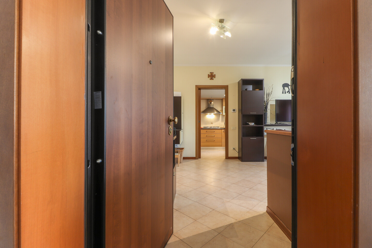 Ingresso su soggiorno con accesso al balcone, cucina abitabile, disimpegno, camera da letto matrimoniale, studio, bagno e ripostiglio. A completare la proprietà garage al piano terra.