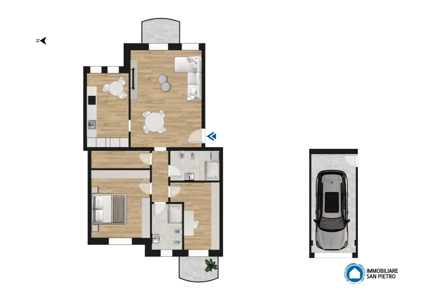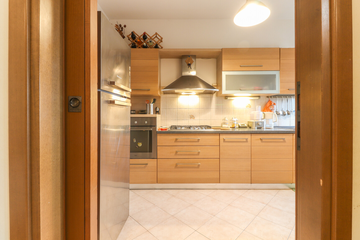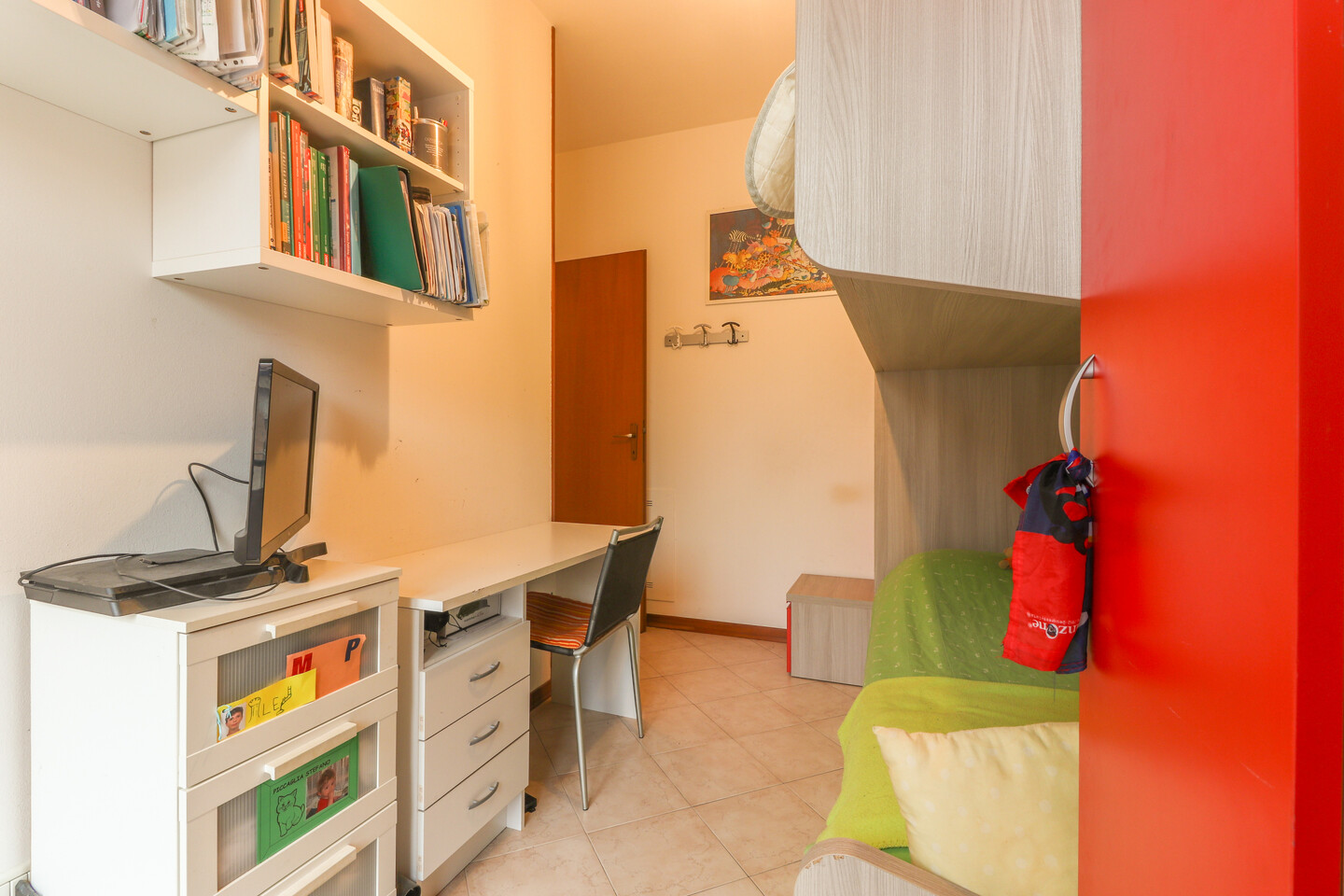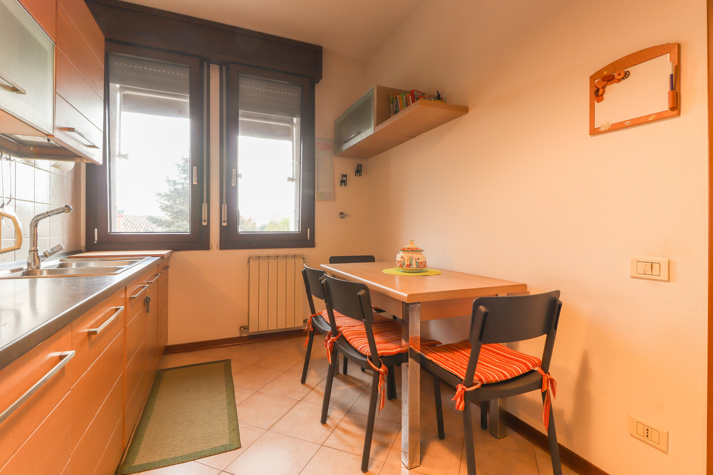 Ingresso su soggiorno con accesso al balcone, cucina abitabile, disimpegno, camera da letto matrimoniale, studio, bagno e ripostiglio. A completare la proprietà garage al piano terra.