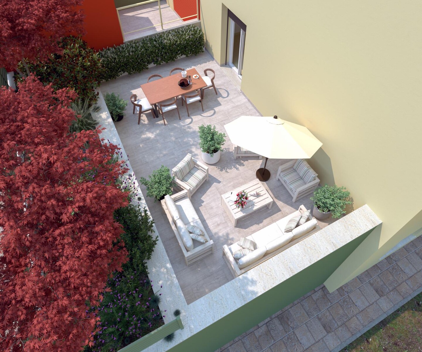 L’immobile è situato al primo piano e così composto: ingresso su soggiorno, cucina abitabile, dalla quale è possibile accedere direttamente ad un ampio terrazzo abitabile ; un disimpegno notte divide una camera matrimoniale, una doppia e 2 bagni. Completano la proprietà autorimessa e posto auto privato al piano terra.