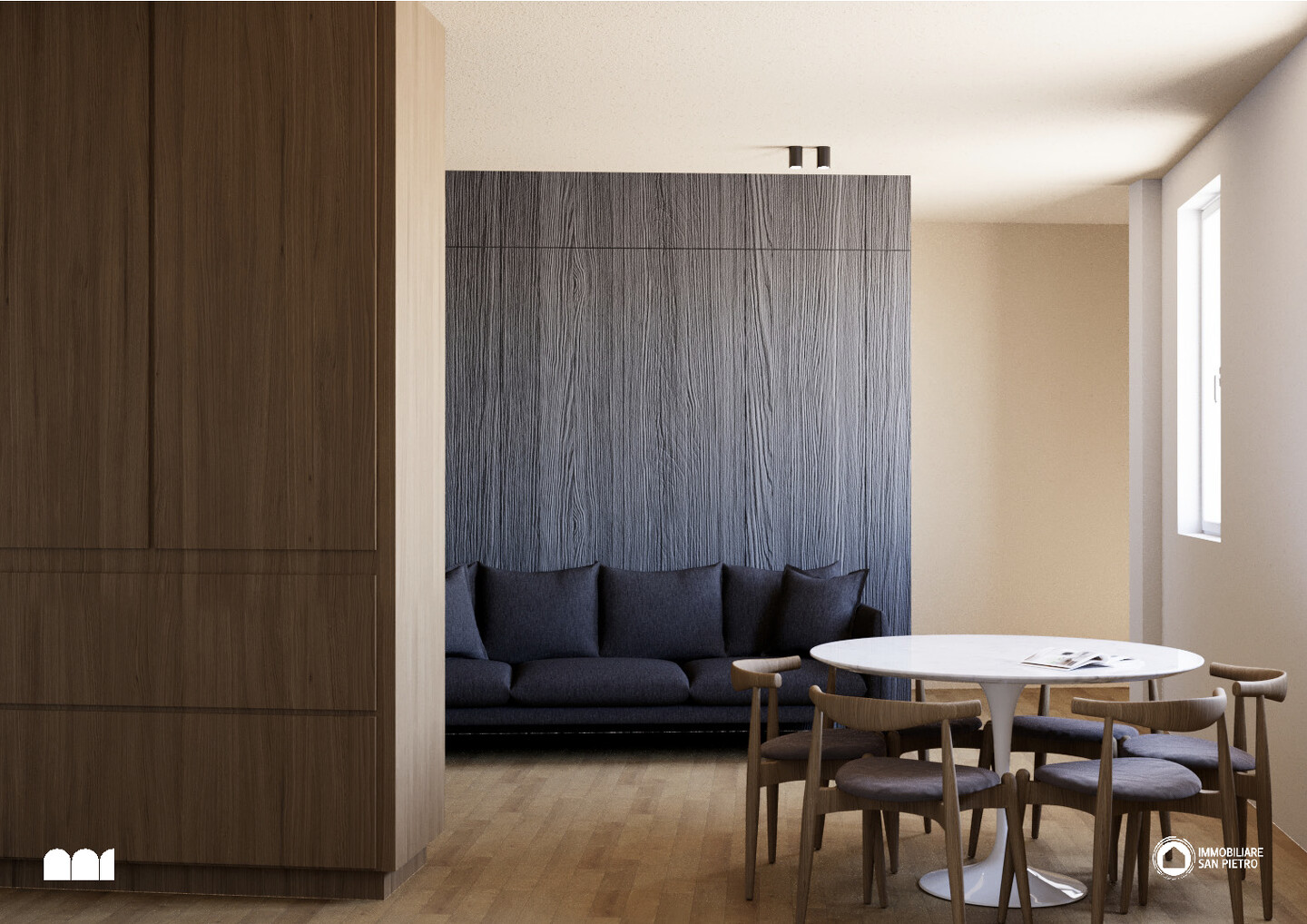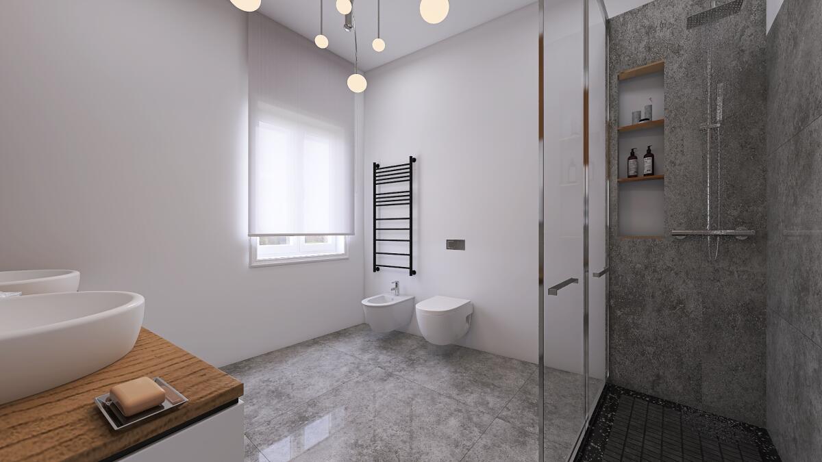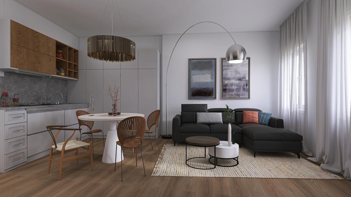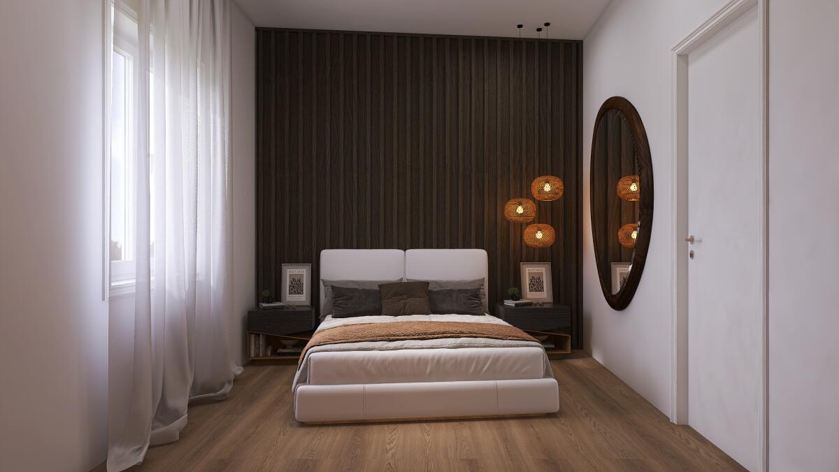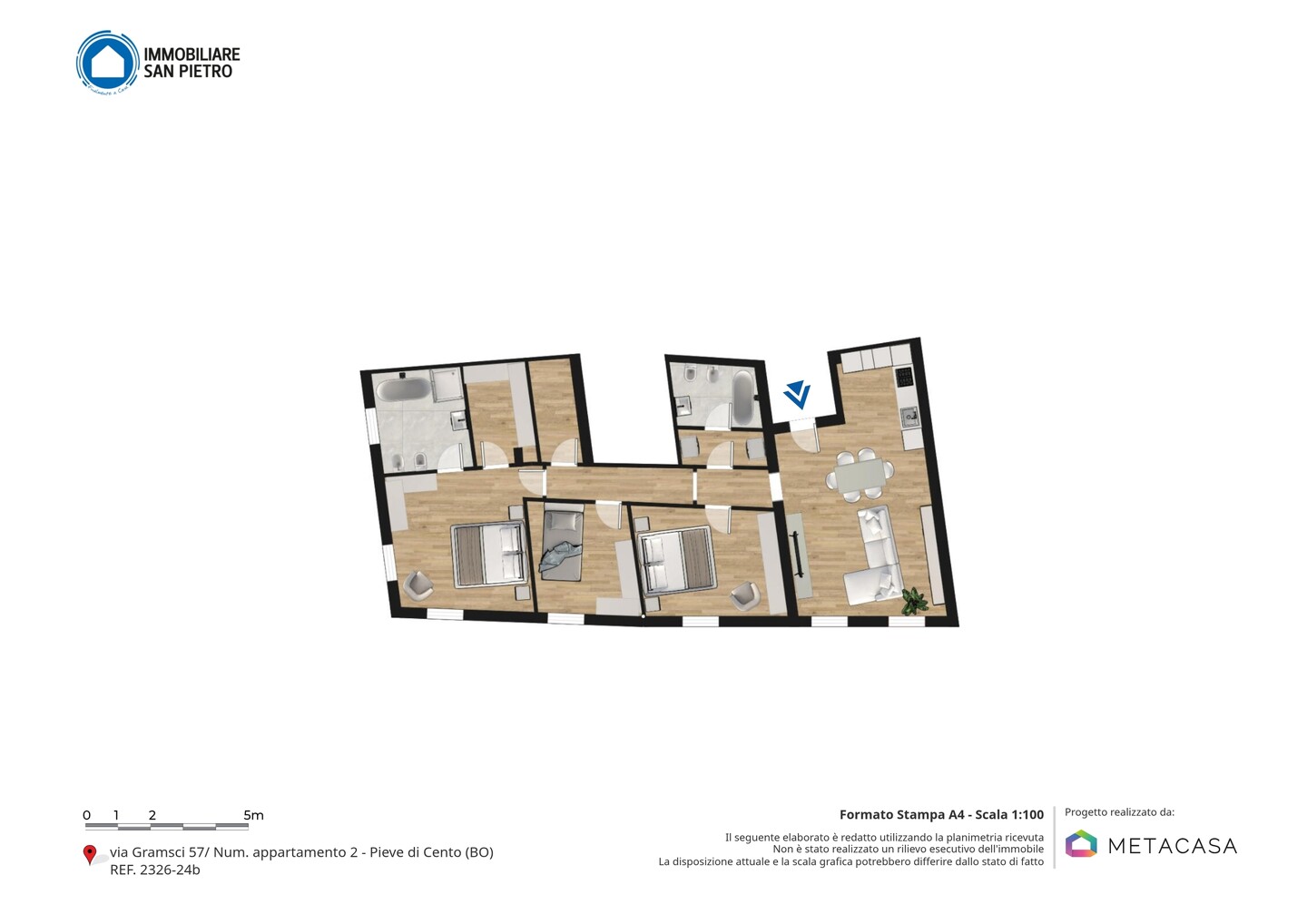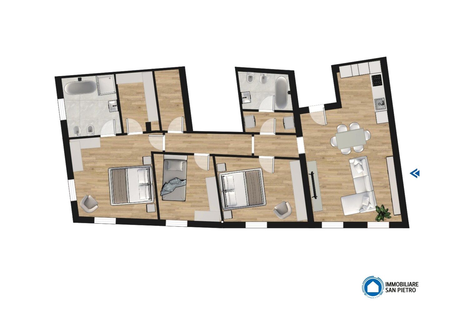 L’immobile è situato al primo piano e così composto: ingresso su soggiorno con angolo cottura, un disimpegno notte divide una camera matrimoniale (con abbinata cabina armadio), una doppia, una singola e 2 bagni (di cui uno con antibagno e lavanderia). Possibilità di realizzare una cucina abitabile e mantenere 2 camere da letto matrimoniali.