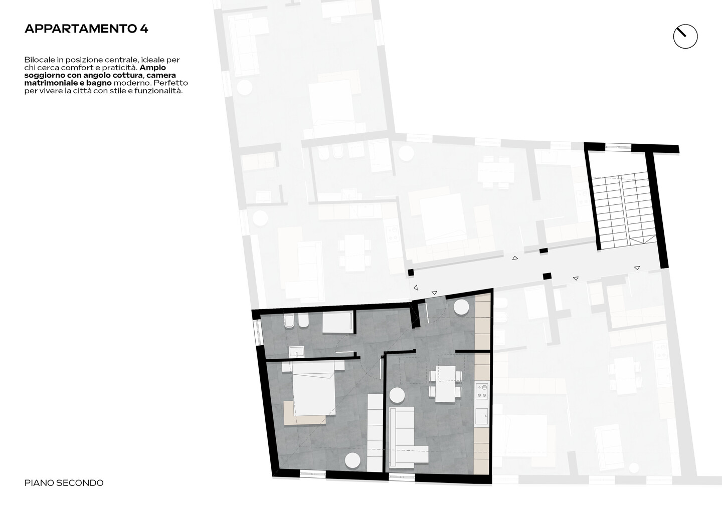 L’immobile è situato al secondo piano e così composto: ingresso su disimpegno, soggiorno con angolo cottura, camera matrimoniale e bagno.