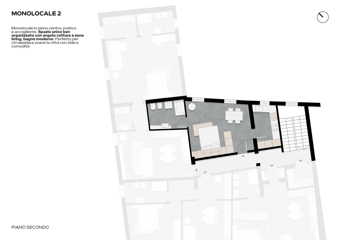 L’immobile è situato al secondo piano e così composto: ingresso su unico ambiente open space con divisione angolo cottura e bagno.