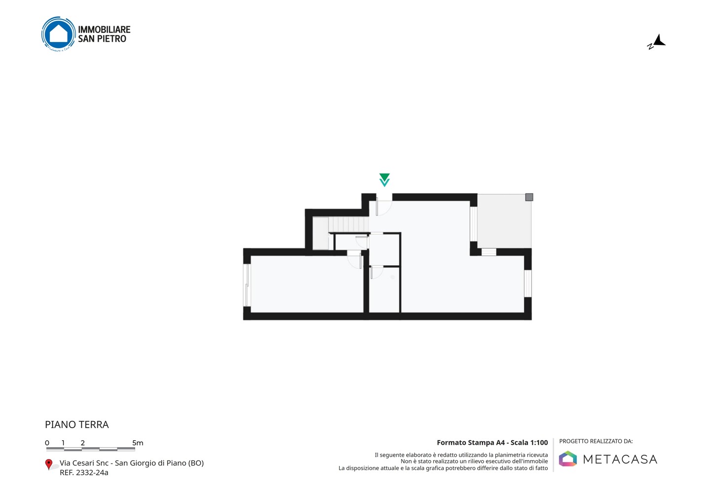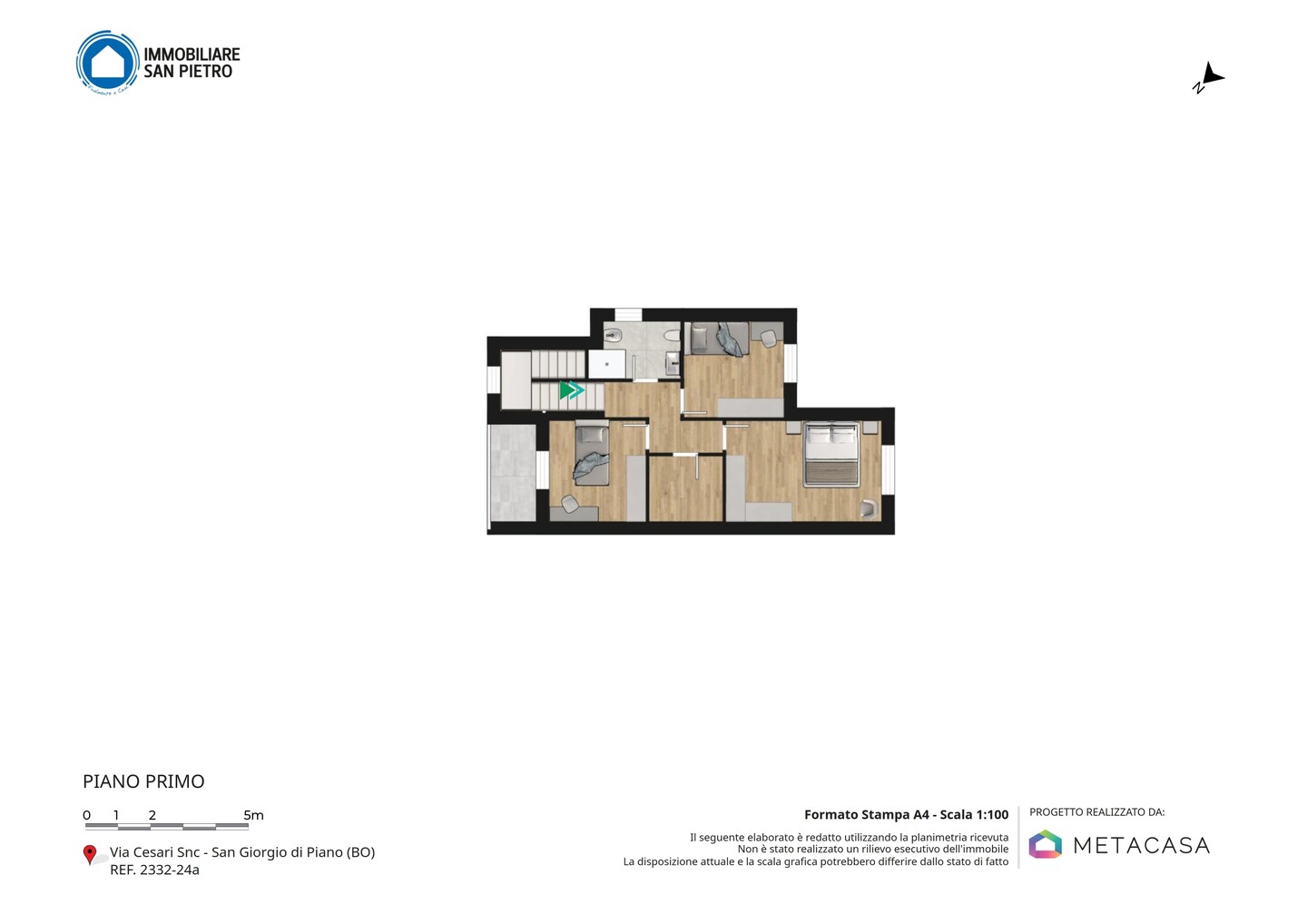 Porzione di bifamiliare sviluppata su due livelli ; al piano terra abbiamo soggiorno, cucina abitabile, vano tecnico e bagno; al piano superiore una camera da letto matrimoniale, 2 camere da letto singole, ripostiglio e bagno con balcone. A completare la proprietà garage, giardino esclusivo e portico.