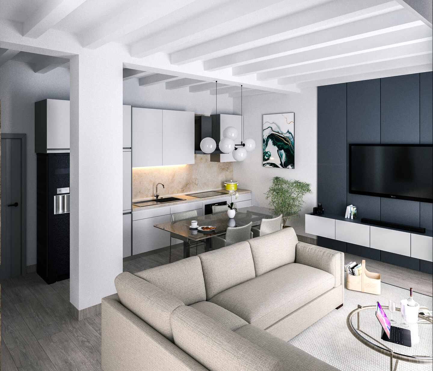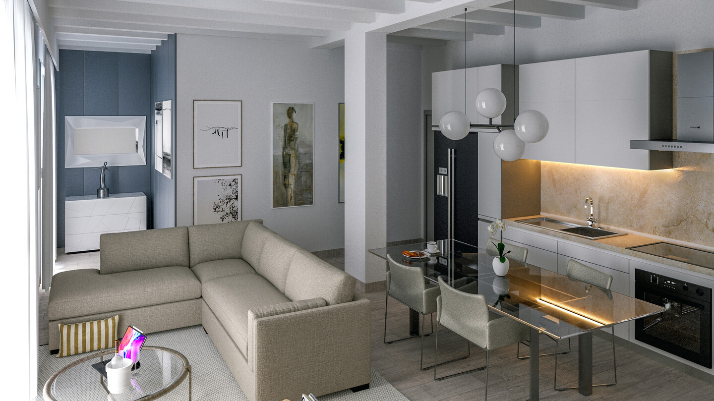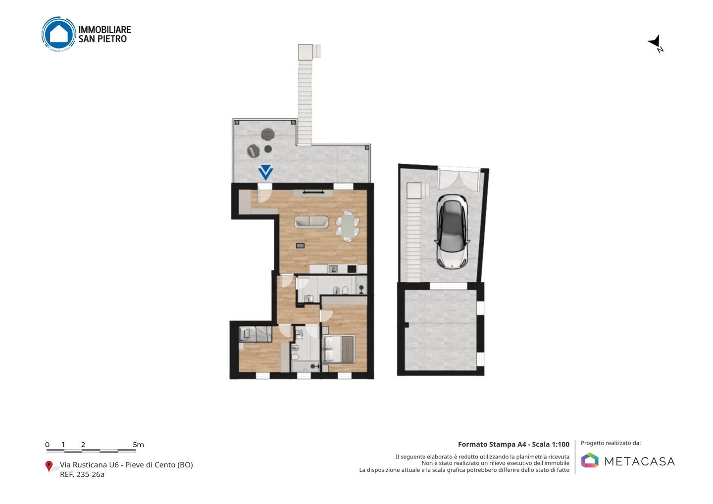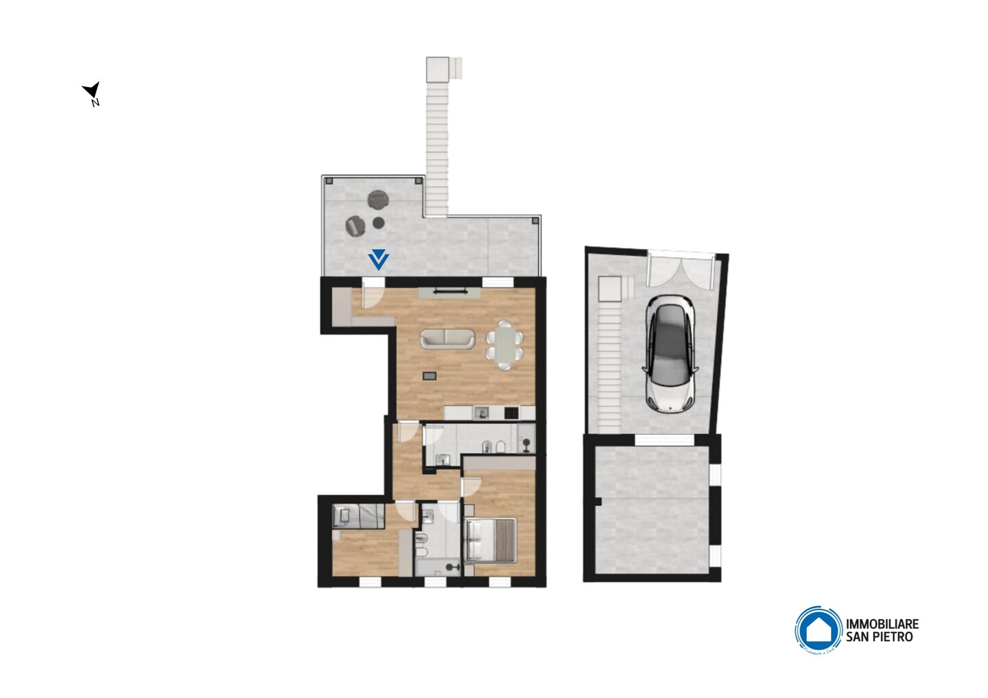 Appartamento situato al piano primo con ingresso indipendente e composto da soggiorno con angolo cottura ed accesso al terrazzo, disimpegno, 2 camere da letto e 2 bagni. A completare la proprietà garage, posto auto e corte privata al piano terra.