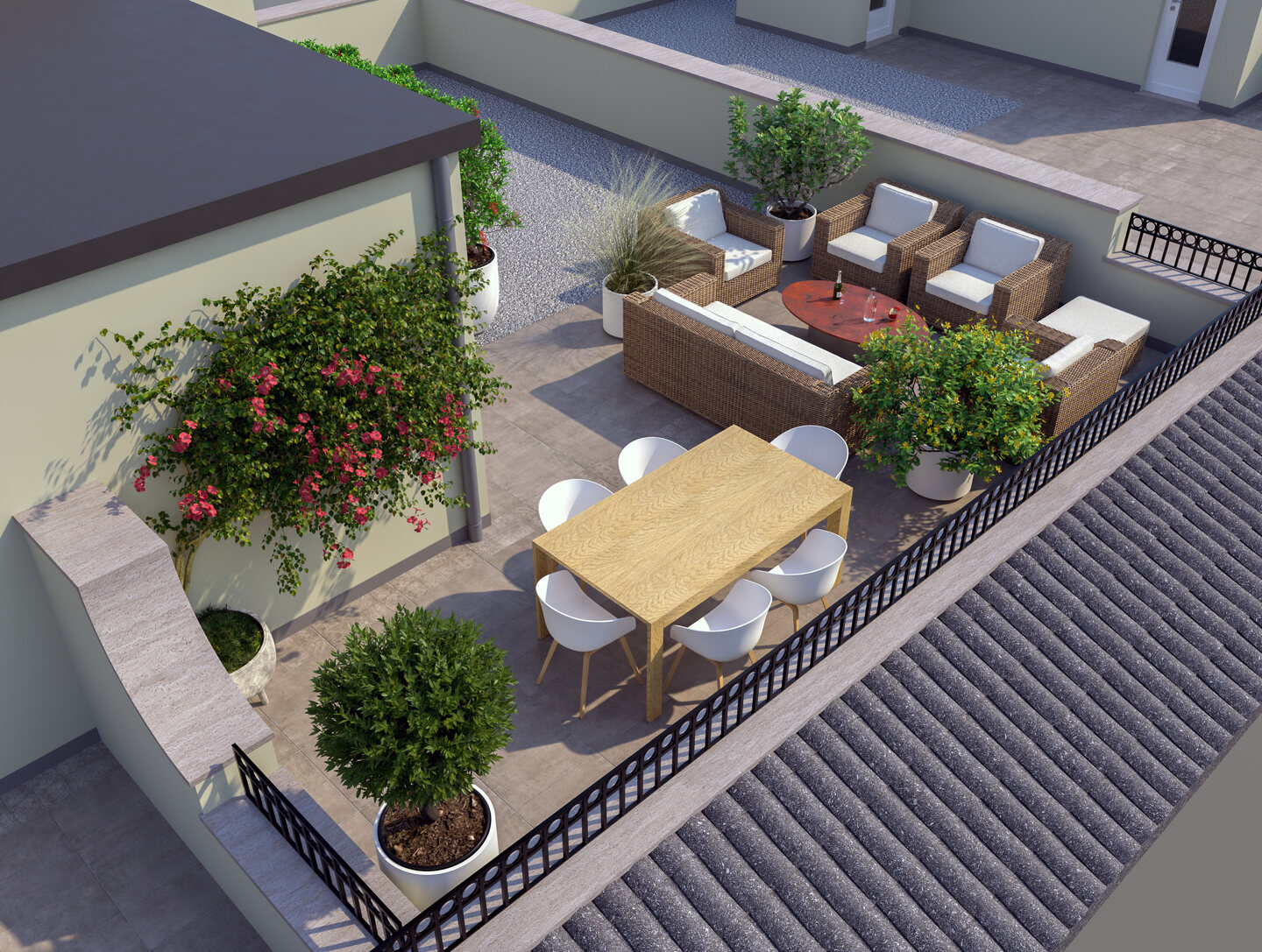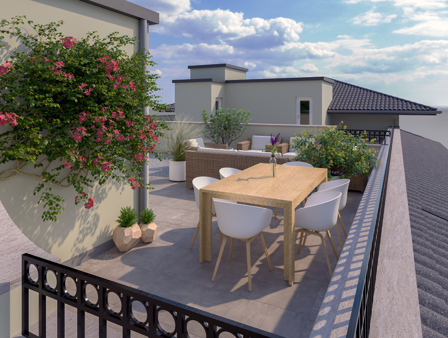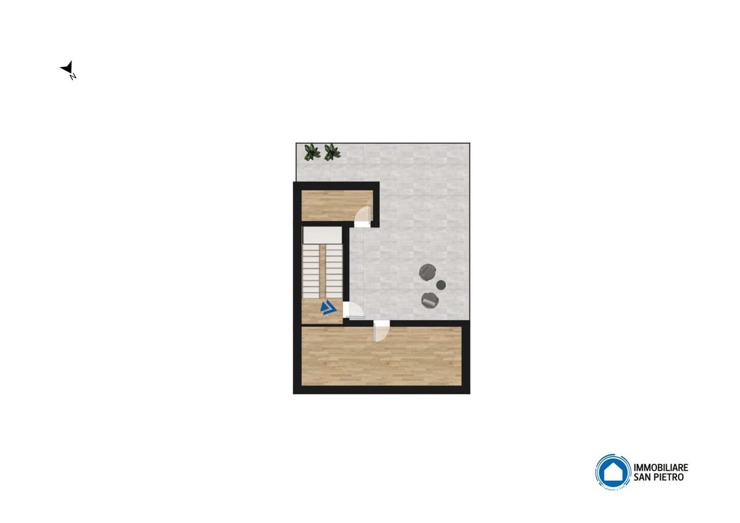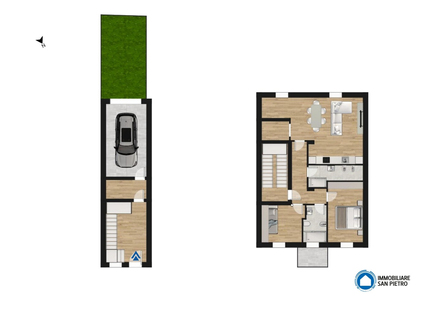 Appartamento situato al piano secondo, sviluppato su due livelli con ingresso indipendente e composto da soggiorno con angolo cottura, disimpegno, 2 camere da letto, 2 bagni, ambiente pluriuso e terrazzo al piano terzo. A completare la proprietà garage, posto auto e corte privata al piano terra.