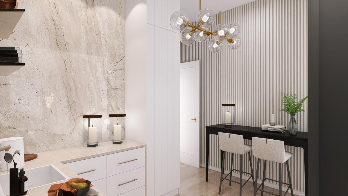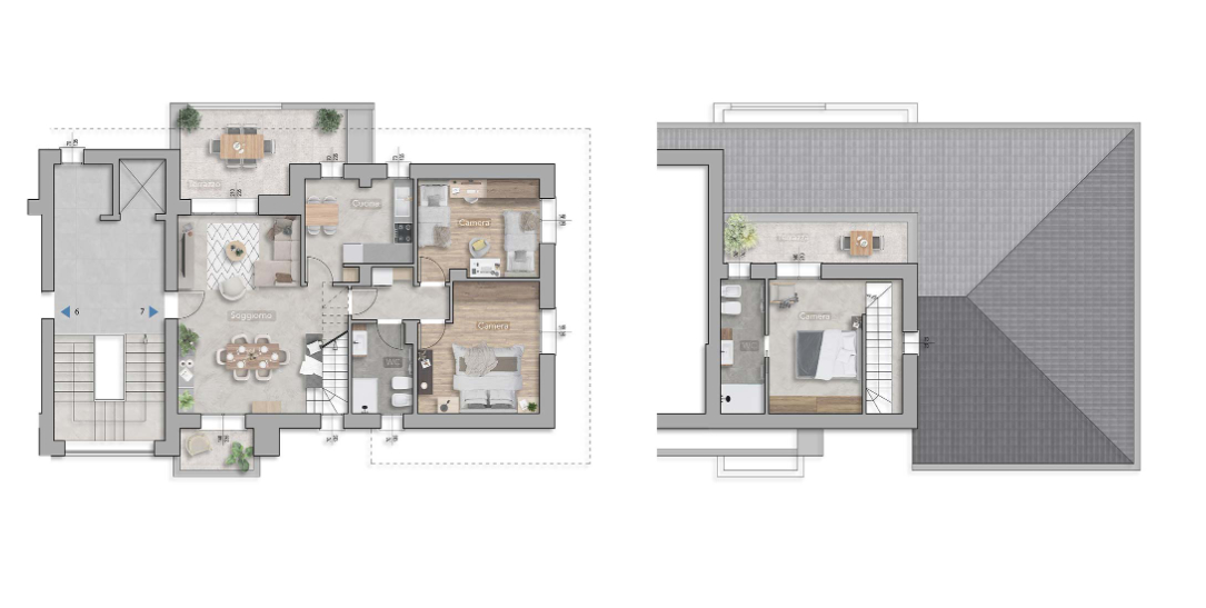 Il primo livello si apre su un generoso soggiorno con cucina separata ed accesso diretto a due terrazzi. La zona notte, ben organizzata, comprende una camera matrimoniale, una spaziosa camera doppia ed un bagno finestrato.