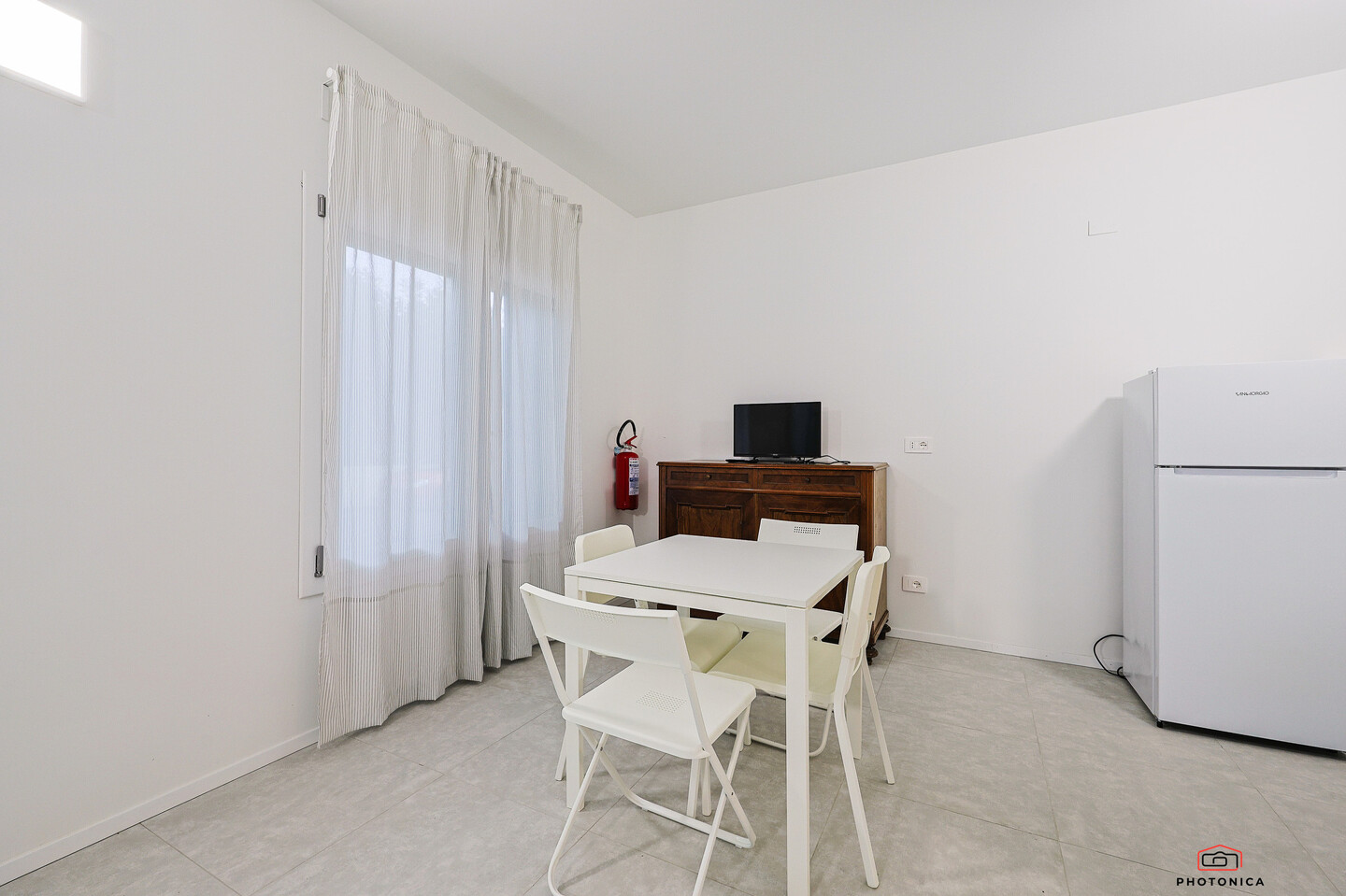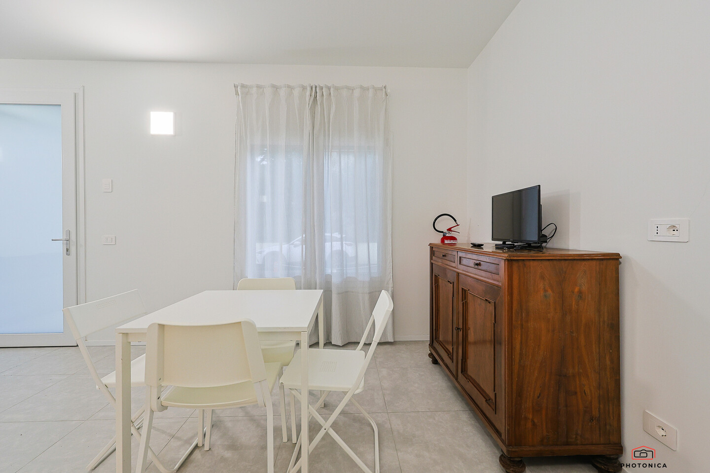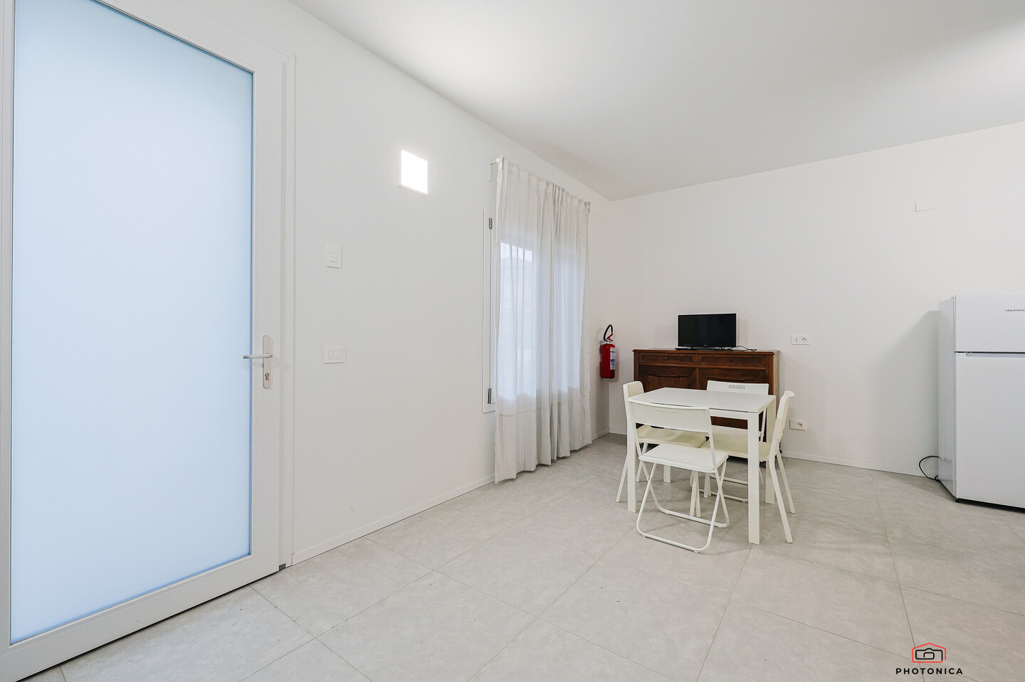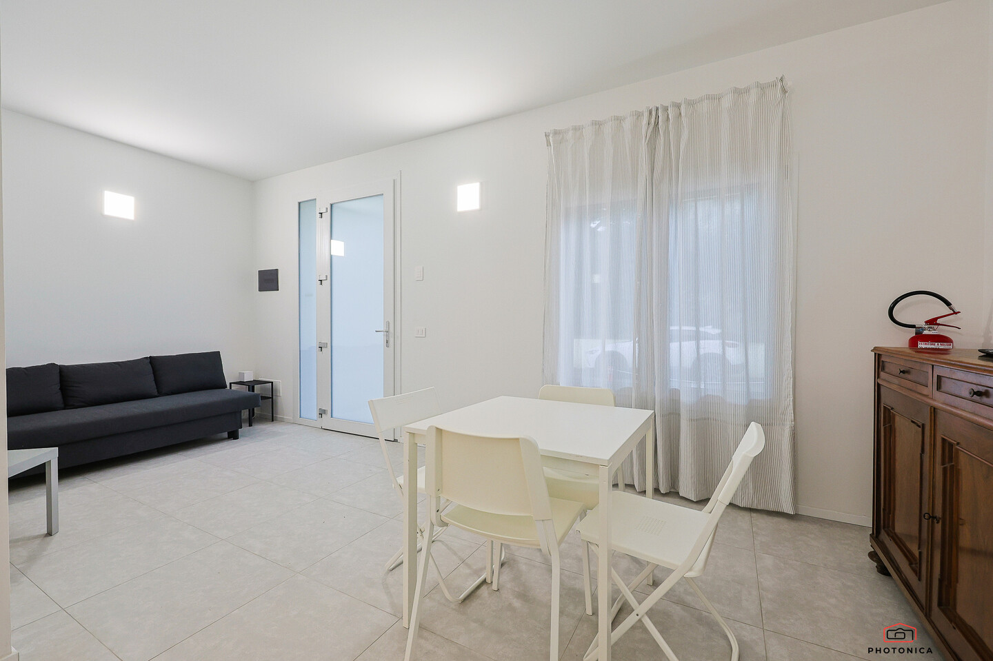 L’appartamento è al piano terra ed è composto da un luminoso soggiorno con un pratico cucinotto in nicchia, una camera matrimoniale spaziosa e un bagno moderno con box doccia.