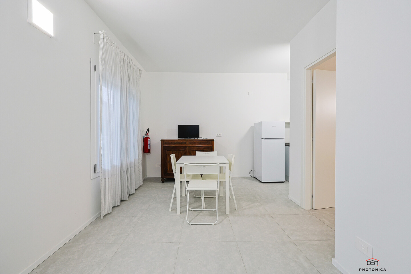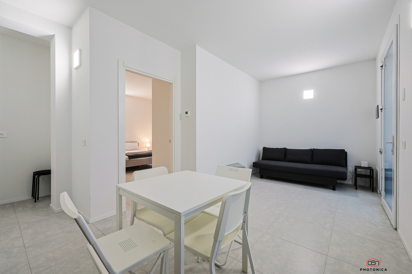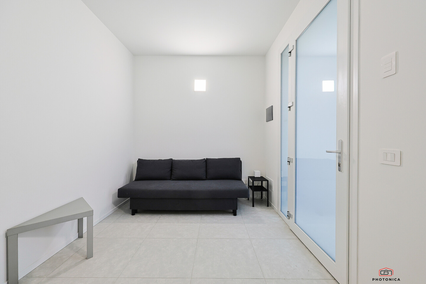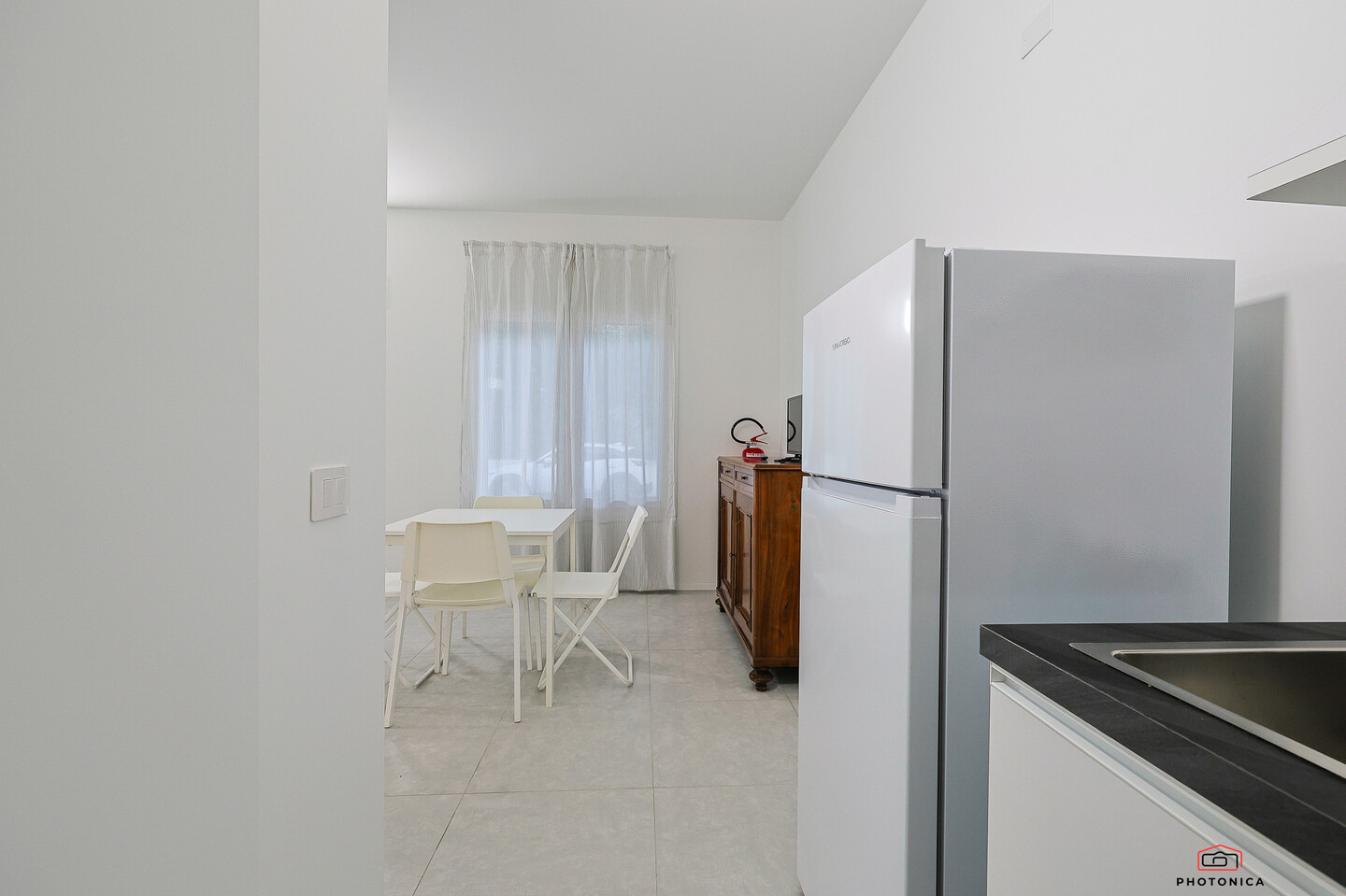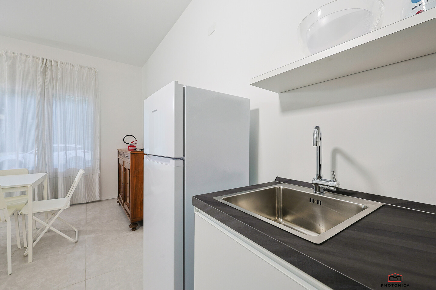 L’appartamento è al piano terra ed è composto da un luminoso soggiorno con un pratico cucinotto in nicchia, una camera matrimoniale spaziosa e un bagno moderno con box doccia.