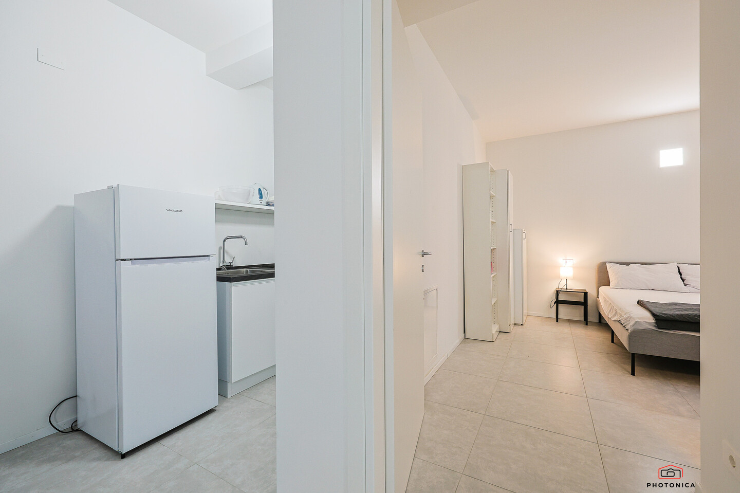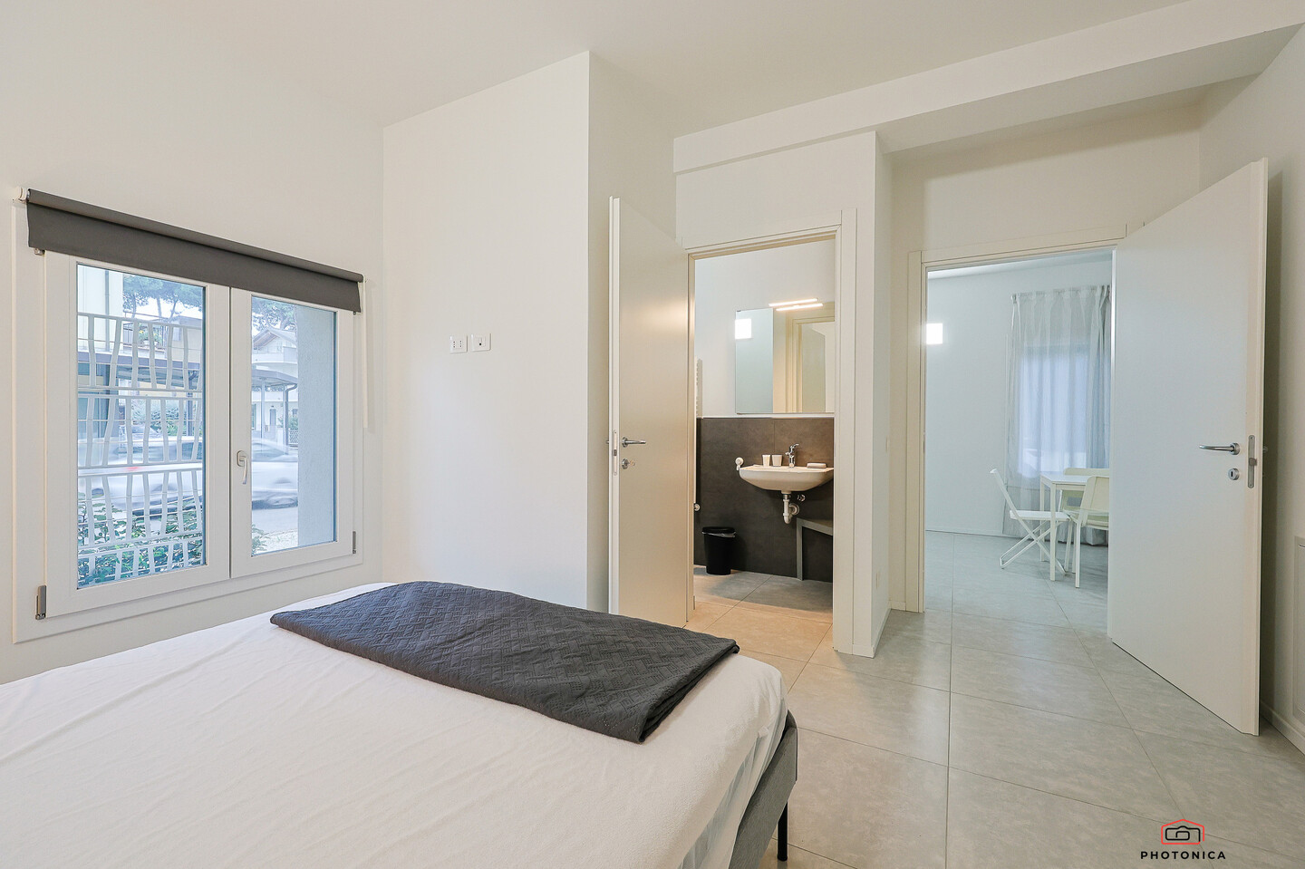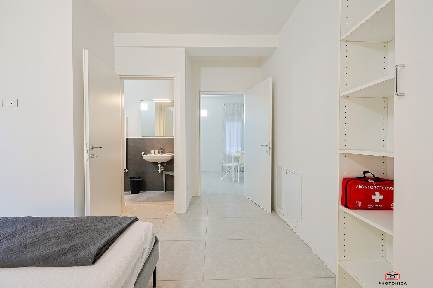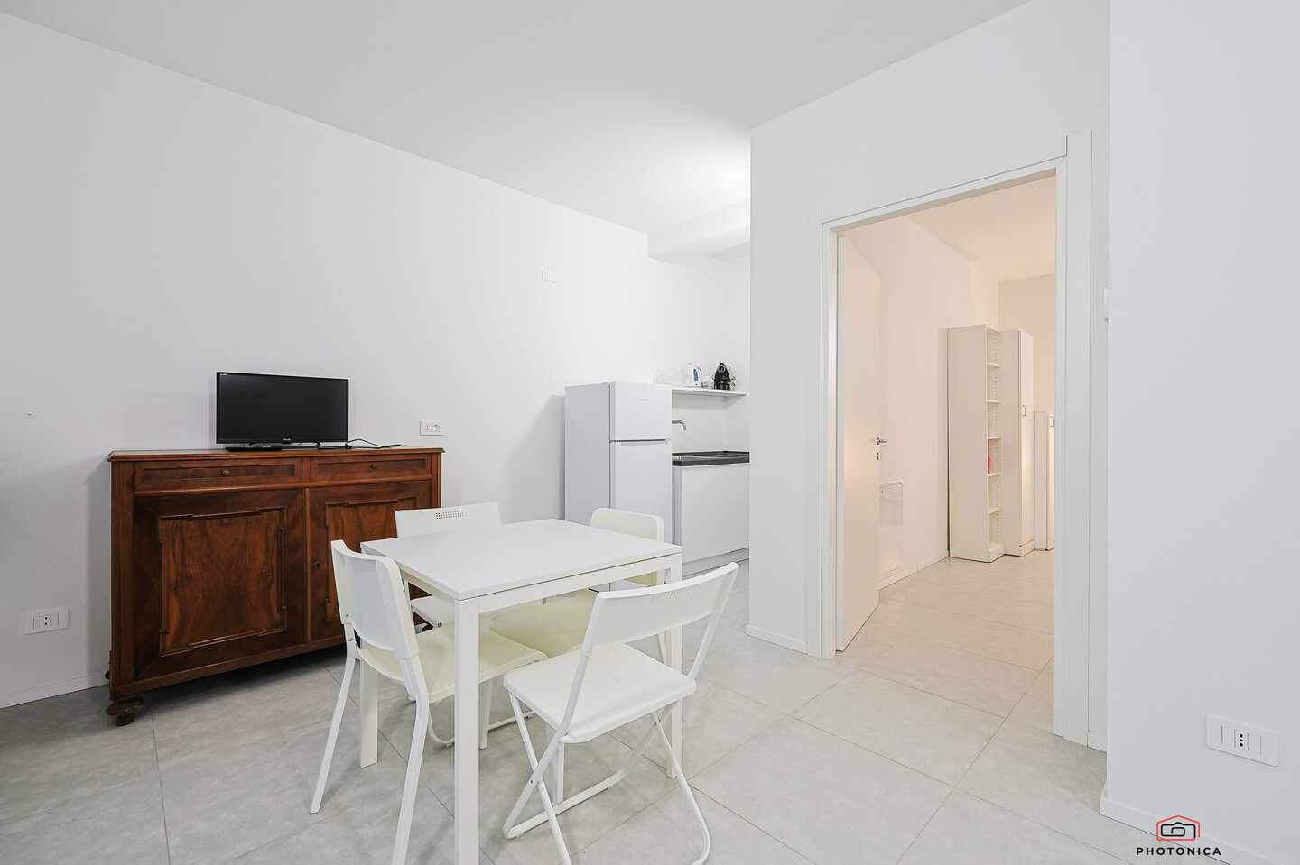 L’appartamento è al piano terra ed è composto da un luminoso soggiorno con un pratico cucinotto in nicchia, una camera matrimoniale spaziosa e un bagno moderno con box doccia.