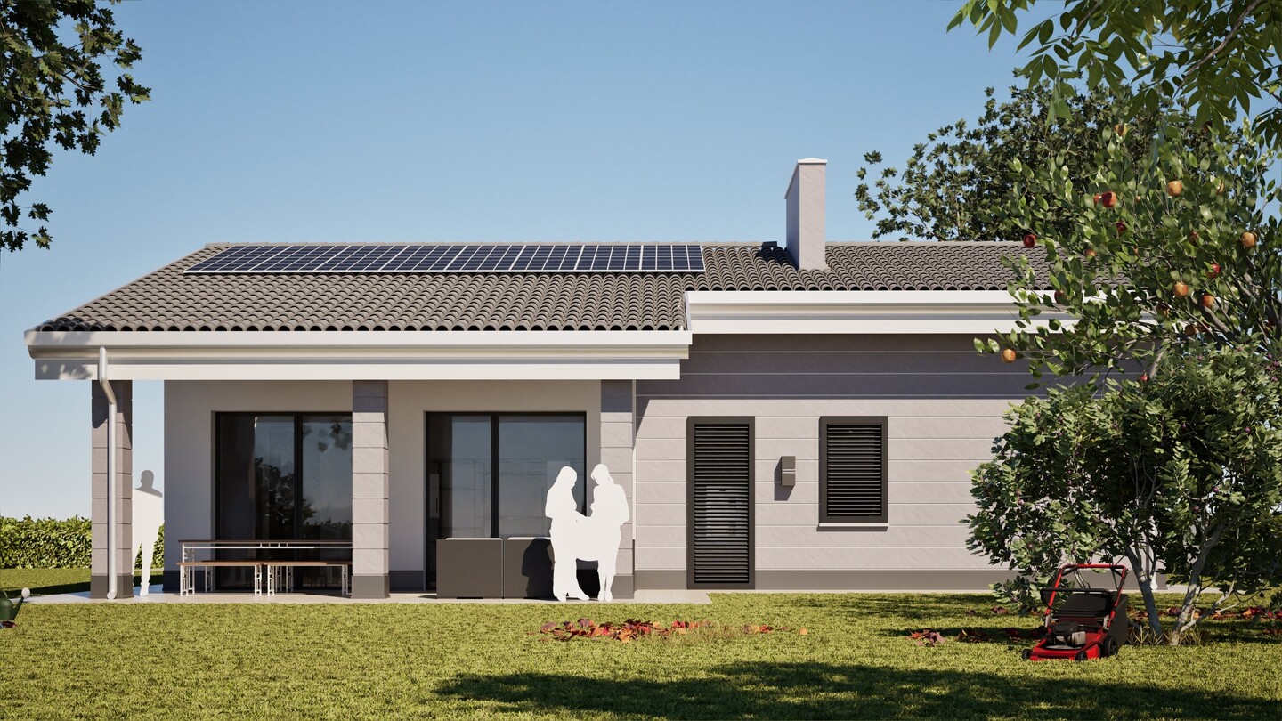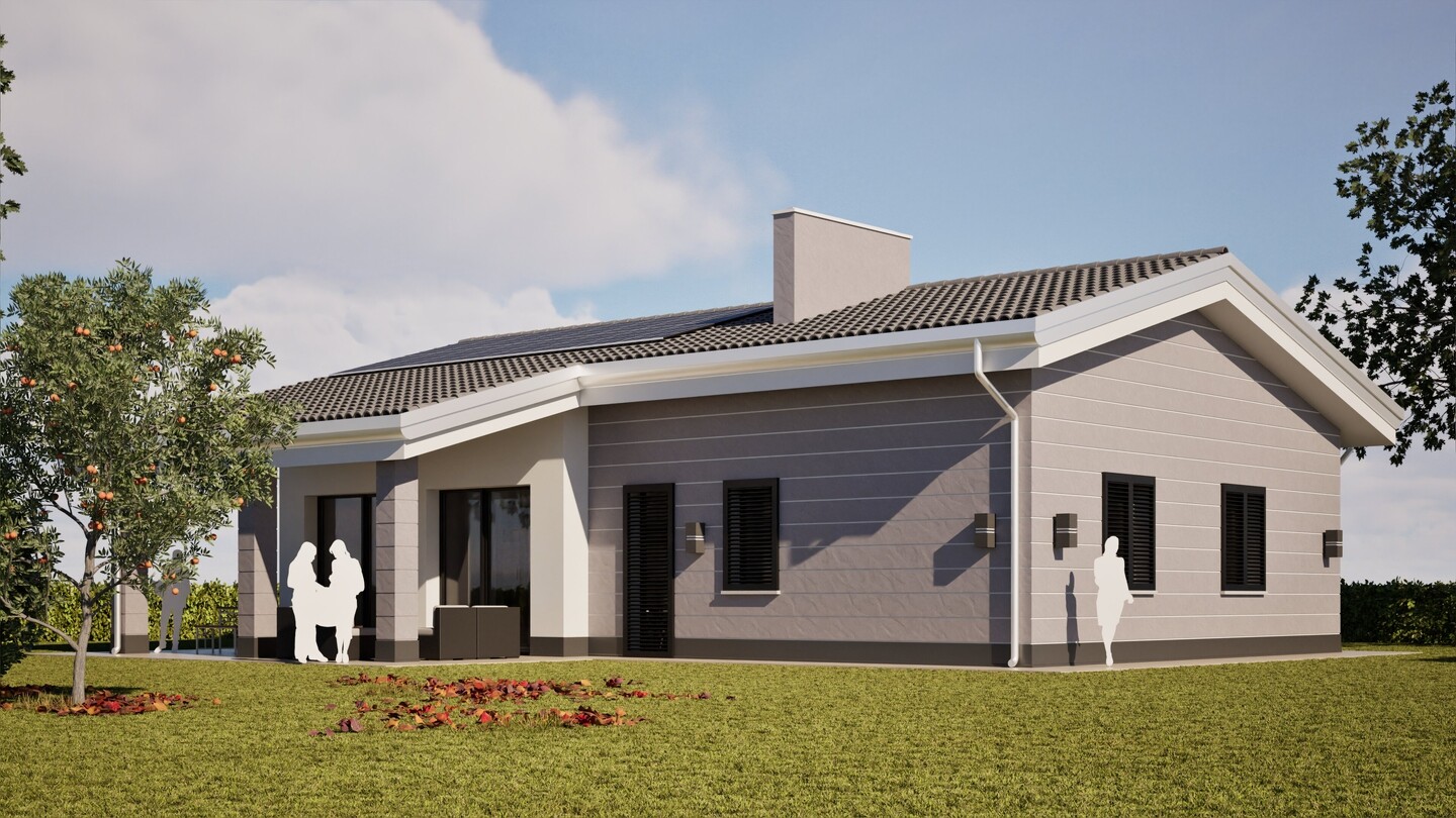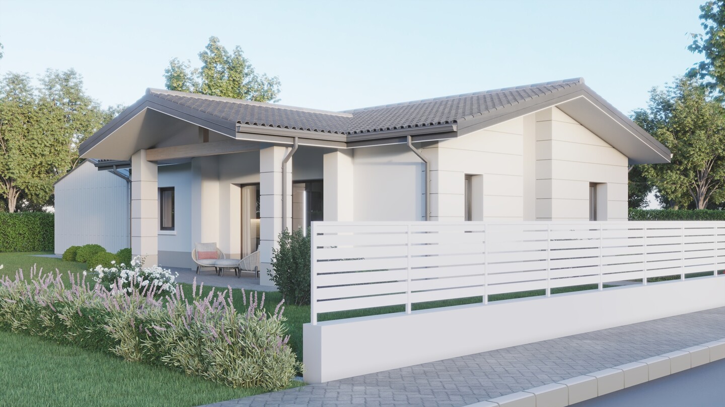 Villa unifamiliare totalmente sviluppata al piano terra, composta da ingresso su disimpegno, cucina abitabile, soggiorno, tre camere da letto e due bagni. A completare la proprietà vi sono un garage doppio, un portico esterno e un giardino di proprietà. La disposizione degli ambienti può essere personalizzata secondo le esigenze.