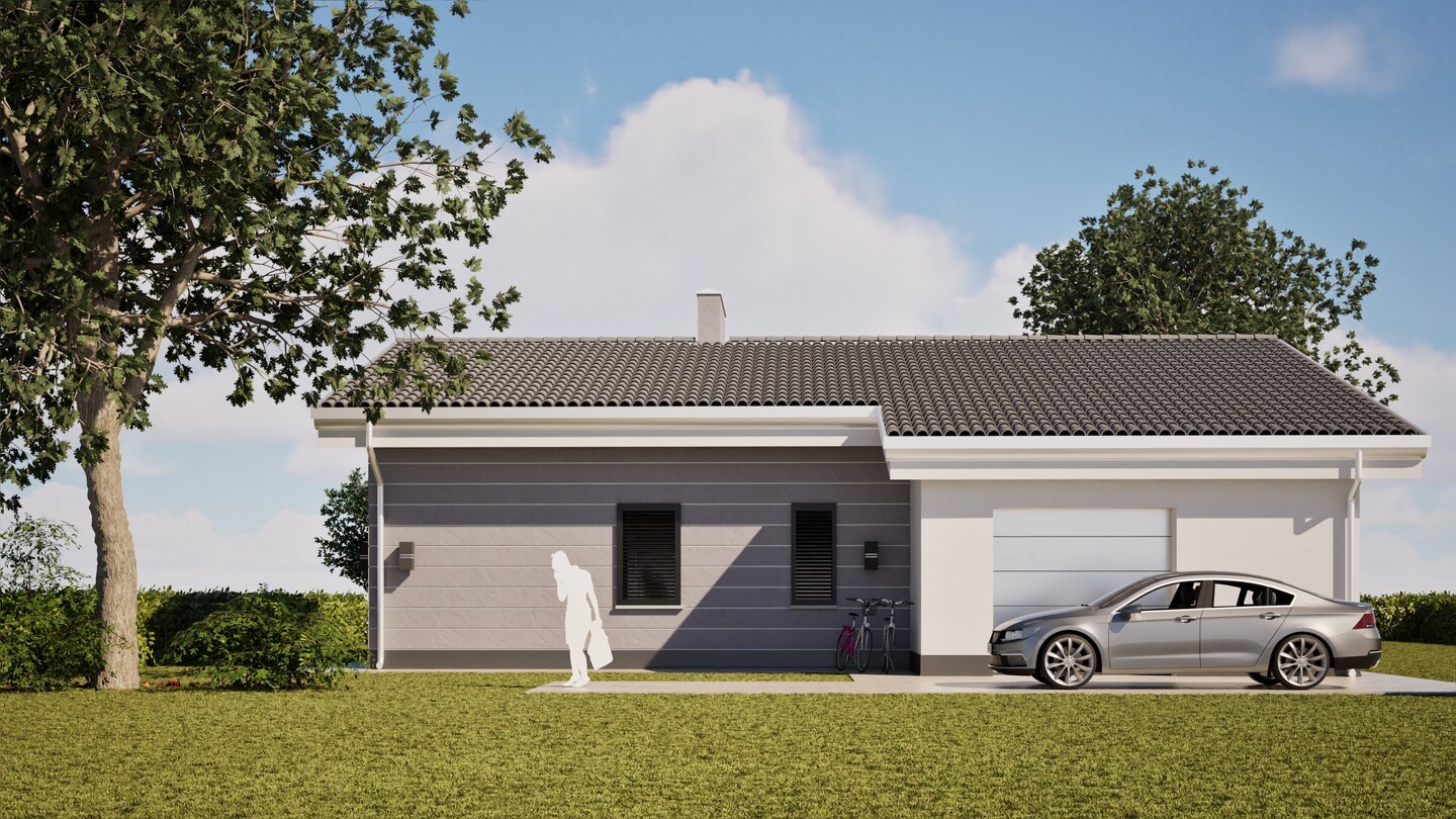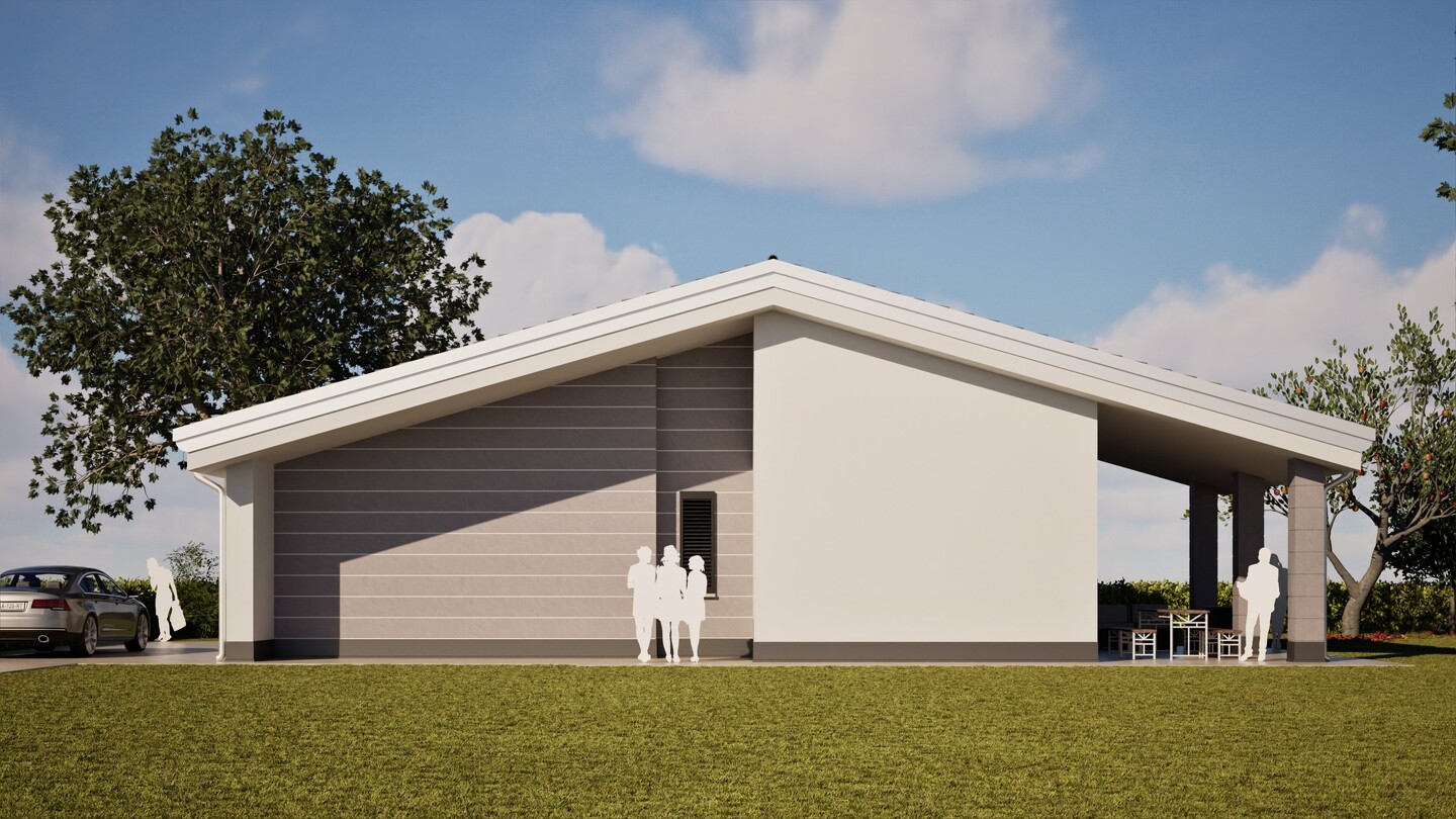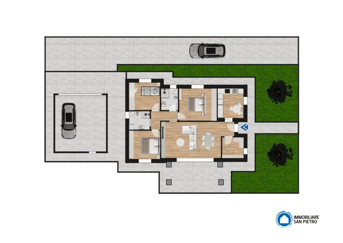 Villa unifamiliare totalmente sviluppata al piano terra, composta da ingresso su disimpegno, cucina abitabile, soggiorno, tre camere da letto e due bagni. A completare la proprietà vi sono un garage doppio, un portico esterno e un giardino di proprietà. La disposizione degli ambienti può essere personalizzata secondo le esigenze.
