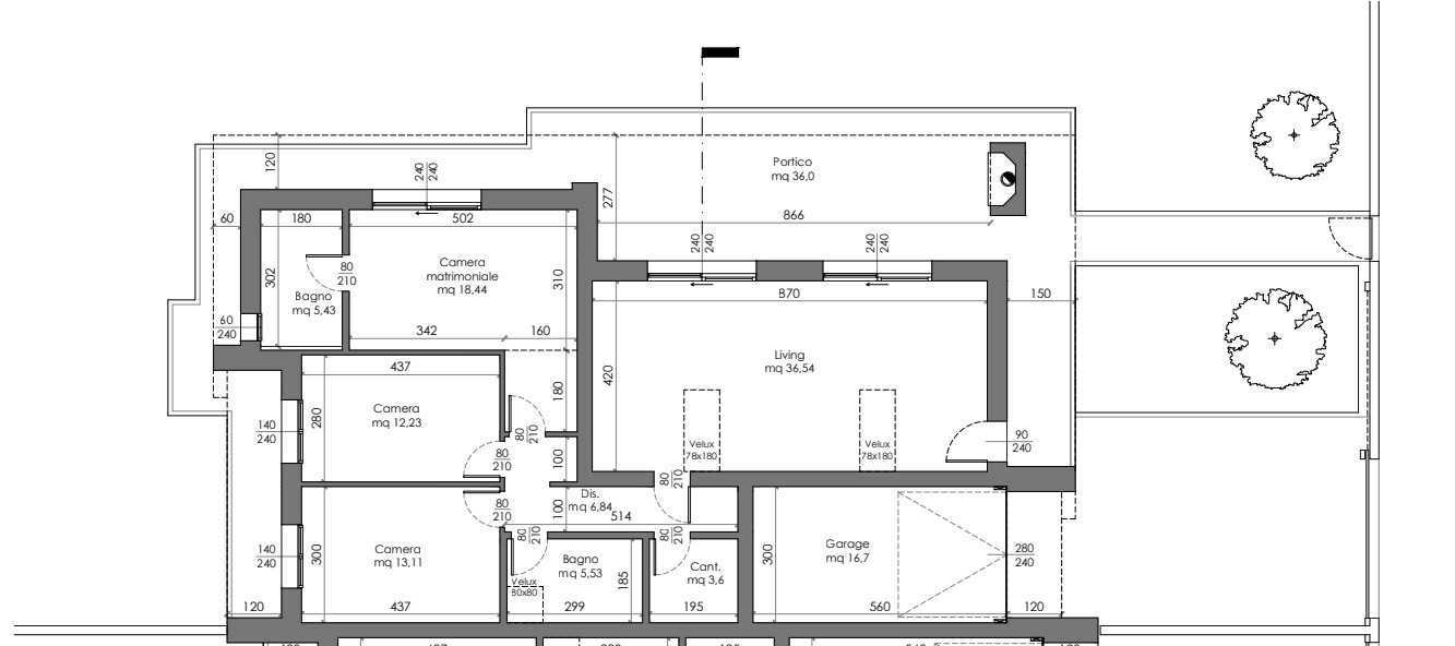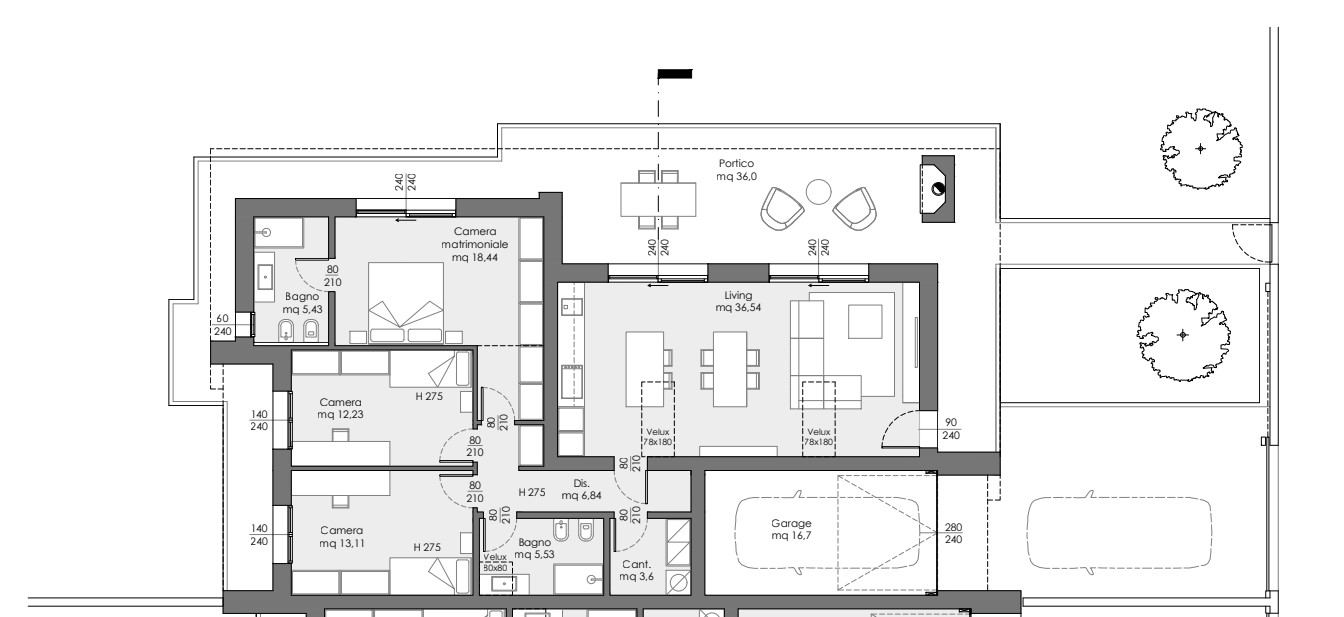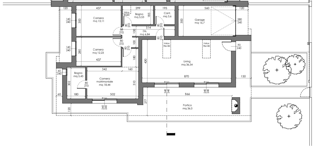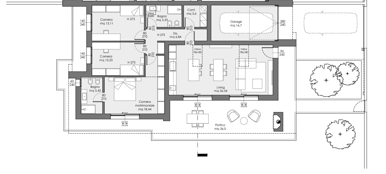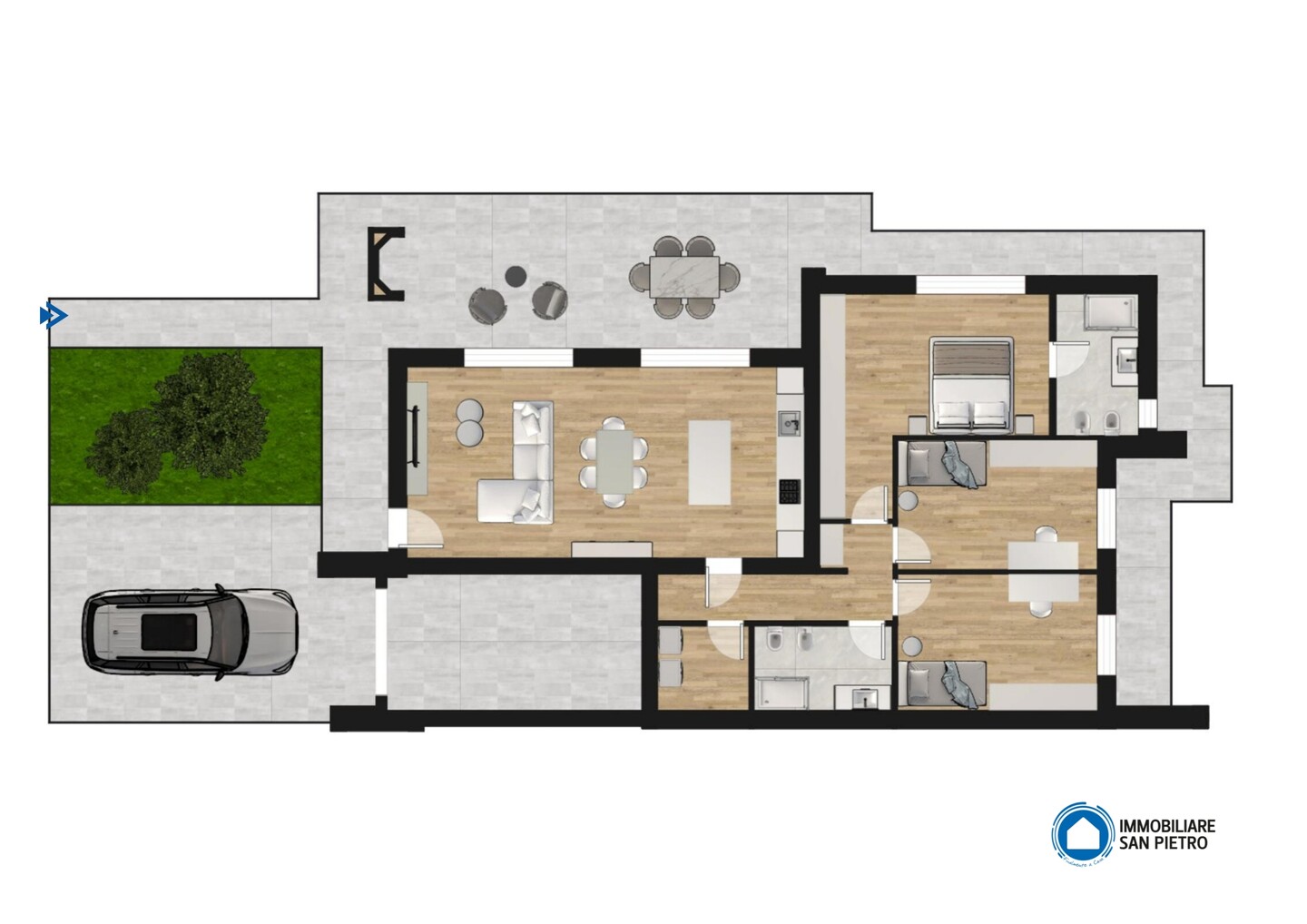 L’ingresso si apre su un luminoso soggiorno di circa 37 mq con cucina a vista, mentre la zona notte comprende 2 camere doppie di circa 13 mq ciascuna, un bagno finestrato con velux e 1 camera matrimoniale di circa 18 mq dotata di bagno privato con doccia. A completare la disposizione interna, una cantina con angolo lavanderia e un garage singolo di 17 mq, con davanti uno spazio per un ulteriore posto auto esterno all’interno della proprietà.