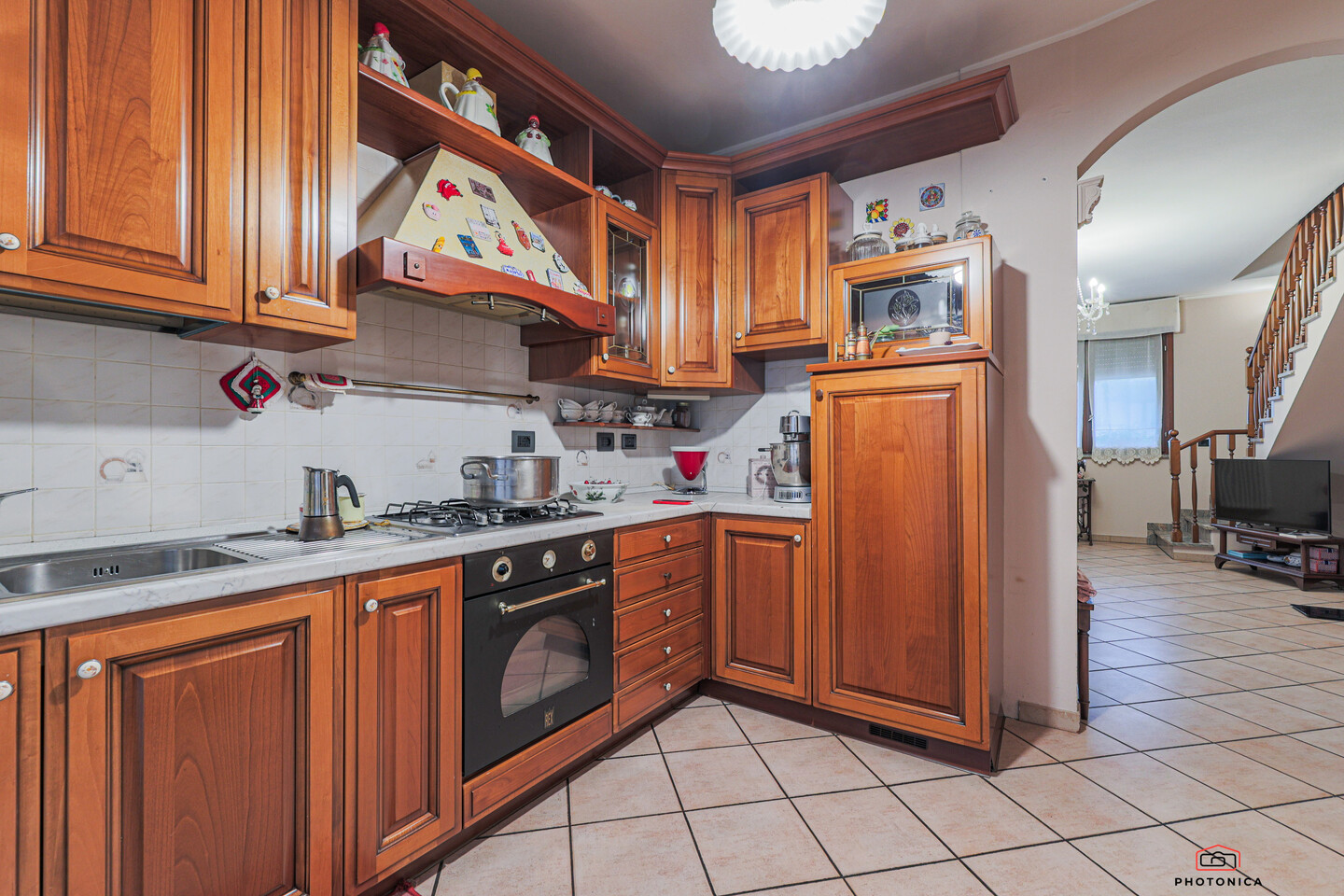Il primo piano ospita una luminosa zona giorno composta da soggiorno, cucina separata e un bagno di servizio.