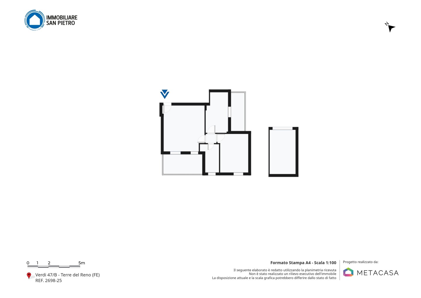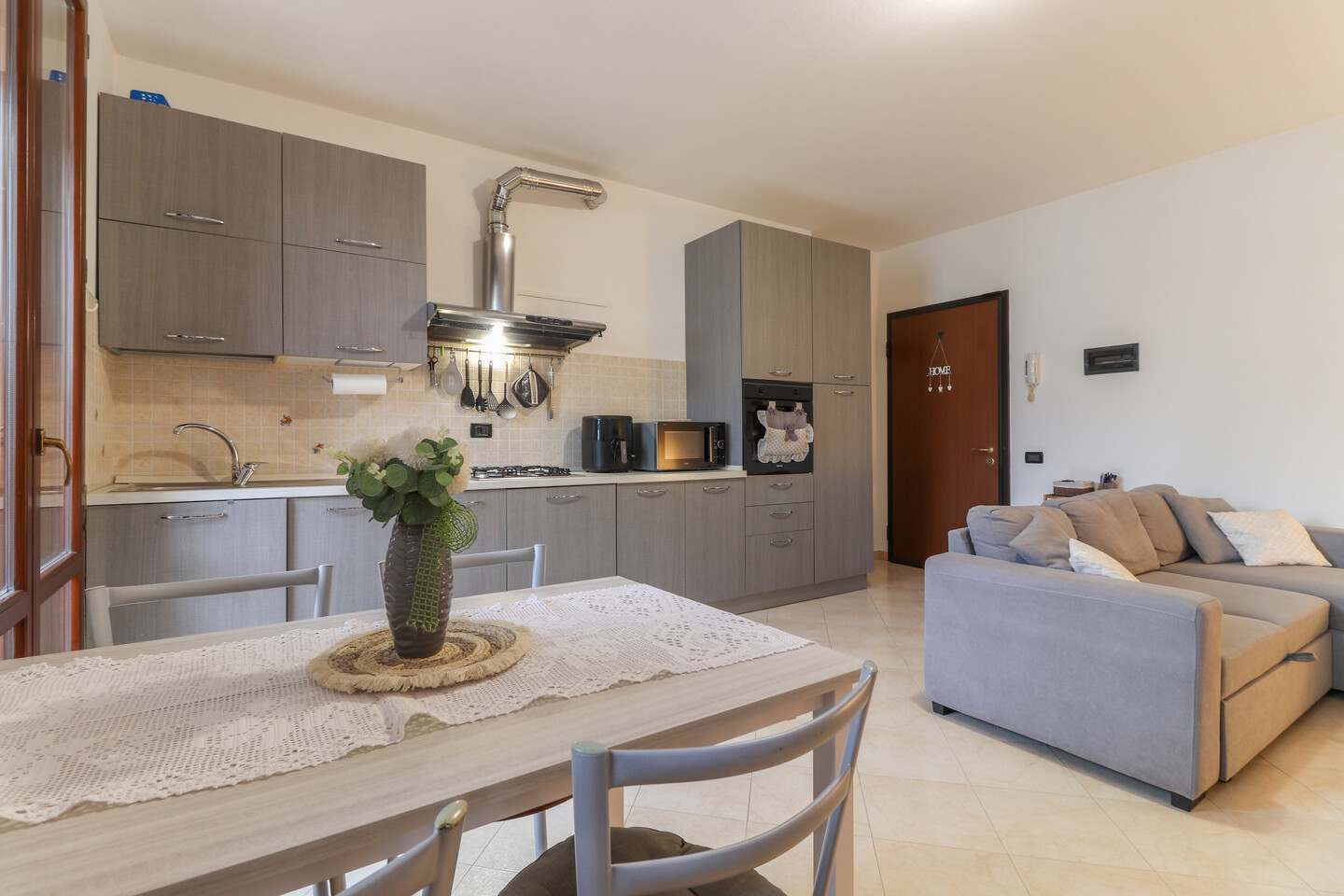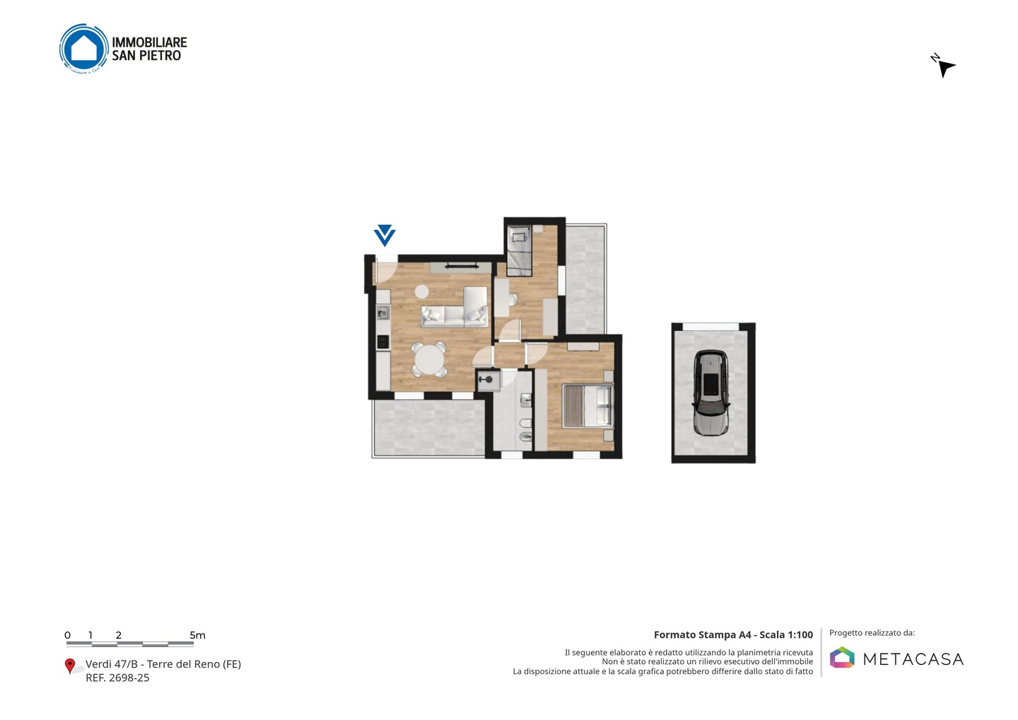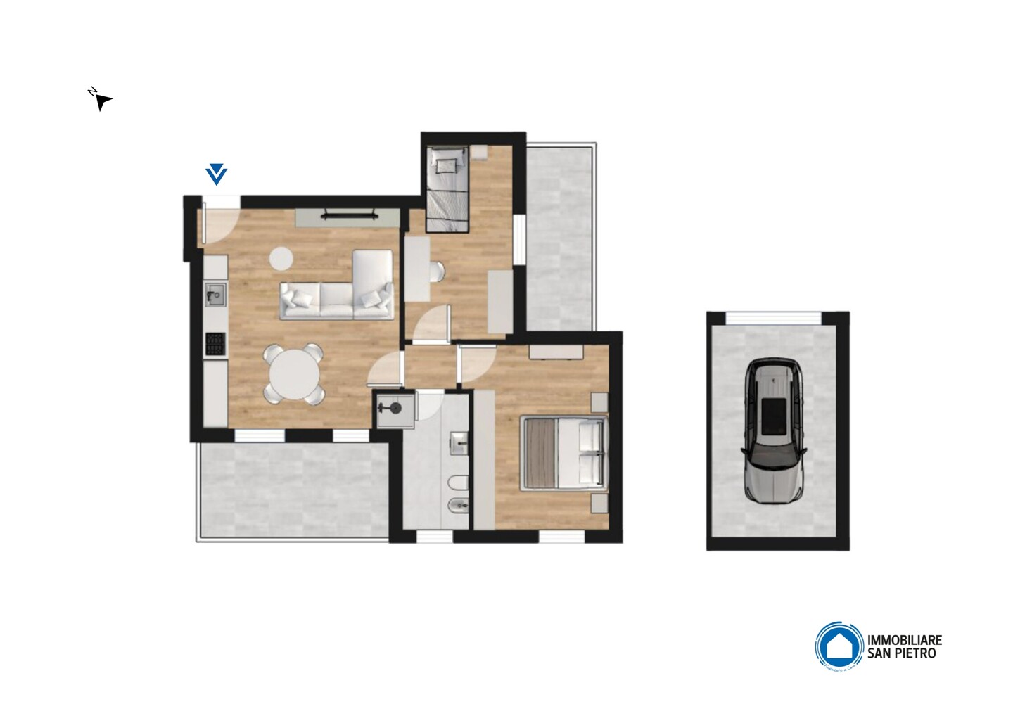 Al primo ed ultimo piano troviamo l’ingresso su soggiorno con angolo cottura e accesso al primo terrazzo abitabile, disimpegno, camera matrimoniale, camera singola con accesso al secondo terrazzino, bagno con box doccia. Al piano terra ampia autorimessa con buoni spazi esterni di manovra.