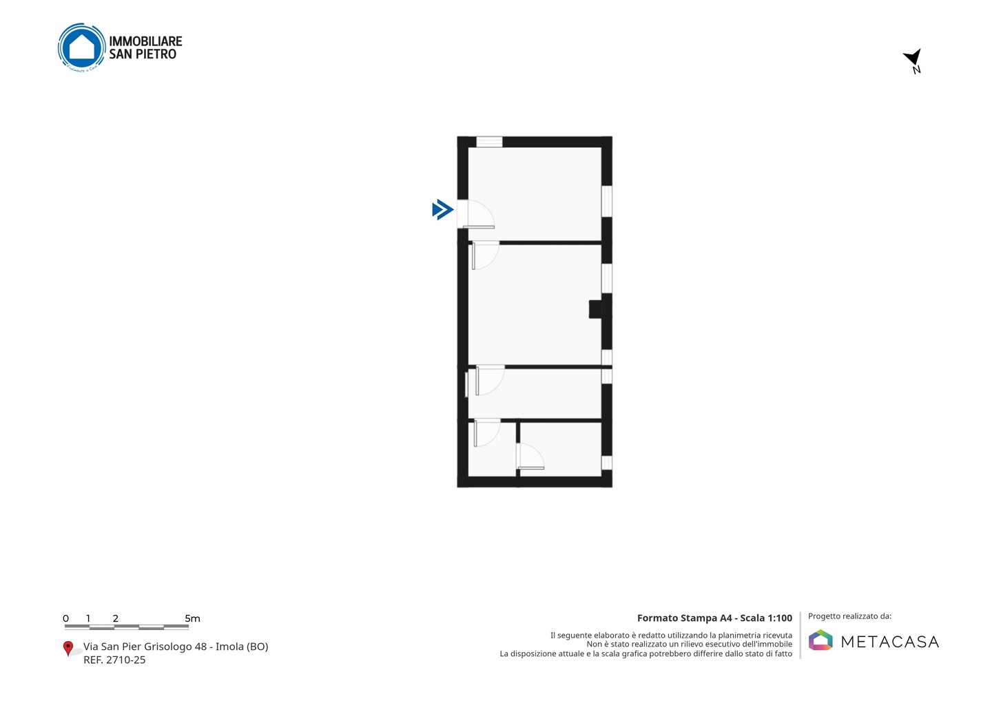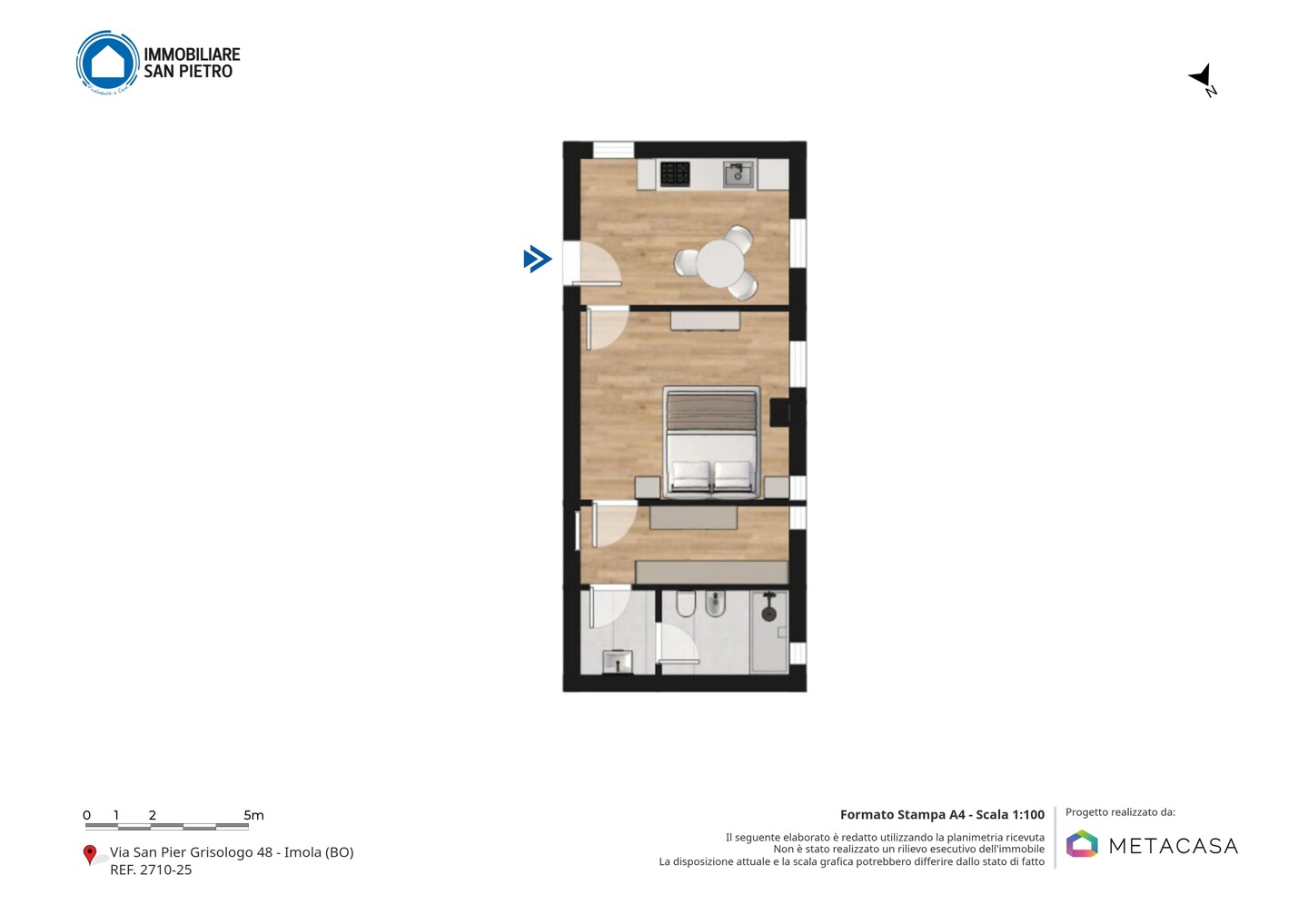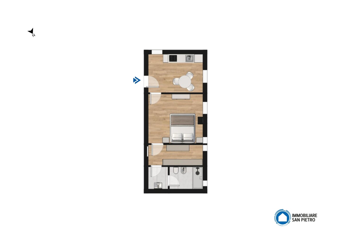 L’appartamento si compone di ingresso su cucina abitabile, la camera da letto si trova in un ambiente separato composto anche da una vano utilizzabile come cabina armadio. Completa la proprietà un comodo bagno con doccia.
