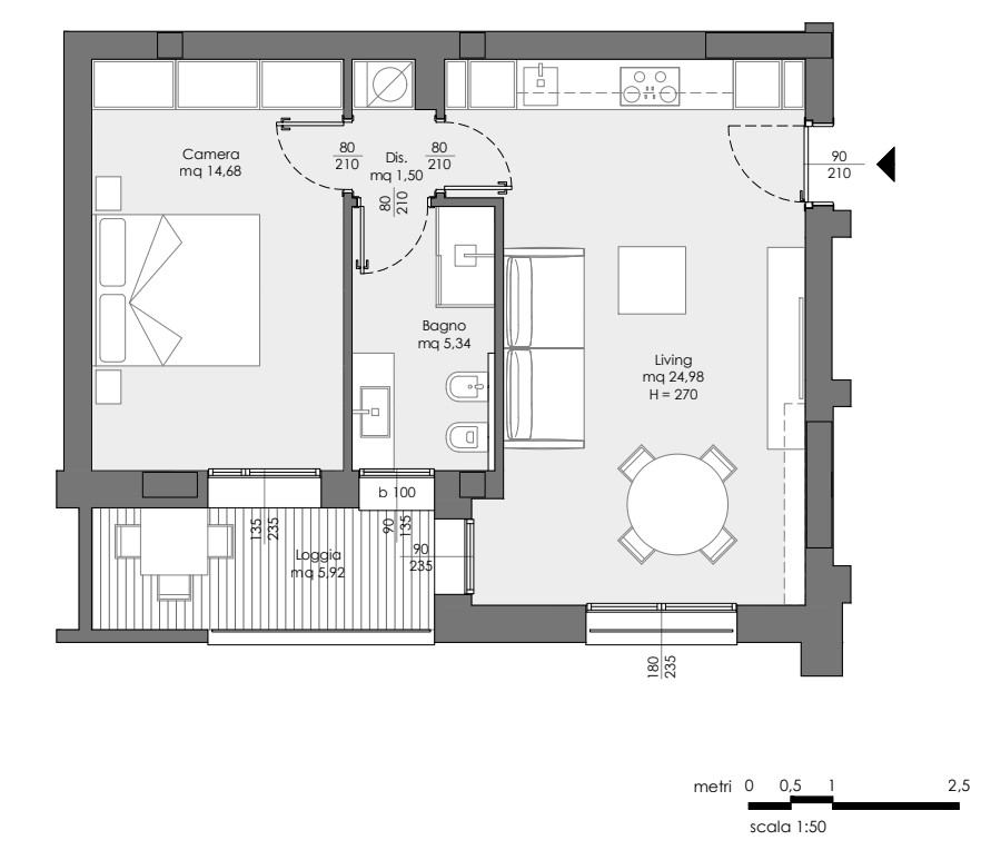 L’immobile è composto da ingresso sul soggiorno con angolo cottura, disimpegno notte, un bagno finestrato e una camera matrimoniale con accesso diretto al balcone loggiato, ideale per godere di uno spazio esterno coperto e riservato, e sarà dotato di riscaldamento a pavimento, porta d’ingresso blindata, infissi in PVC/doppio vetro, tapparelle elettriche in alluminio coibentato e zanzariere installate in tutti gli ambienti.