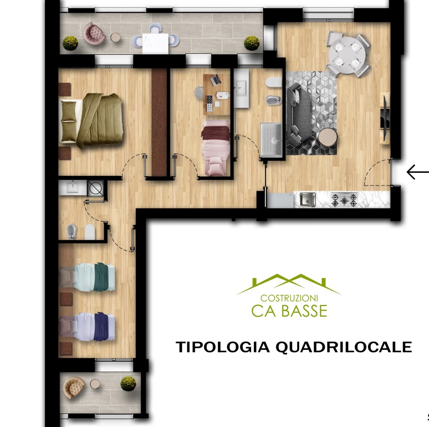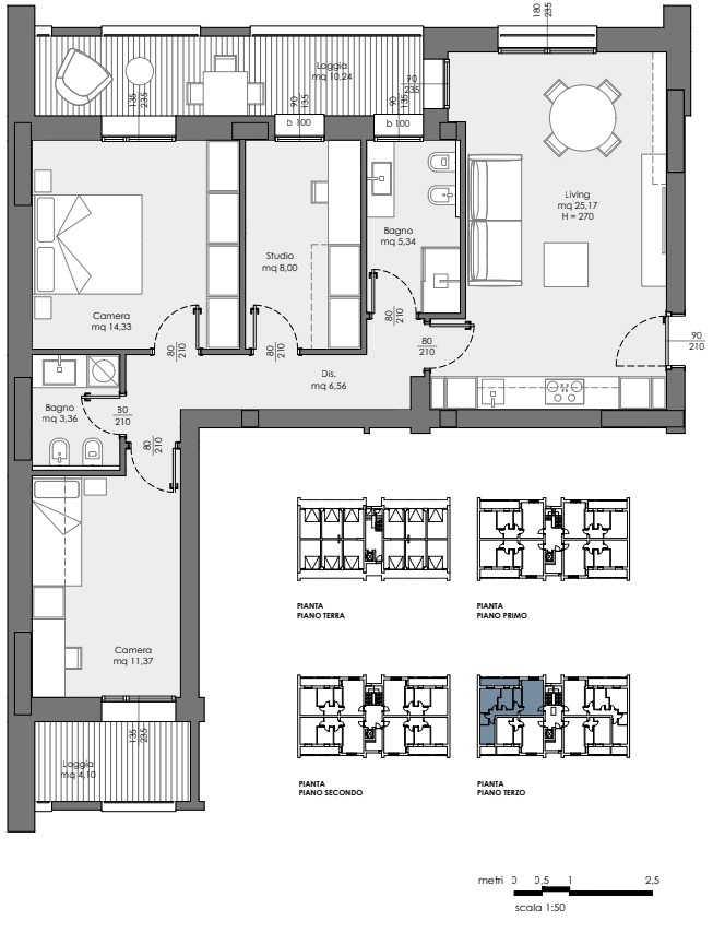 Ogni appartamento è composto da ingresso sul soggiorno con angolo cottura, disimpegno, un bagno finestrato, una camera matrimoniale ed una camera singola o studio, entrambe con accesso diretto al primo ampio balcone loggiato, un secondo bagno/lavanderia ed una terza camera da letto doppia con accesso ad un altro balcone loggiato privato.