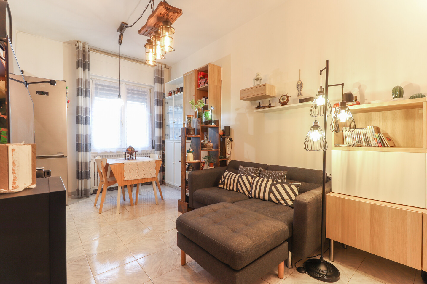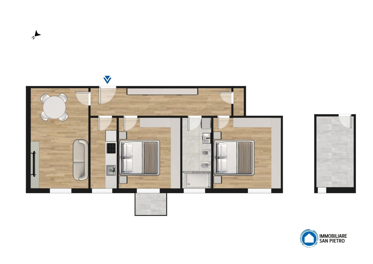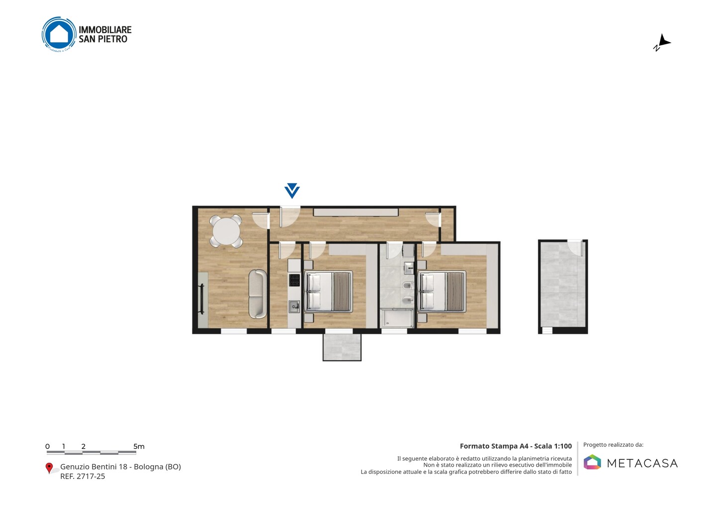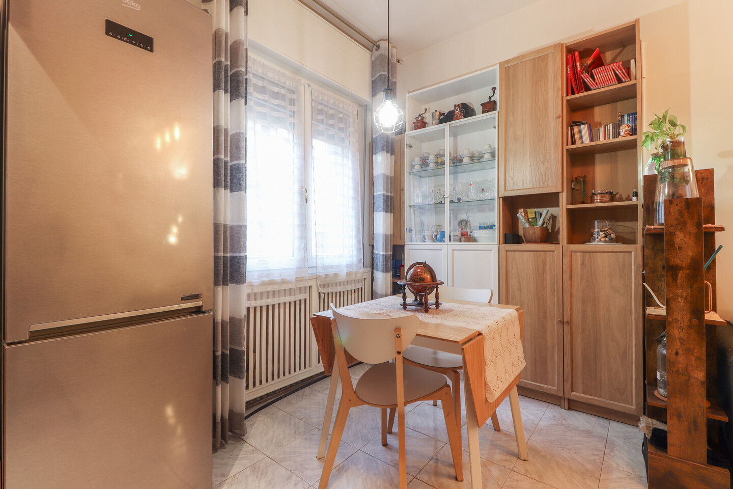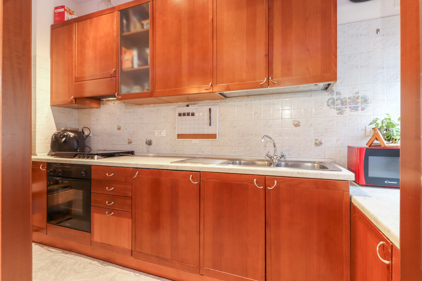 L’ingresso si apre su un luminoso soggiorno con cucinotto separato, perfetto per vivere la zona giorno in modo pratico e accogliente. Un comodo disimpegno conduce alla zona notte, dove trovano spazio due ampie camere matrimoniali, un bagno finemente rinnovato e un utile ripostiglio. L’appartamento, curato in ogni dettaglio, offre comfort e funzionalità in una posizione tranquilla e ben servita.