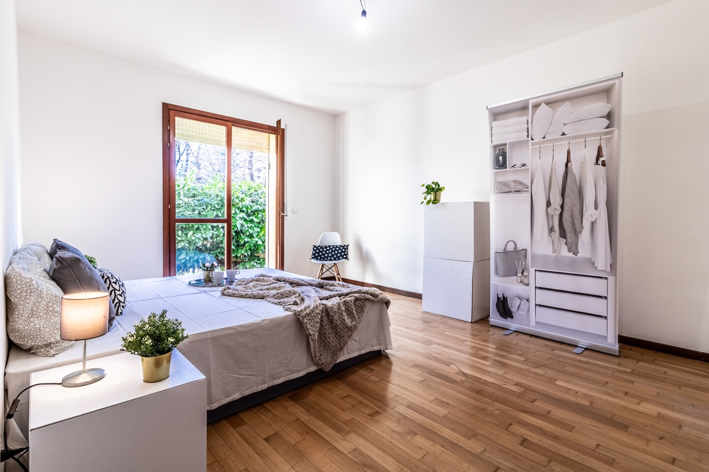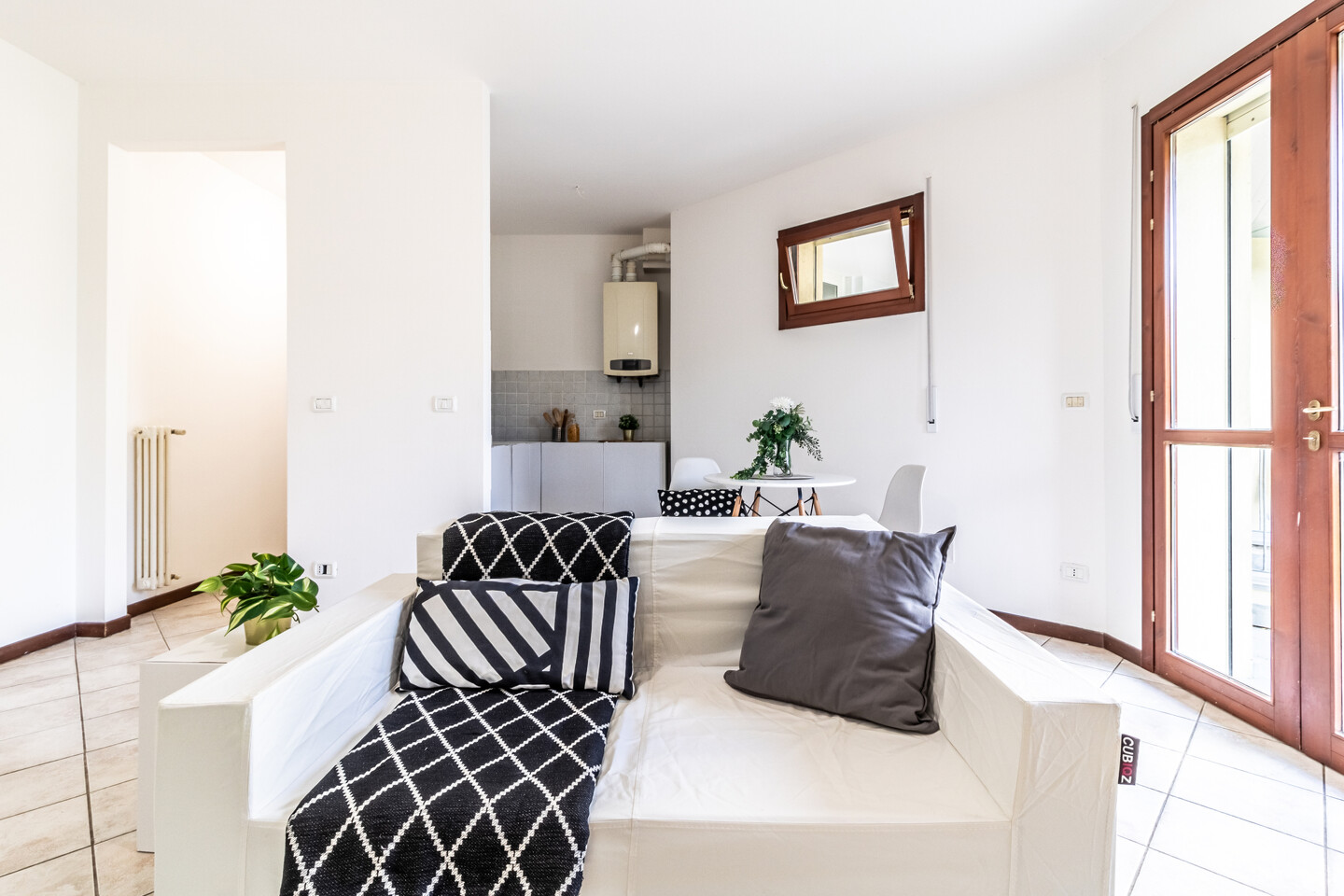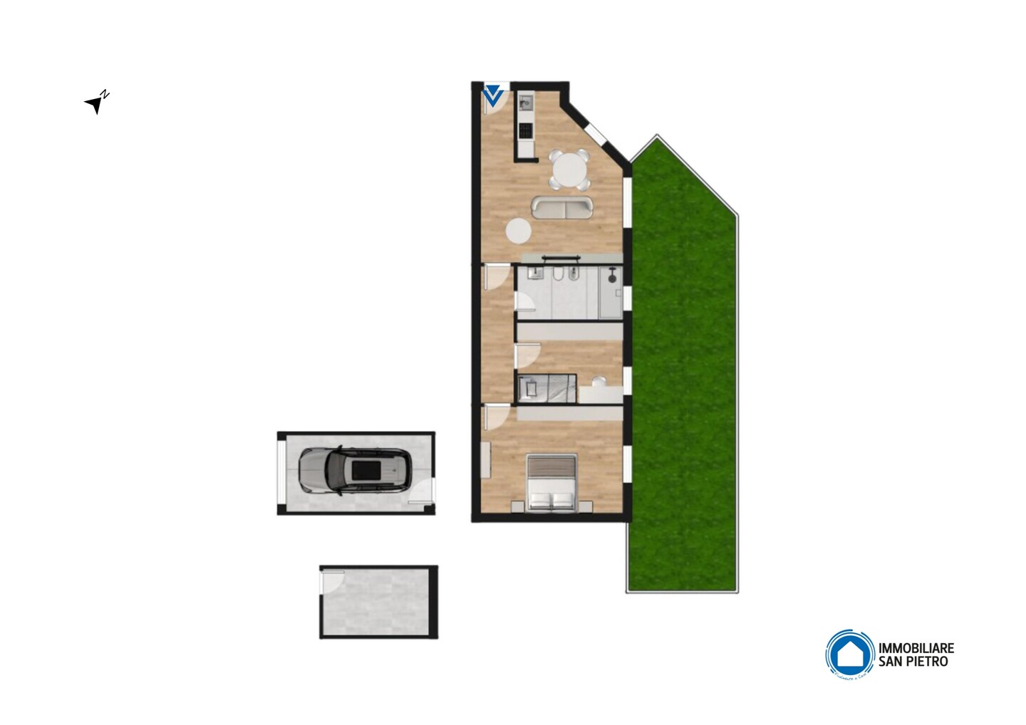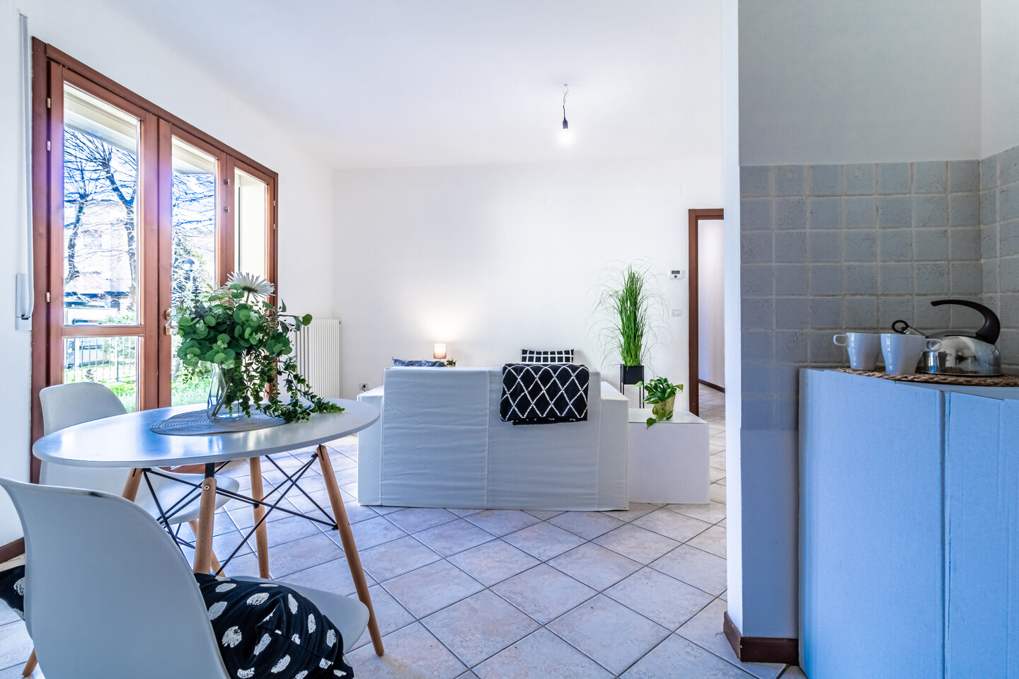 L’appartamento è posto al piano terra ed è composto da un soggiorno luminoso con angolo cottura, che affaccia su una corte esclusiva che permette di godere di uno spazio esterno privato, perfetto per rilassarsi all’aperto o come piccolo giardino. La zona notte comprende una camera matrimoniale, una camera singola e un ampio bagno finestrato con doccia. Completano la proprietà cantina e garage al piano interrato.