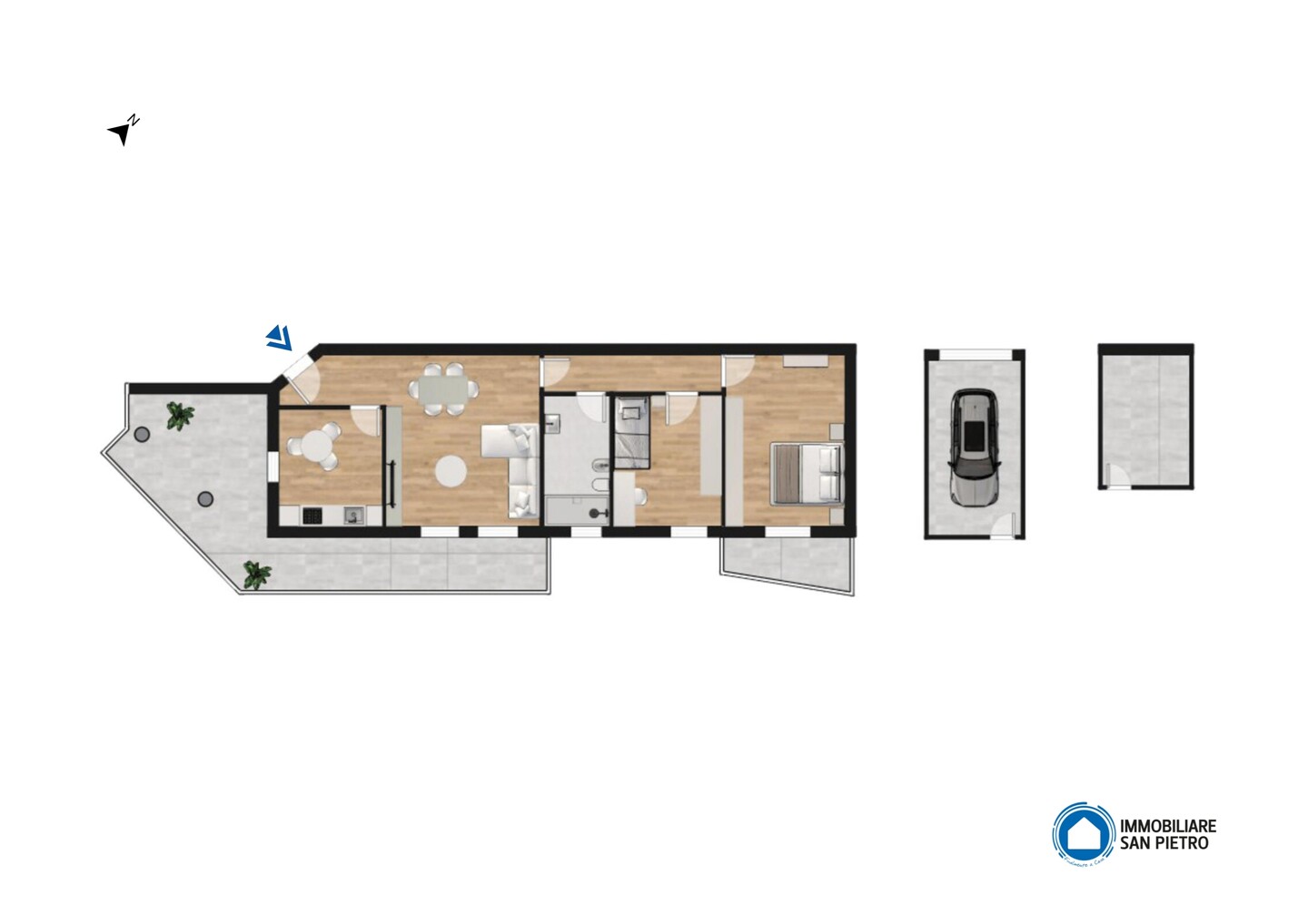 Appartamento al piano terra composto da ingresso, cucina abitabile con accesso al terrazzo, soggiorno, due camere da letto e un bagno. Completo di cantina e garage.