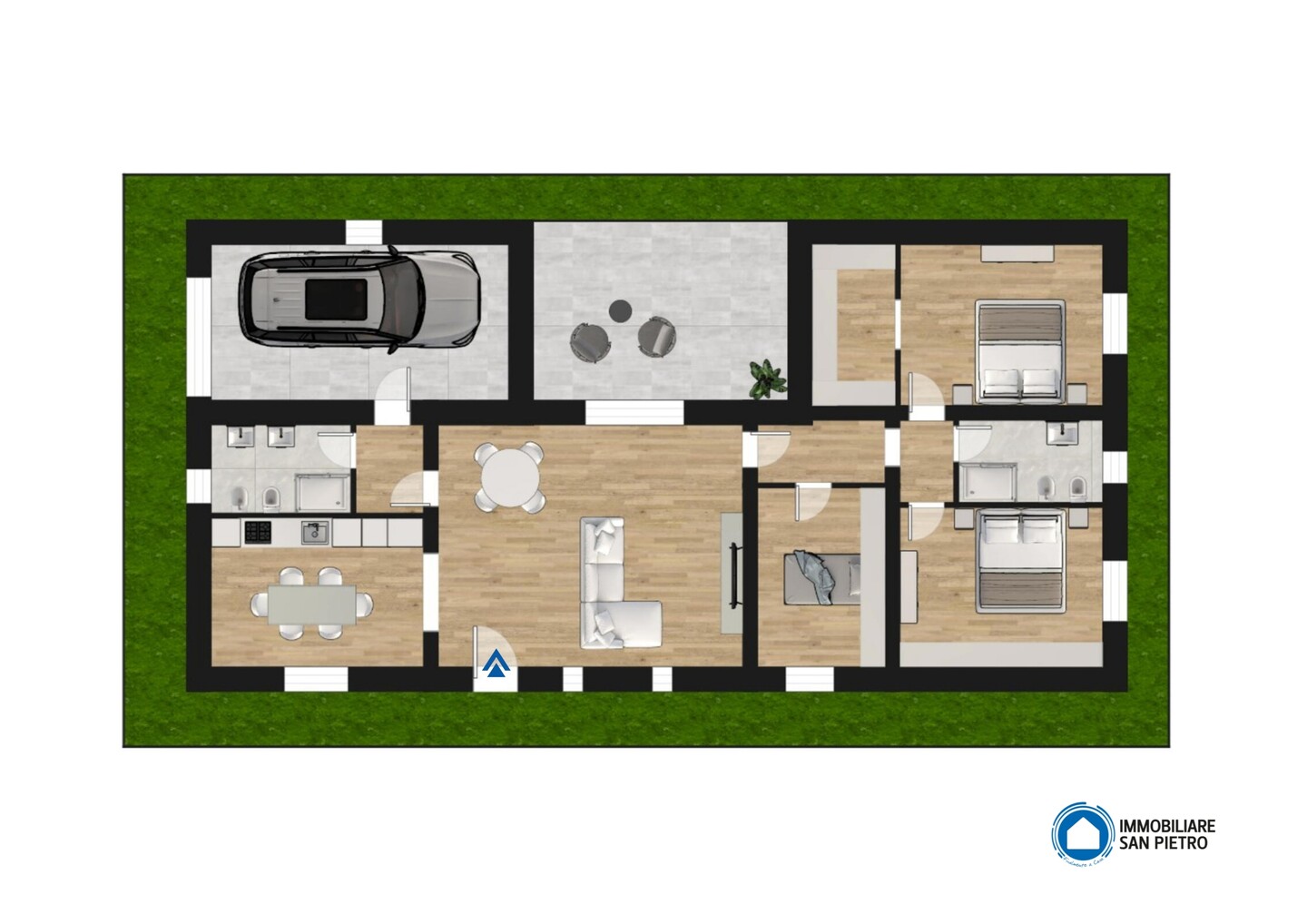 La villetta presenta una superficie di circa 110 mq calpestabili ed è sviluppata interamente al piano terra. L’ingresso si apre su un ampio soggiorno di circa 30 mq, molto luminoso grazie alla portafinestra doppia che consente l’accesso diretto al patio esterno pavimentato, ideale per pranzi o cene all’aperto, e al giardino. La cucina è separata e abitabile ed un disimpegno conduce al primo bagno finestrato con doccia e all’autorimessa. La zona notte è composta da 2 camere matrimoniali, di cui una con guardaroba, 1 camera singola e un secondo bagno anch’esso finestrato con doccia.