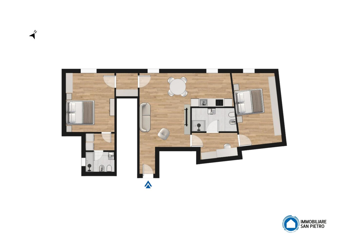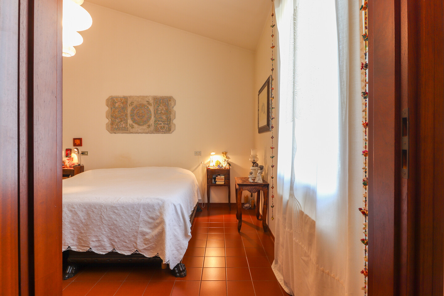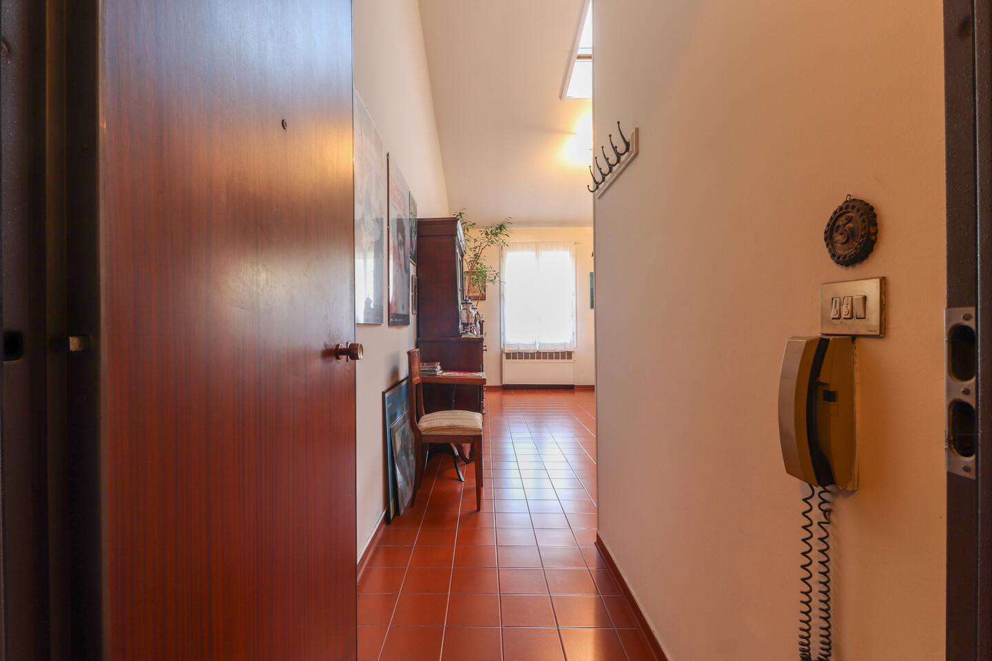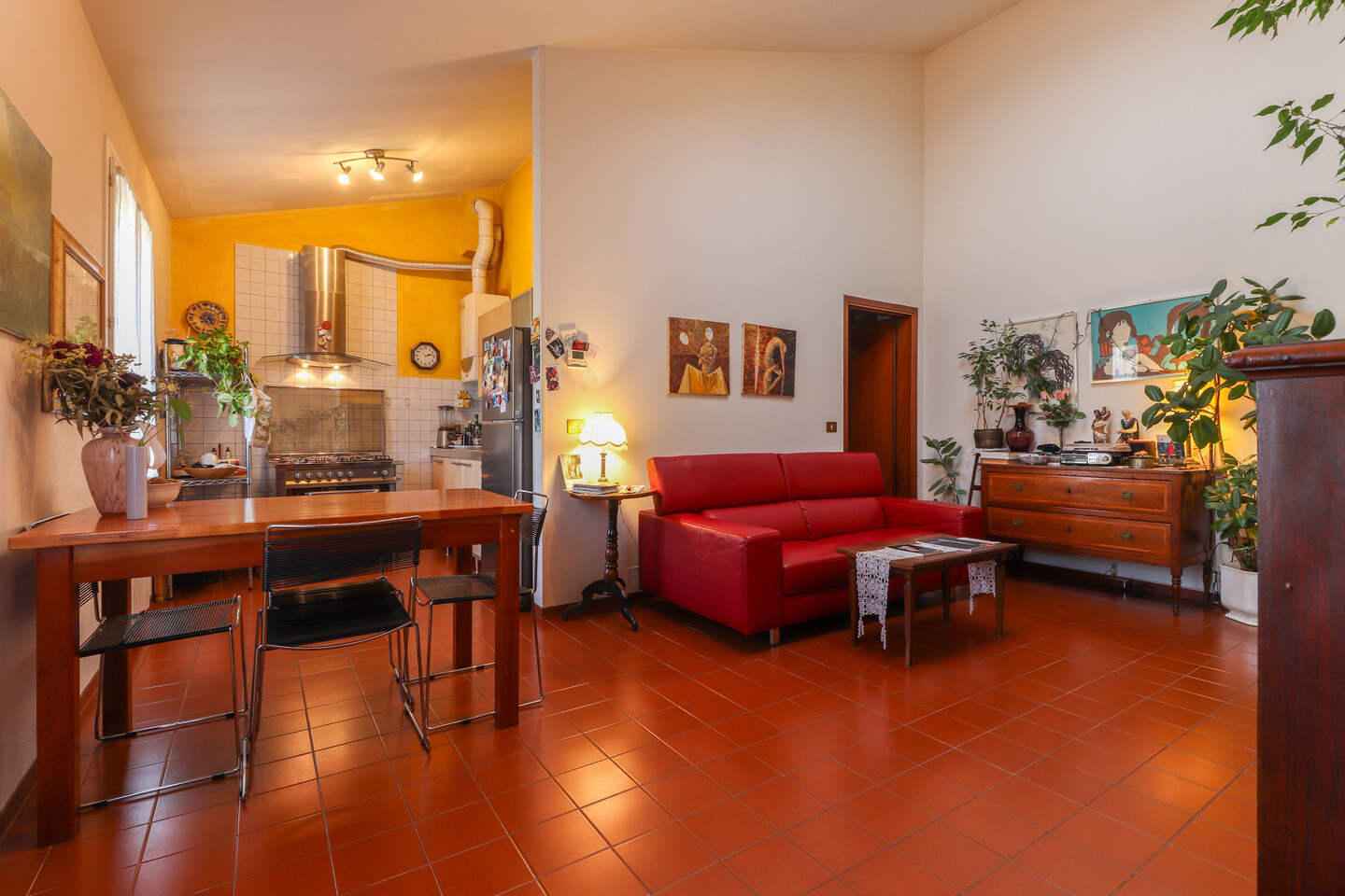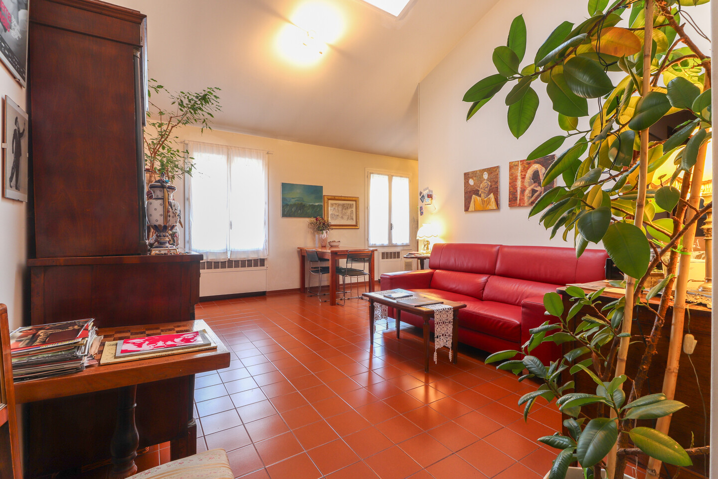 L’ingresso conduce a una zona giorno ampia e luminosissima, valorizzata da finestre e da un lucernaio che amplifica la luce naturale e dona profondità agli ambienti. La zona living accoglie con naturalezza l’angolo cottura, creando uno spazio conviviale, ideale per la vita quotidiana e per ricevere. La zona notte è composta da due camere matrimoniali di generose dimensioni, vere stanze da vivere, non semplici camere da letto. La camera padronale dispone di bagno privato, mentre l’appartamento è completato da un secondo bagno, dotato di vasca, a servizio della casa: una distribuzione che aumenta comfort e funzionalità nella vita quotidiana. Un elemento distintivo dell’abitazione è lo sviluppo verticale degli spazi: le altezze importanti permettono soluzioni creative e personalizzazioni, rendendo la casa dinamica e mai banale.