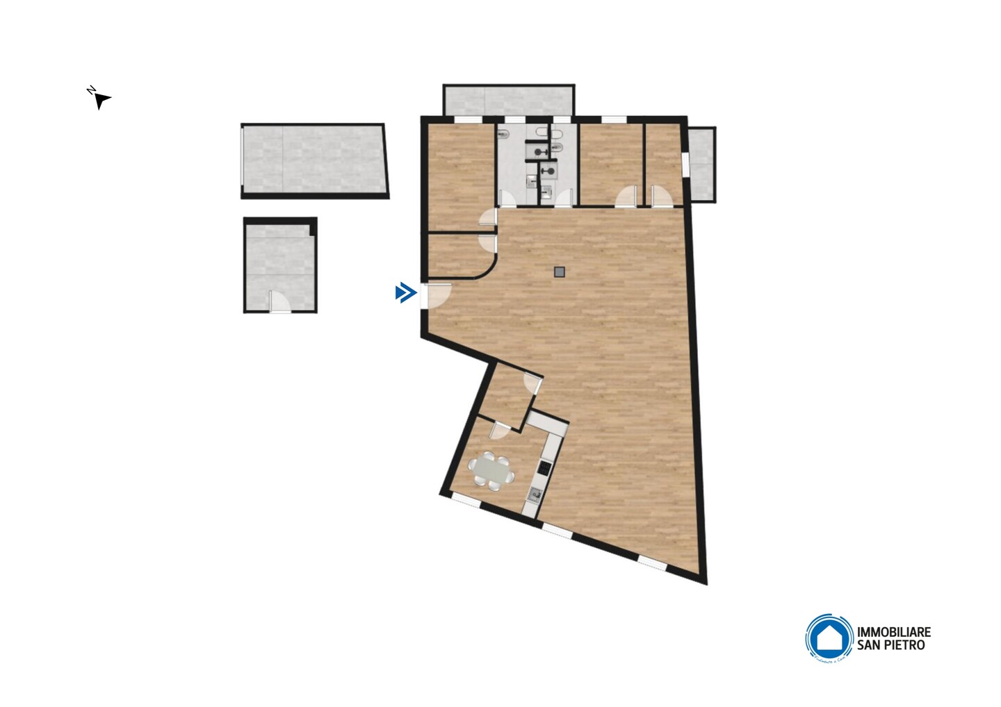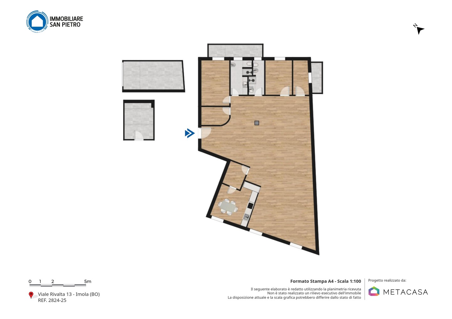 Il locale si sviluppa su un ampio ambiente principale che consente una buona organizzazione degli spazi. Sono presenti locali di servizio separati, ideali come magazzino o locali tecnici, e servizi igienici collocati nella parte interna. L’accesso avviene dal vano scale condominiale, con ingresso diretto al locale al primo piano. La distribuzione interna risulta funzionale e ben adattabile ad attività professionali e commerciali, come dimostrato dall’attuale utilizzo.