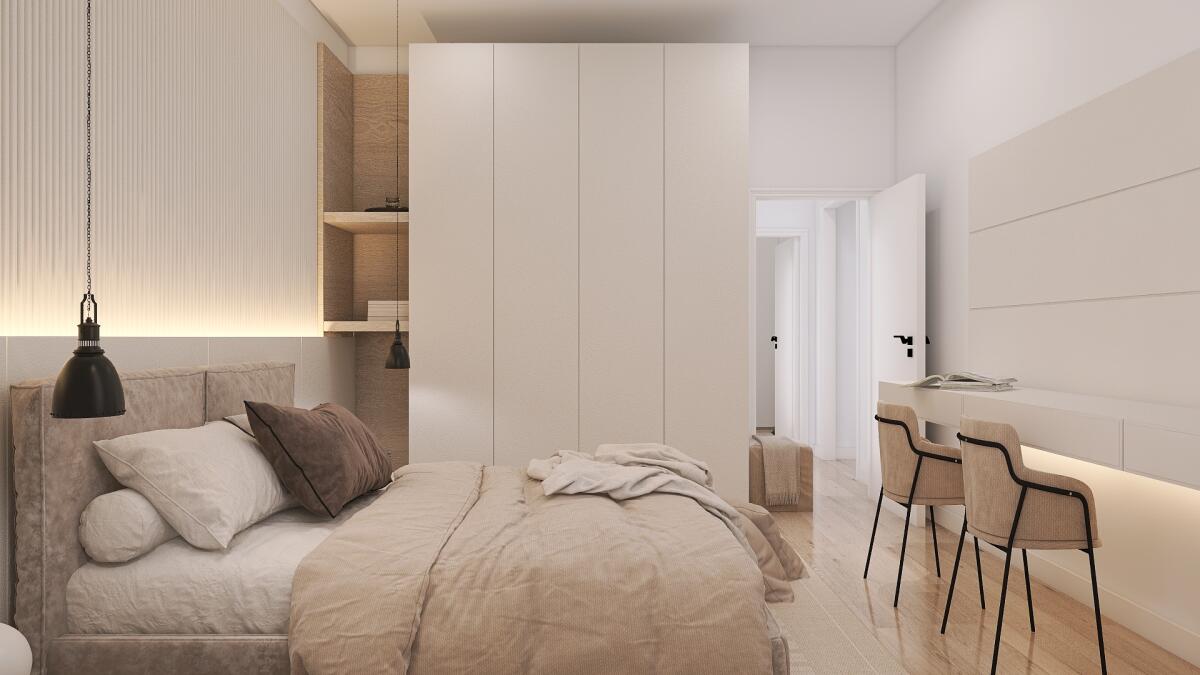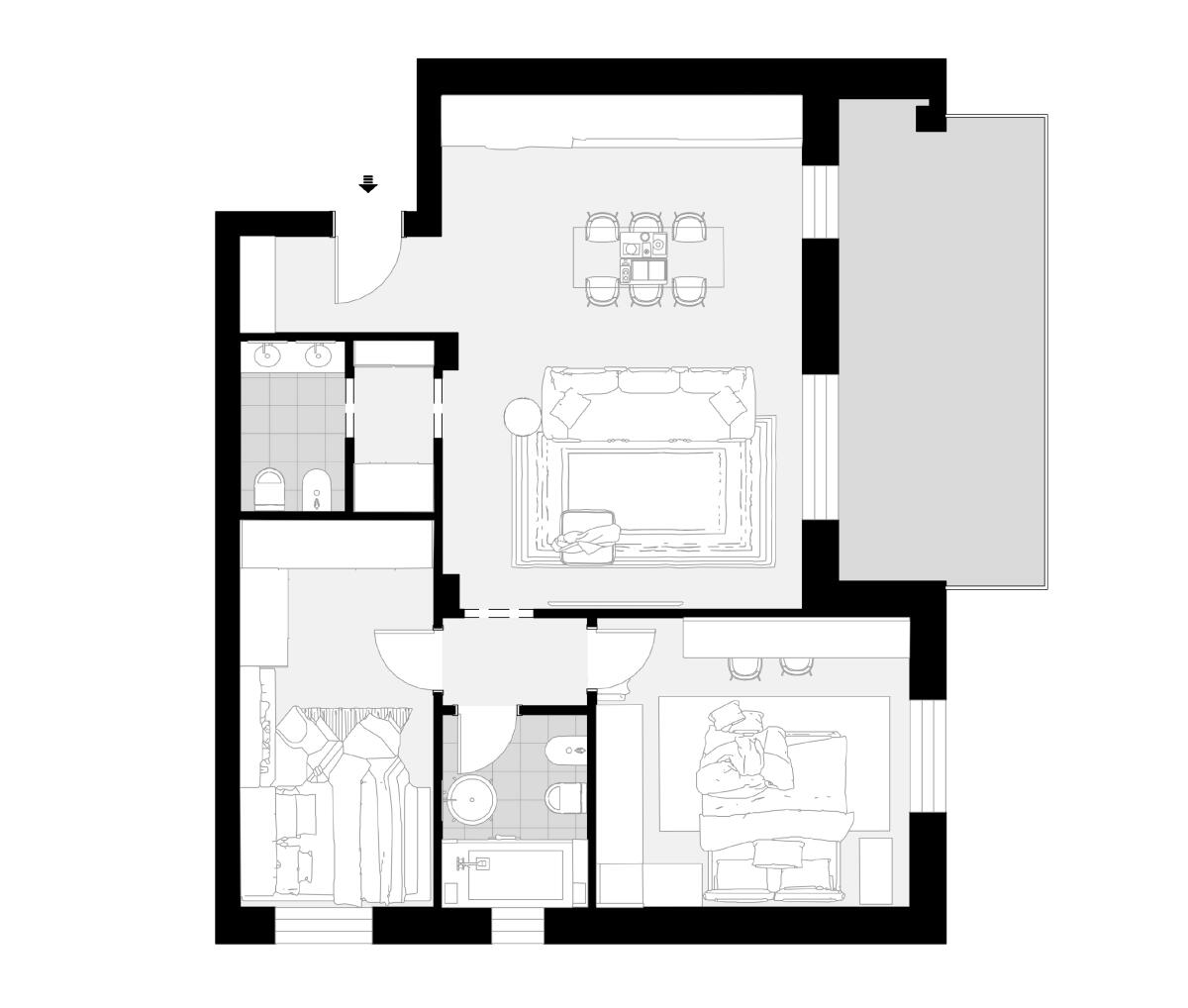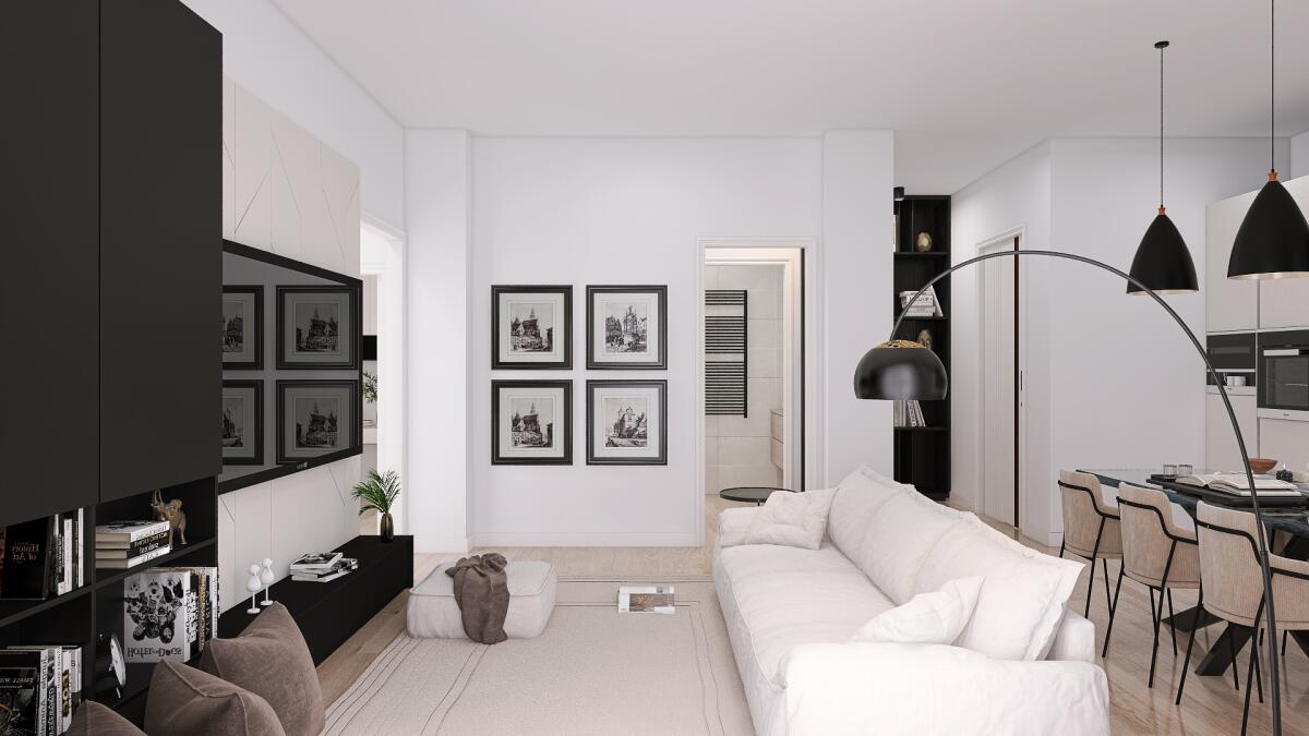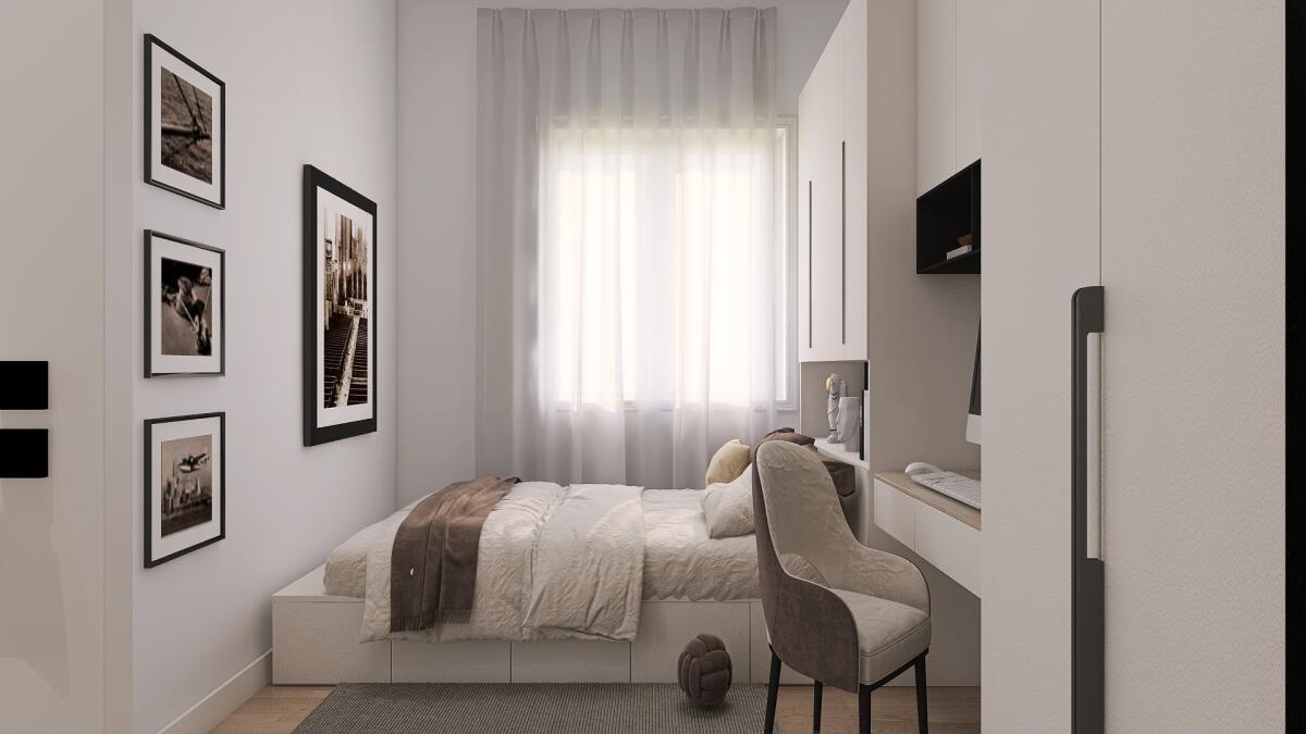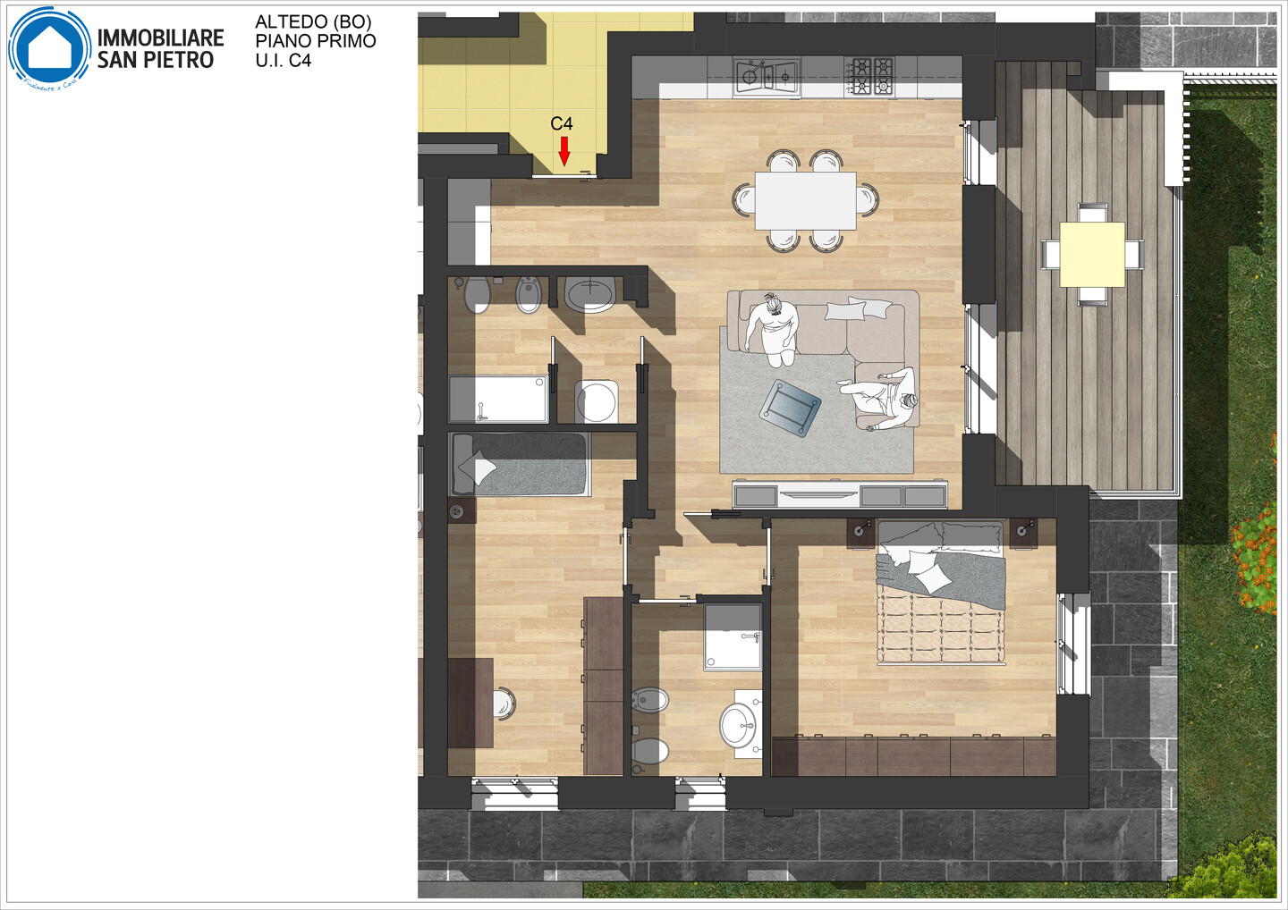 Appartamento trilocale situato al primo piano e così composto: ingresso su disimpegno arredabile, soggiorno con angolo cottura (dai quali è possibile accedere direttamente al terrazzo), antibagno e bagno; il disimpegno notte divide una camera matrimoniale, una doppia ed il secondo bagno. Completa la proprietà un’autorimessa.
