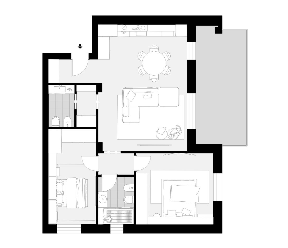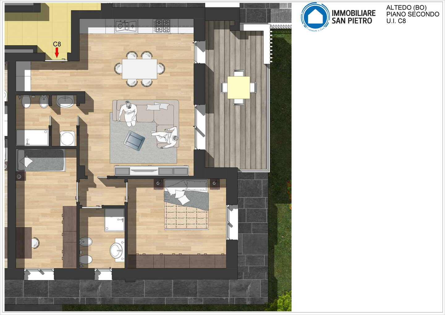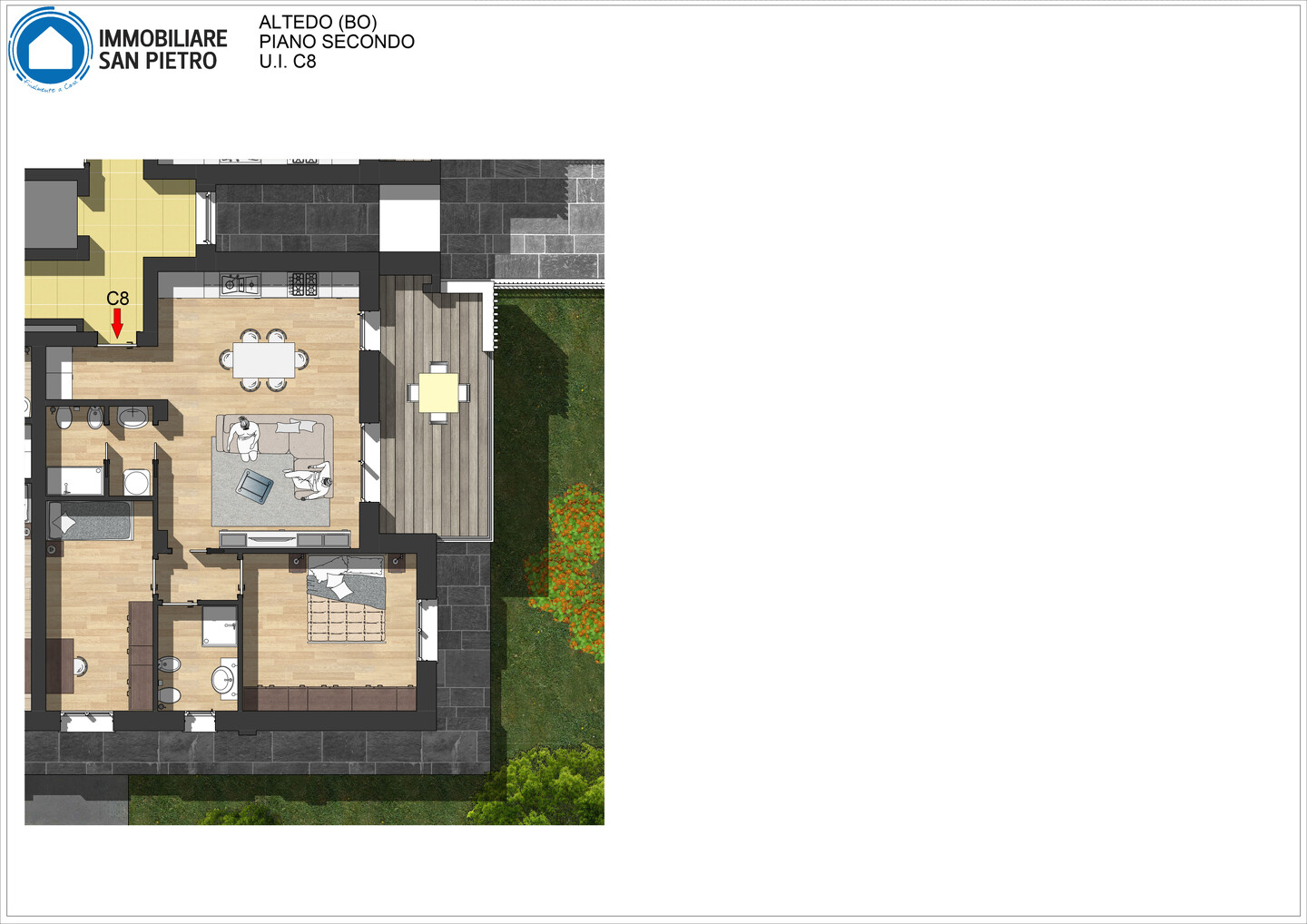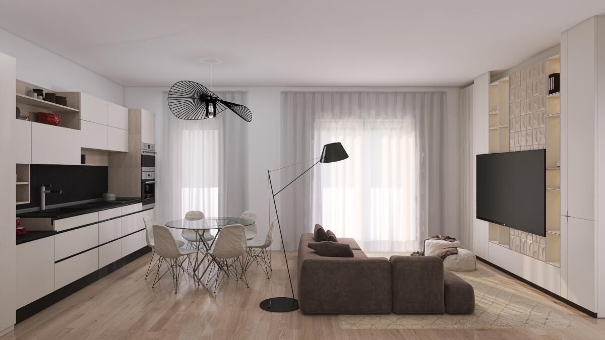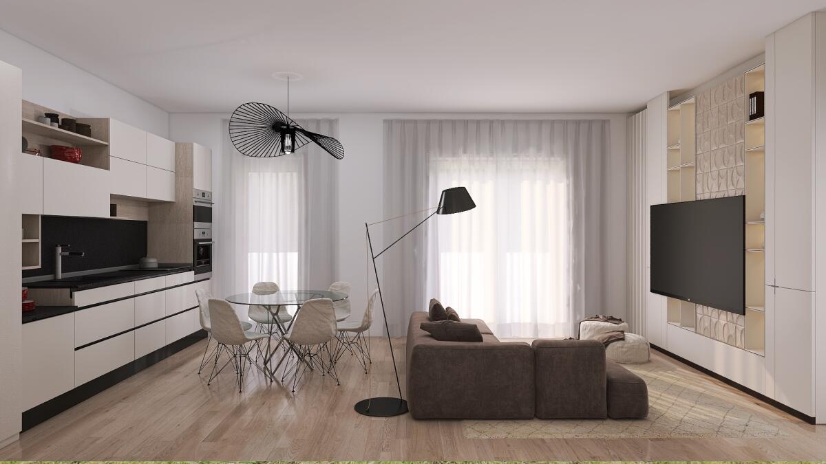 Appartamento trilocale situato al secondo piano e così composto: ingresso su disimpegno arredabile, soggiorno con angolo cottura (dai quali è possibile accedere direttamente al terrazzo), antibagno e bagno; il disimpegno notte divide una camera matrimoniale, una singola ed il secondo bagno. Completa la proprietà un’autorimessa. La costruzione, in classe energetica A4, prevede finiture curate come pavimenti in gres porcellanato effetto legno, rivestimenti in ceramica e gres nei bagni e in cucina, infissi in PVC con vetrocamera e oscuranti esterni in PVC o alluminio, oltre a zanzariere già installate. La porta d’ingresso sarà blindata e la basculante del garage predisposta per l’automazione. Il comfort abitativo è garantito da riscaldamento a pavimento con pompa di calore, termo arredi elettrici nei bagni, predisposizione per raffrescamento a split e impianto fotovoltaico con potenza conforme alla normativa vigente.