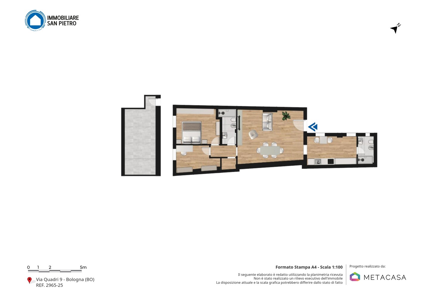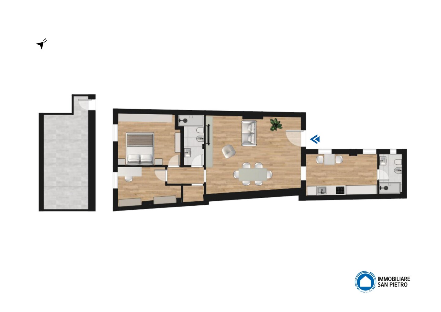L’immobile è così composto: ampio soggiorno, cucina moderna abitabile, due bagni, comodo ripostiglio, e zona notte separata che garantisce privacy e tranquillità. La zona notte comprende una camera matrimoniale e una camera singola.