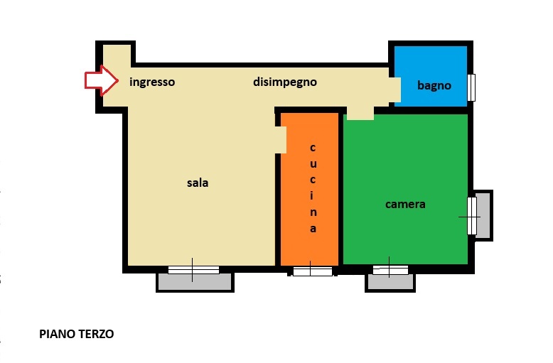 L’appartamento, situato al terzo piano è composto da ingresso su sala, cucina semi-abitabile, camera matrimoniale, disimpegno, bagno finestrato e tre piccoli balconcini.