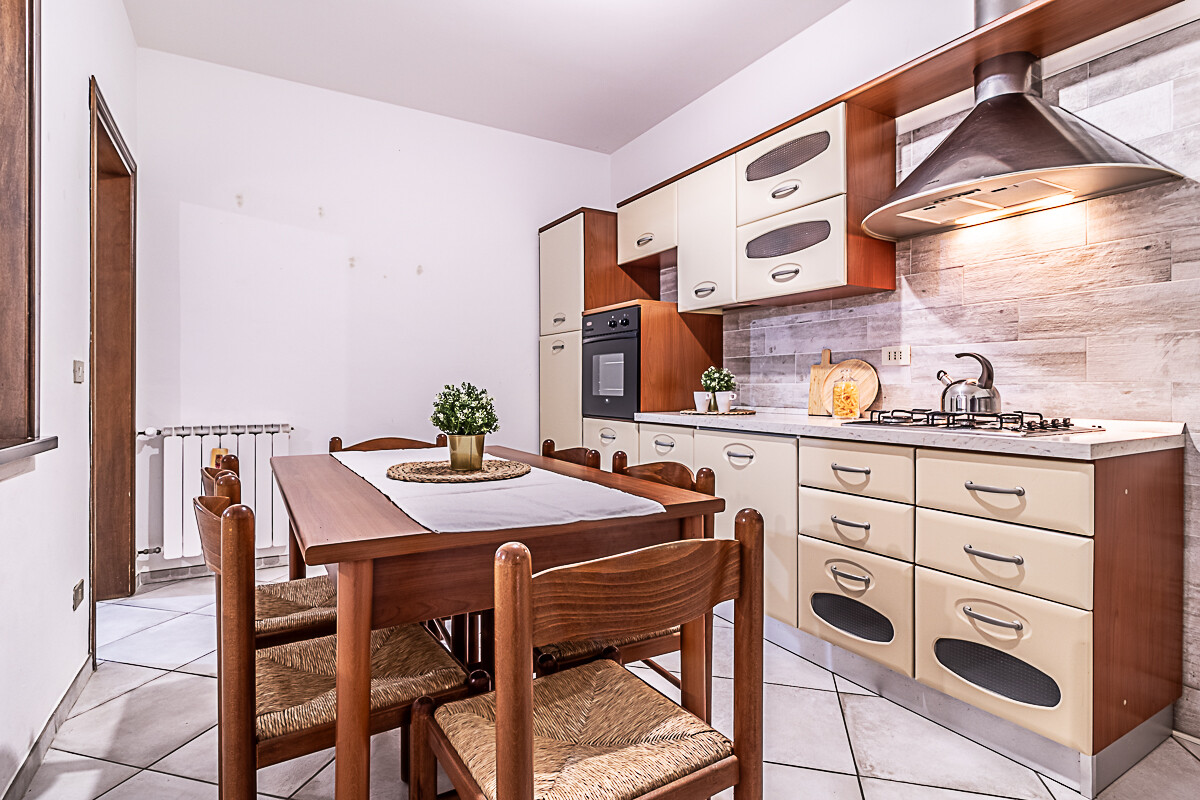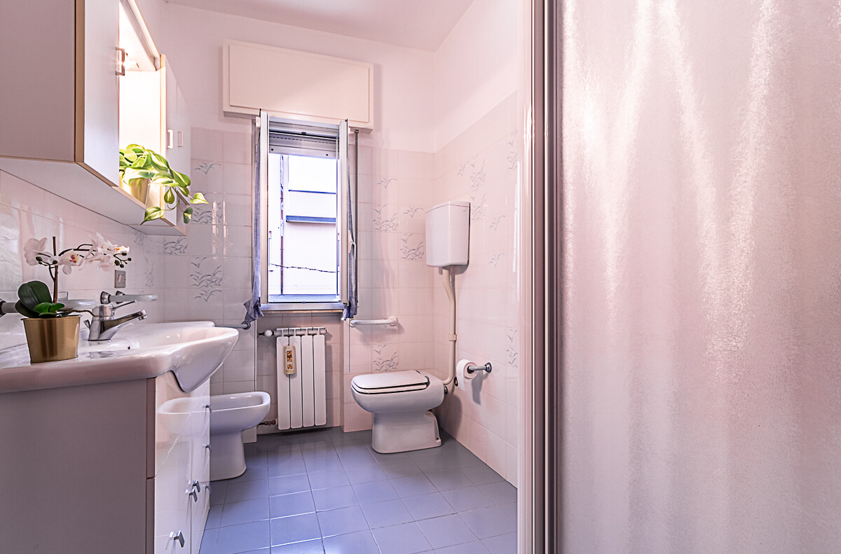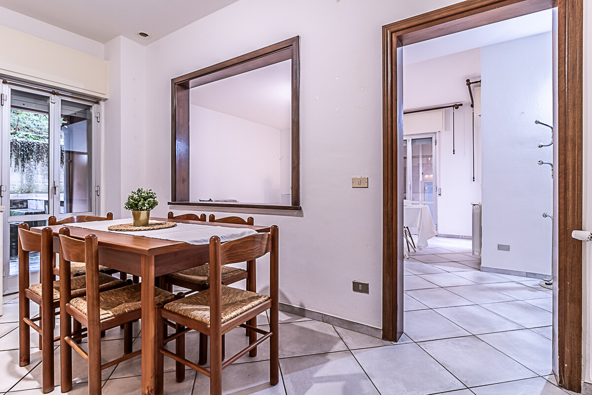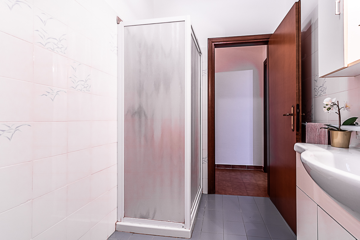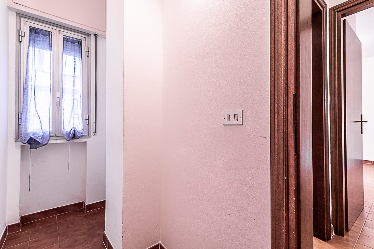 L’appartamento è composto dall’ingresso che conduce alla zona giorno composta da una sala luminosa e da una cucina abitabile, entrambe con affacci verso la corte esterna condominiale. Un disimpegno organizza la zona notte, dove sono presenti una camera singola, una camera doppia e un piccolo stanzino finestrato, ideale come studio, ripostiglio o spazio di servizio. Sull’altro lato del disimpegno si collocano la camera matrimoniale e il bagno finestrato con doccia, garantendo una buona separazione tra gli ambienti.